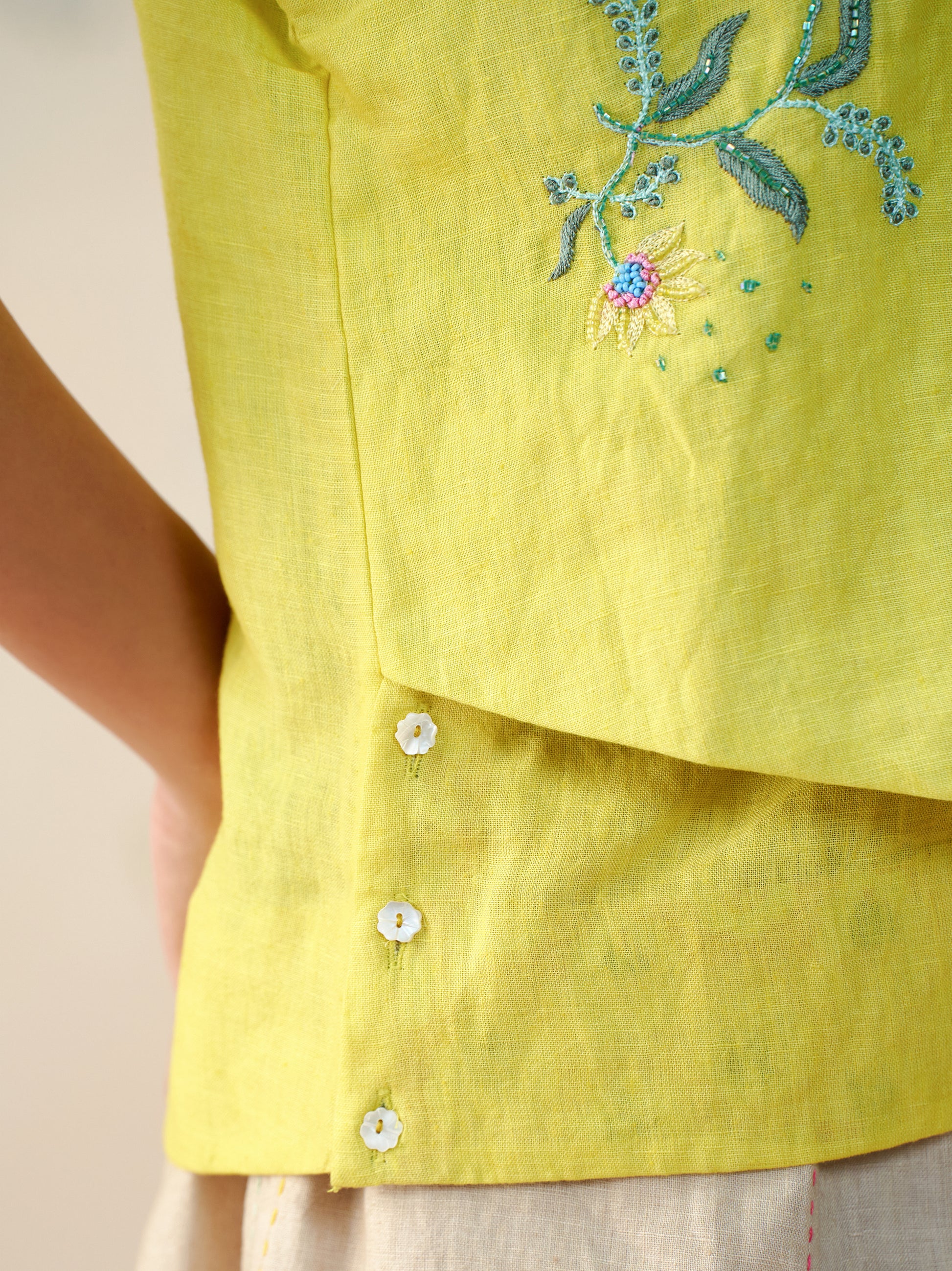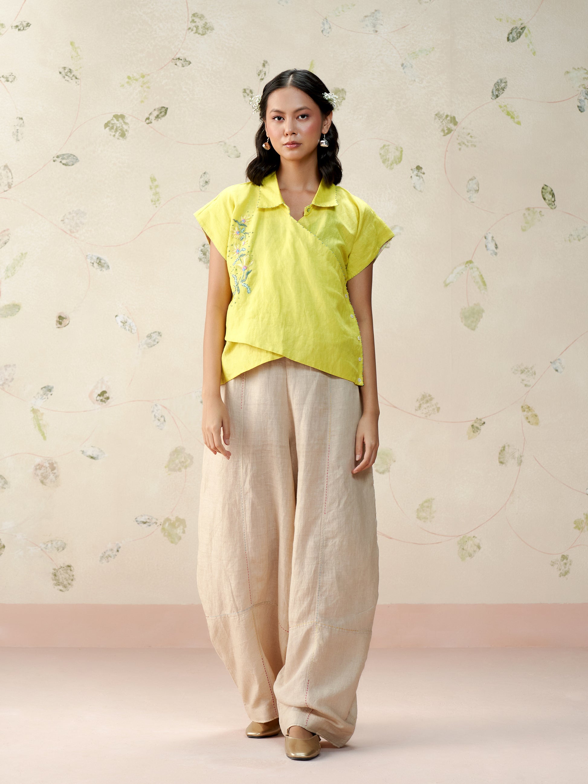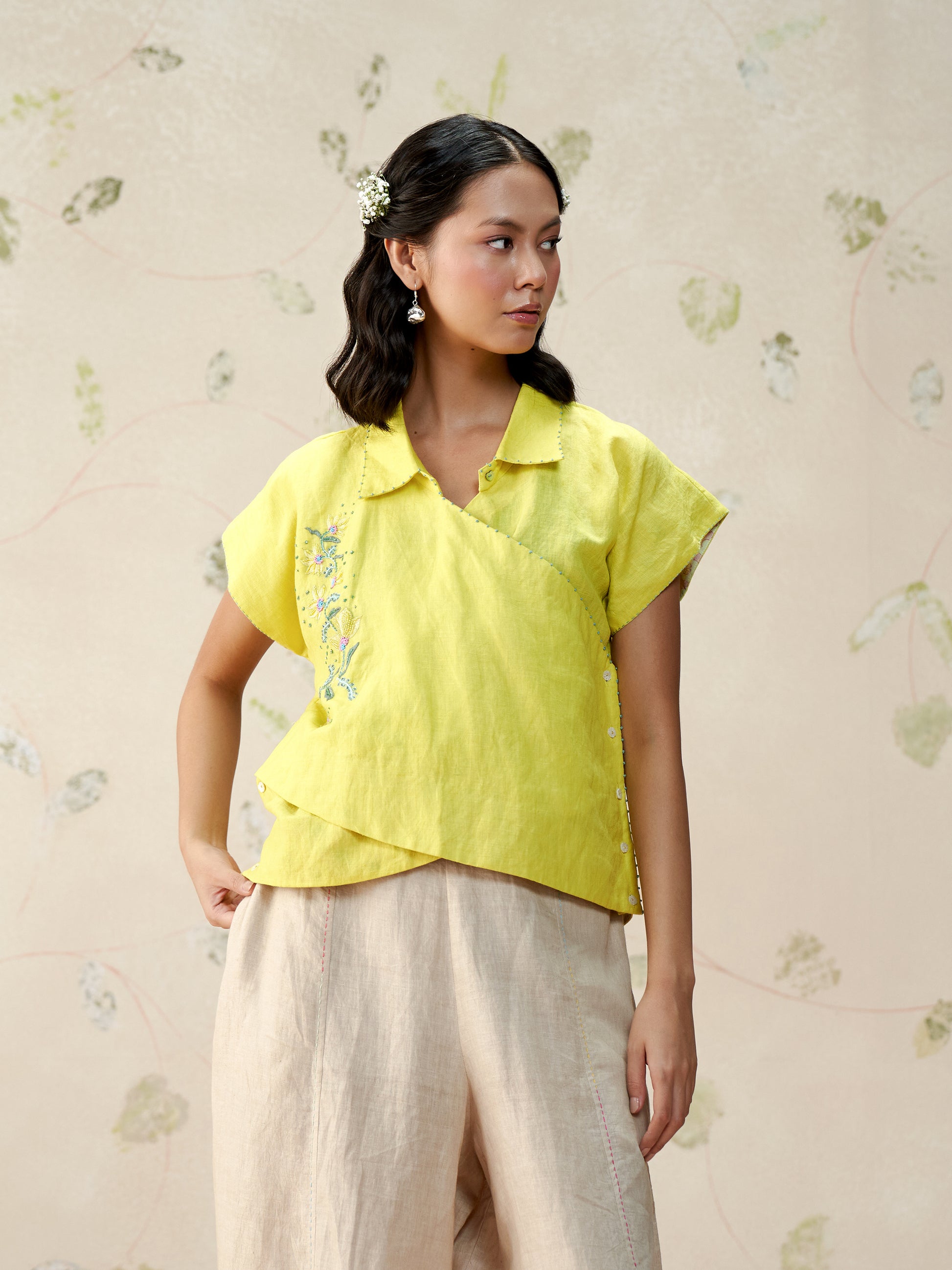 A refreshing wrap-style top crafted from 100% pure linen. Delicately hand-embroidered with pastel floral motifs, this piece features a flattering asymmetrical overlap and side button details for added ease.