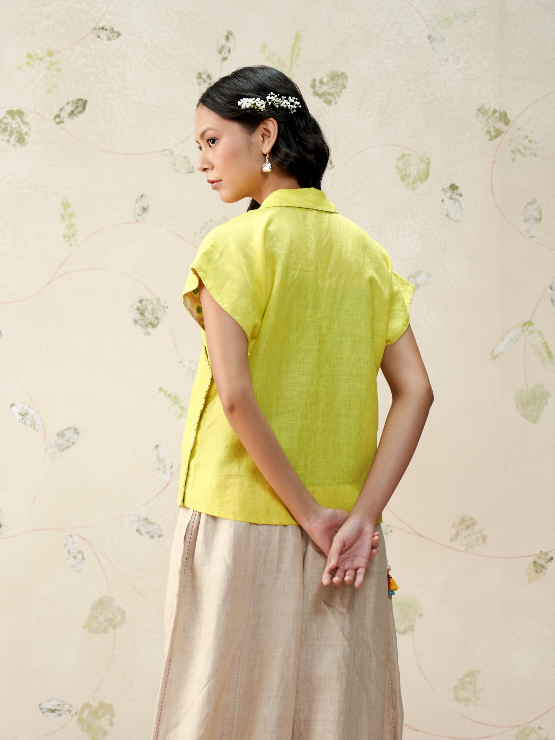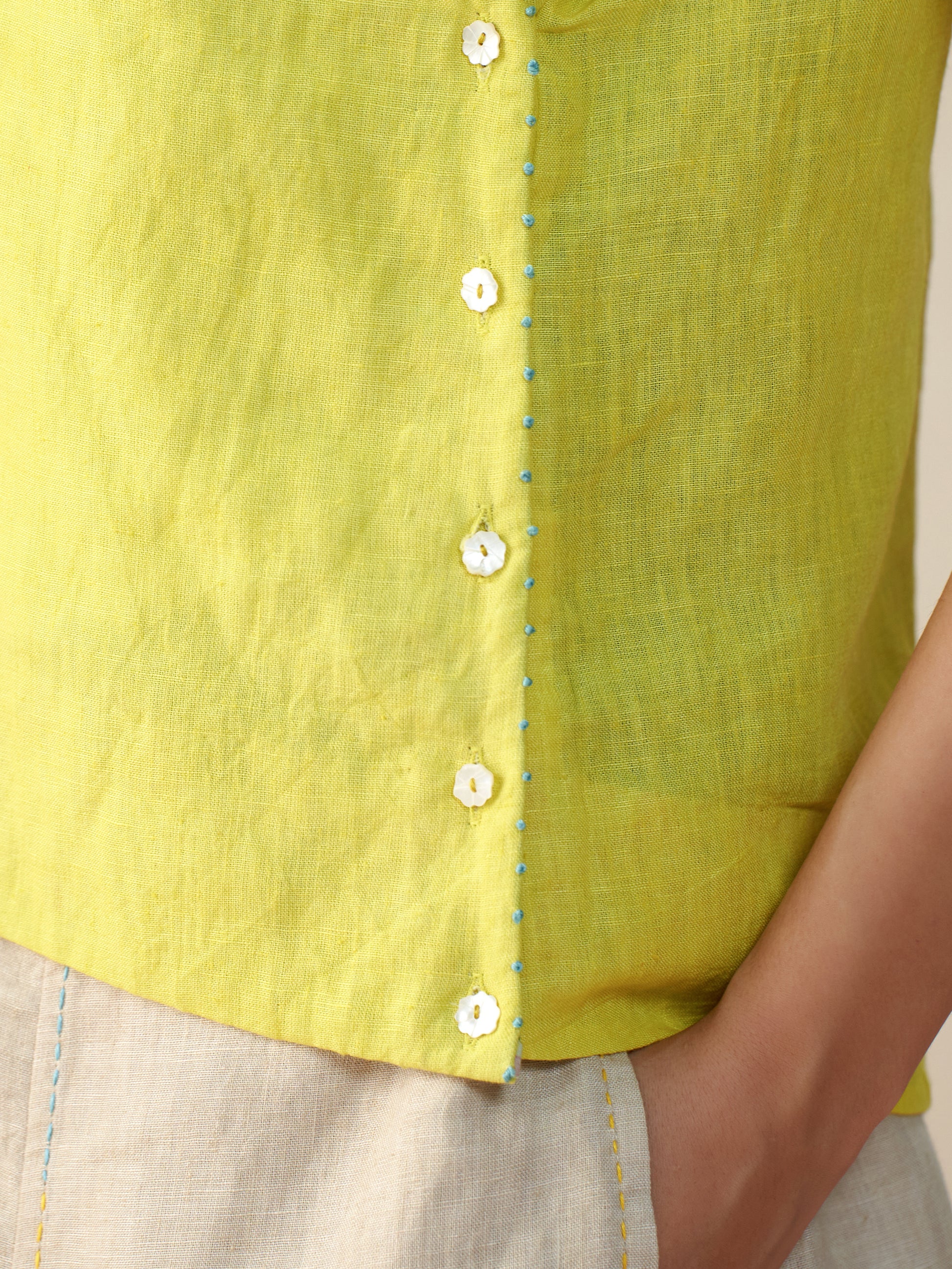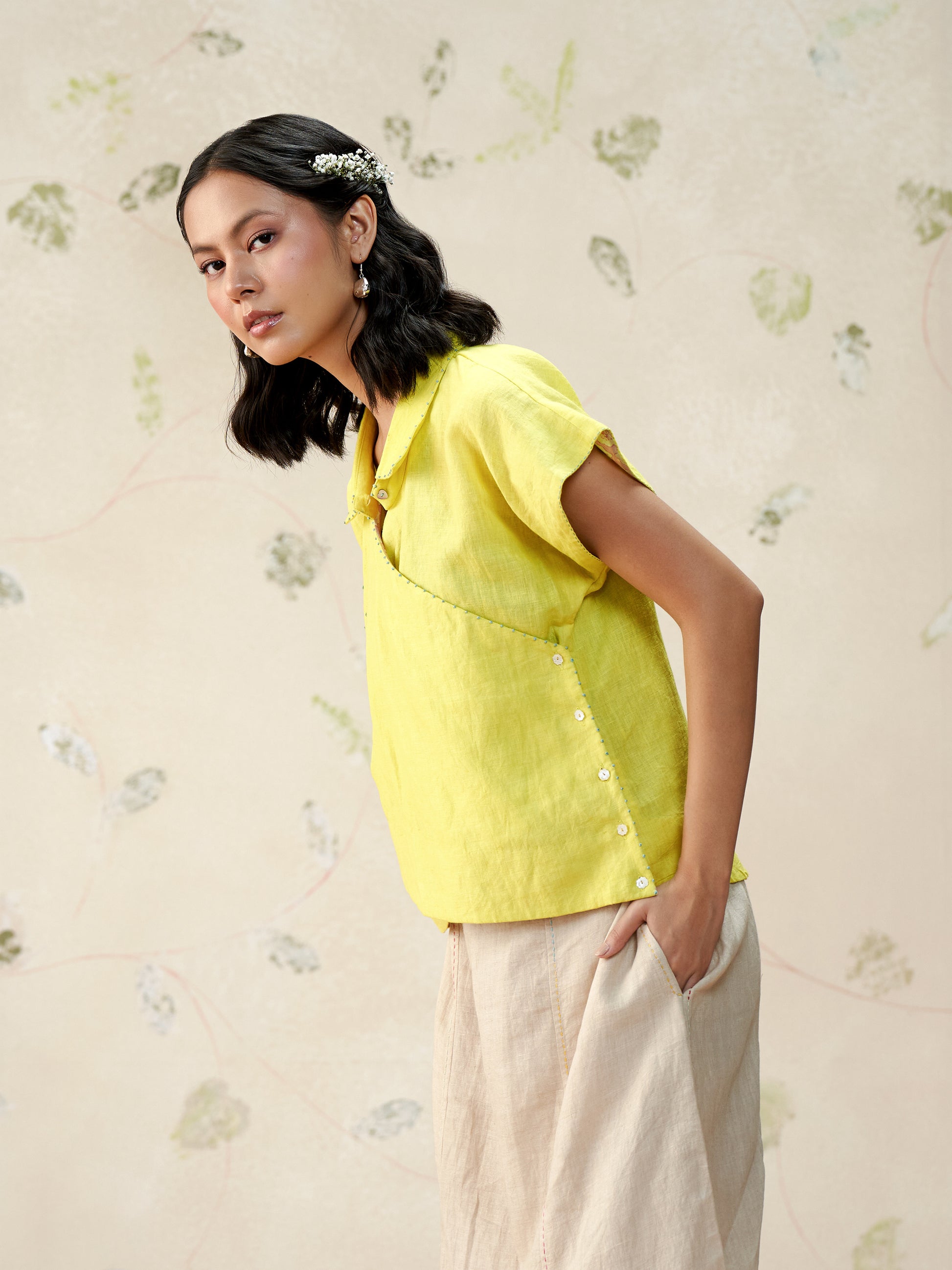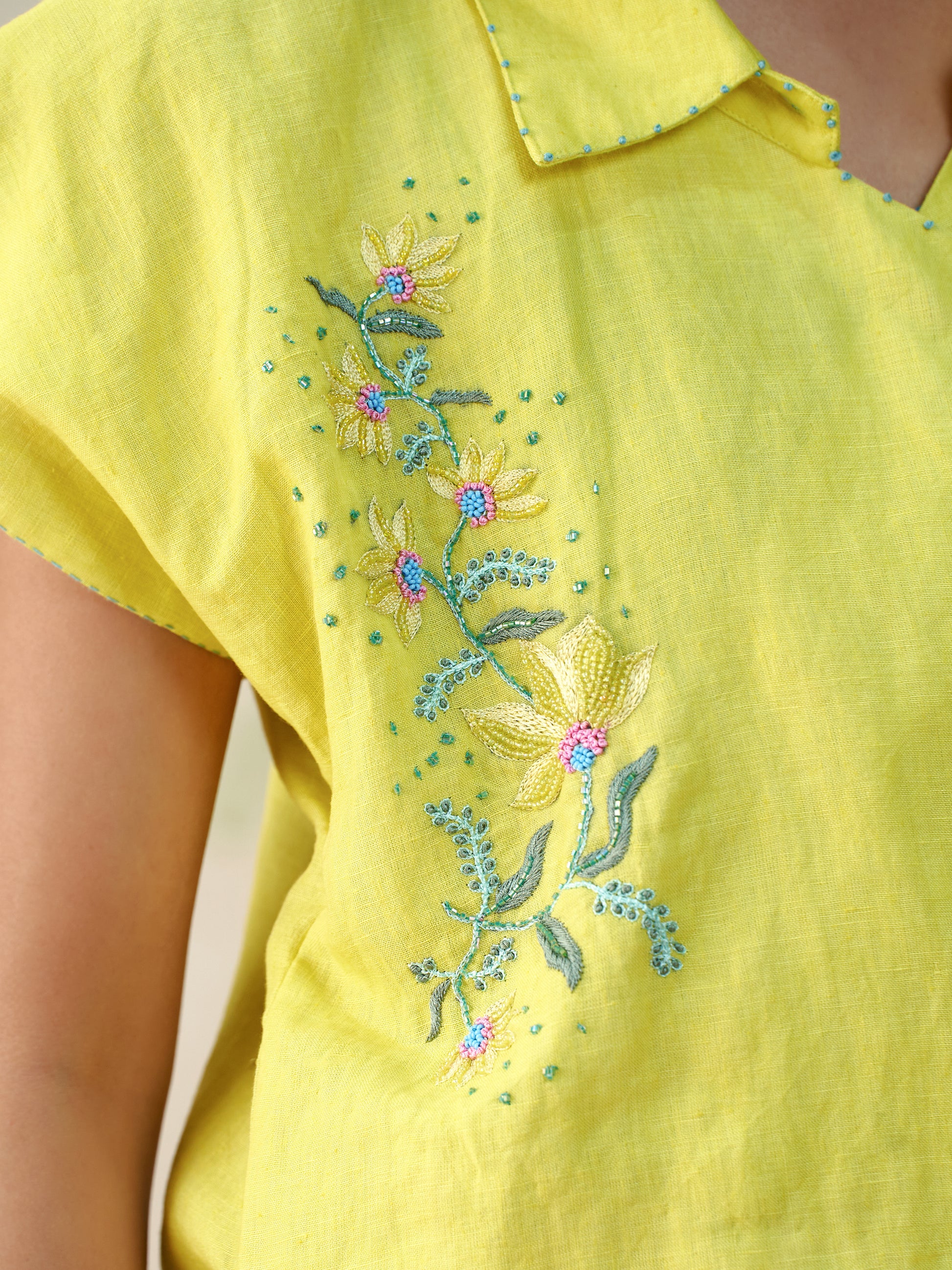 A refreshing wrap-style top crafted from 100% pure linen. Delicately hand-embroidered with pastel floral motifs, this piece features a flattering asymmetrical overlap and side button details for added ease.