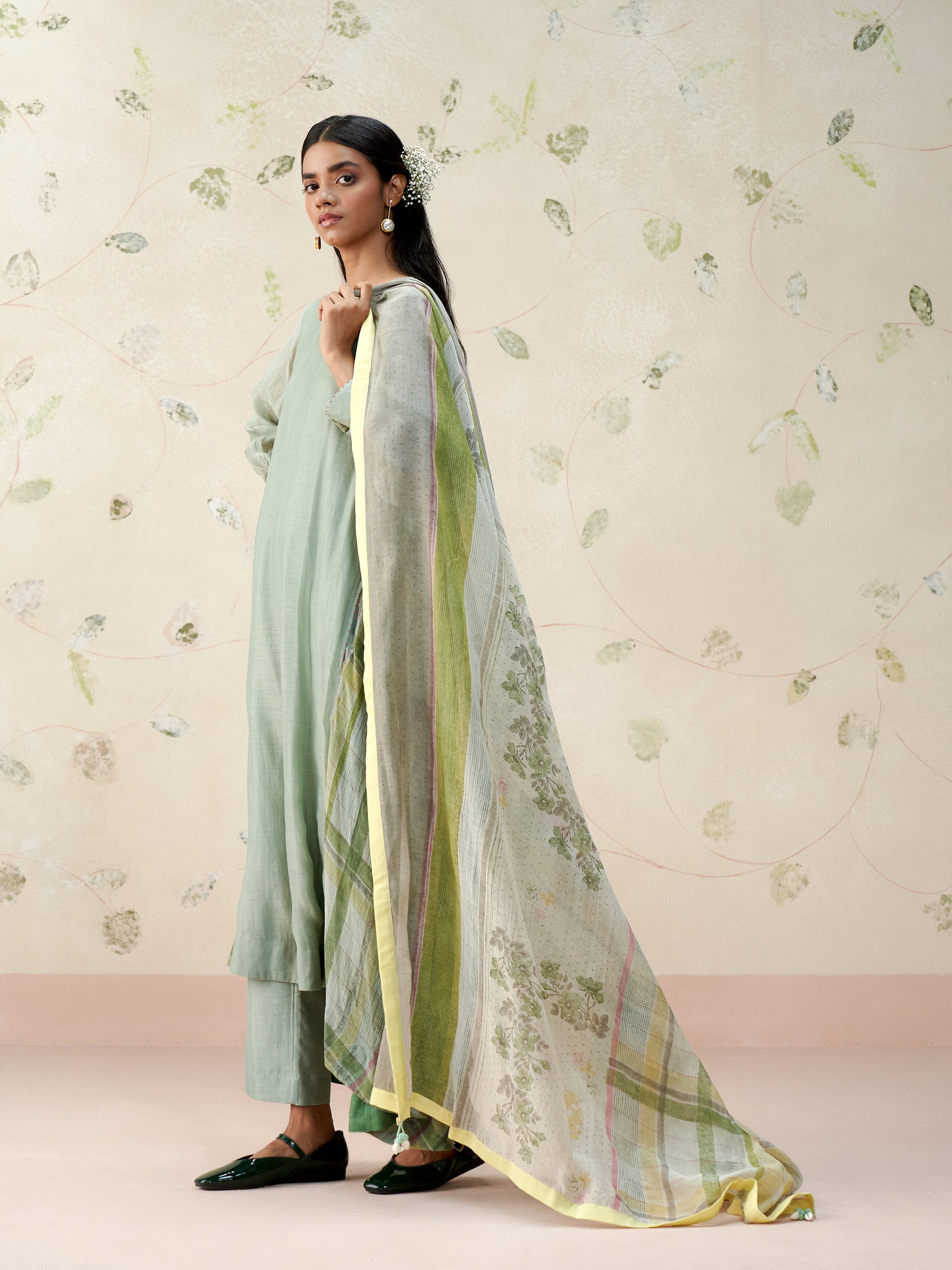 A lightweight mul chanderi dupatta featuring hand block printed checks and floral motifs. Accented with a fresh contrast border and finished with delicate hand made tassels.