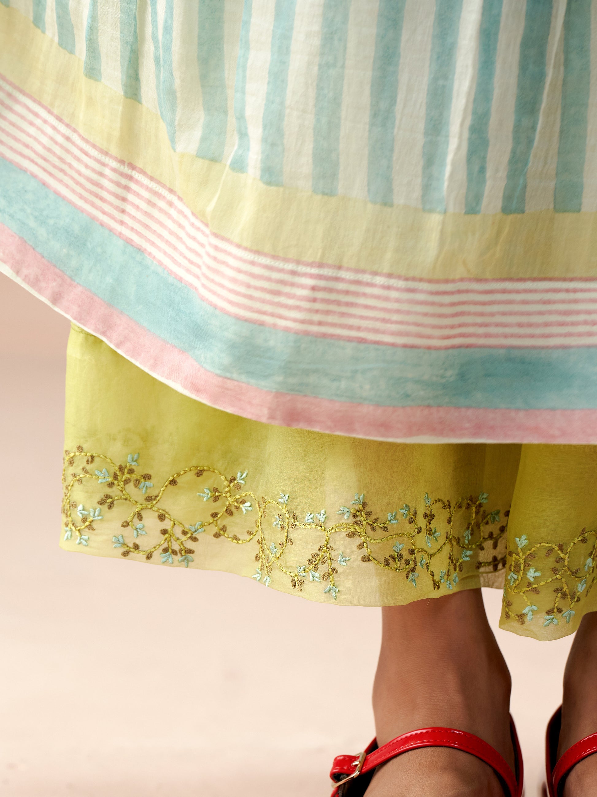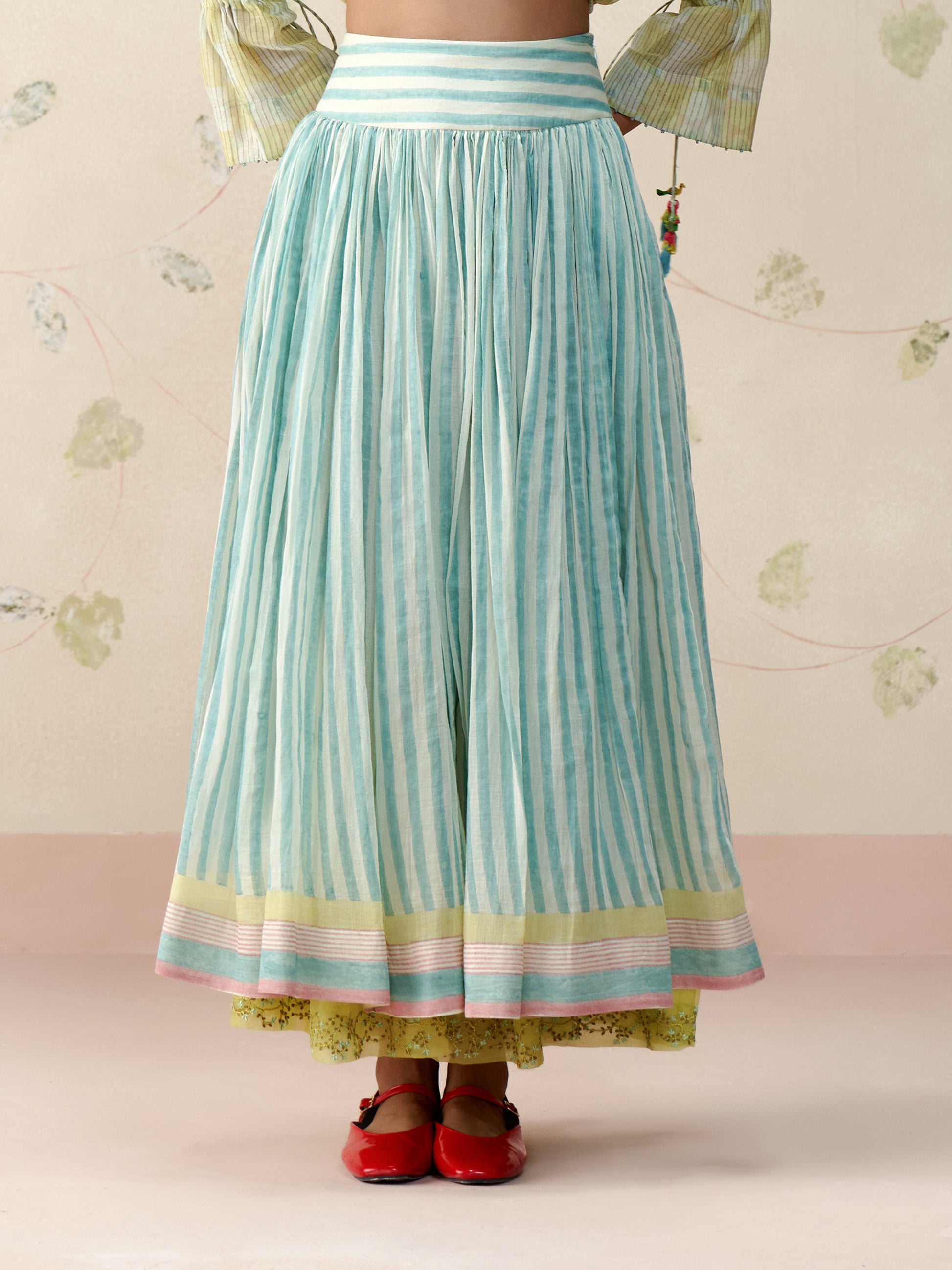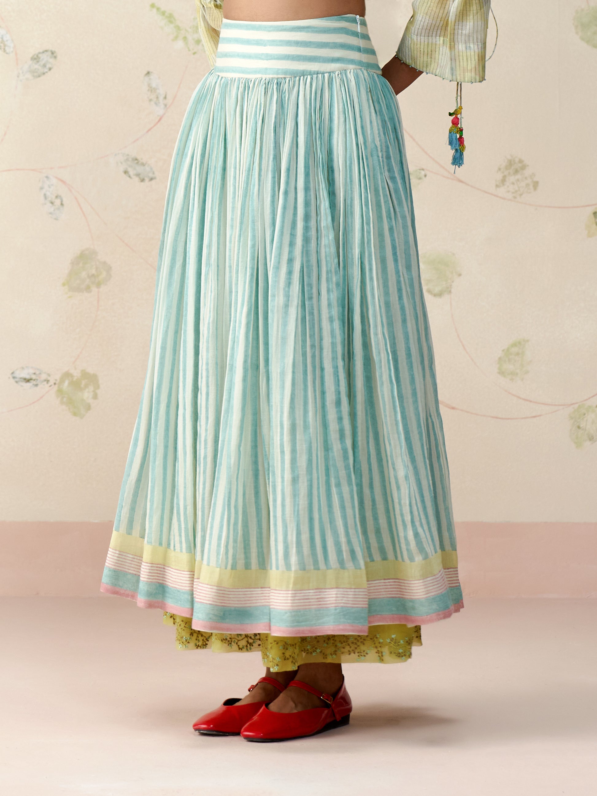 Made from handwoven Chanderi, this flared skirt features vertical hand block printed stripes and a colorful contrast border. Layered with subtle embroidered organza trim in the hem for added texture and depth.