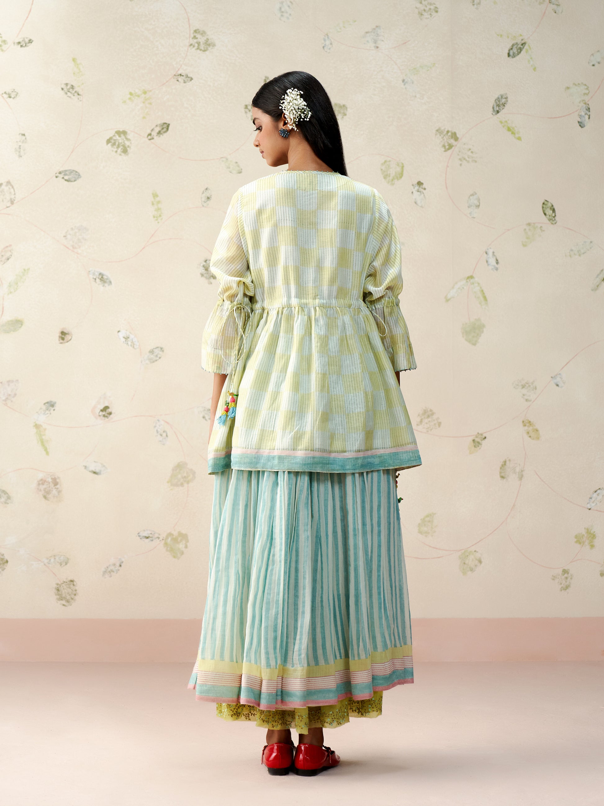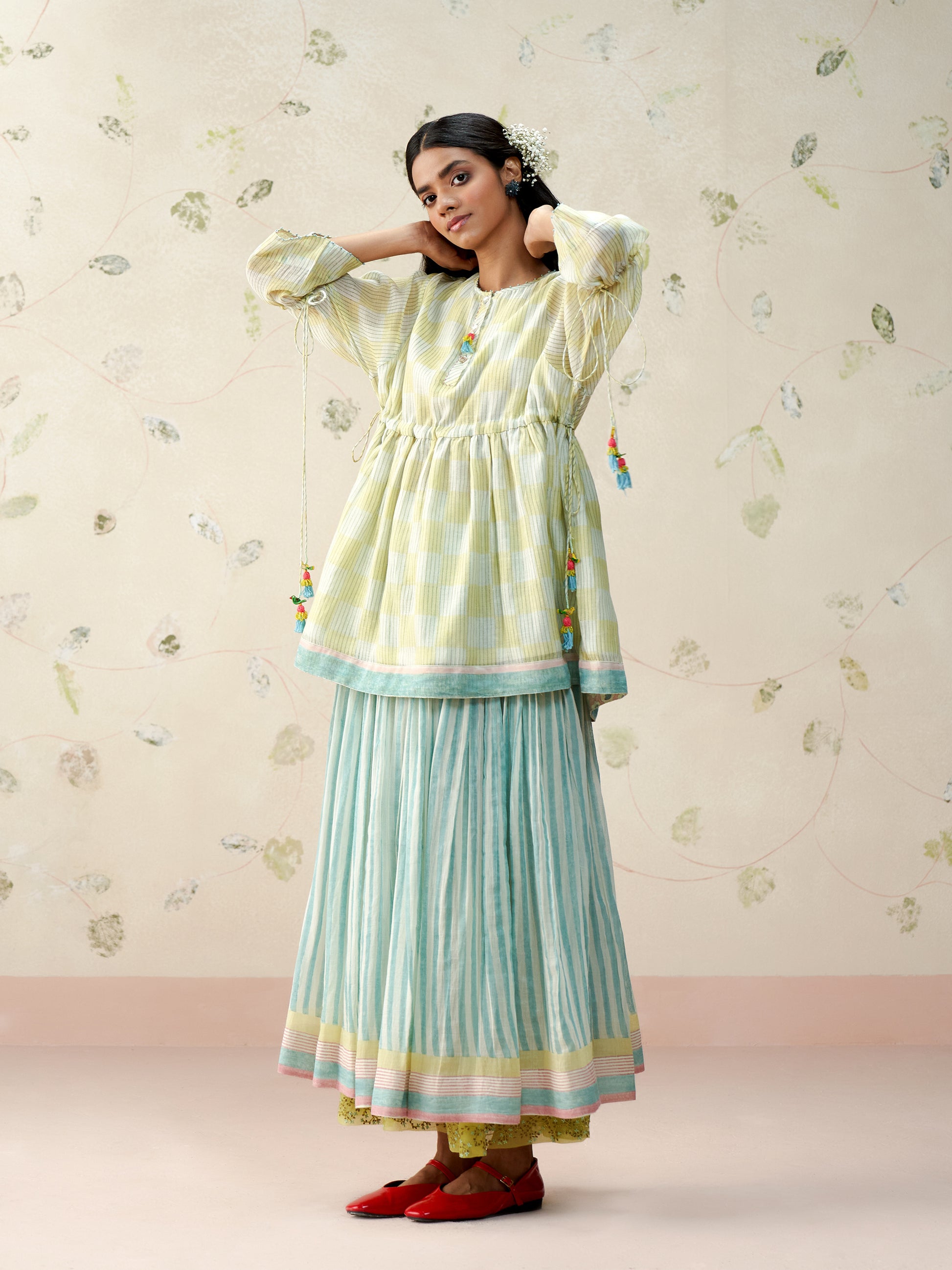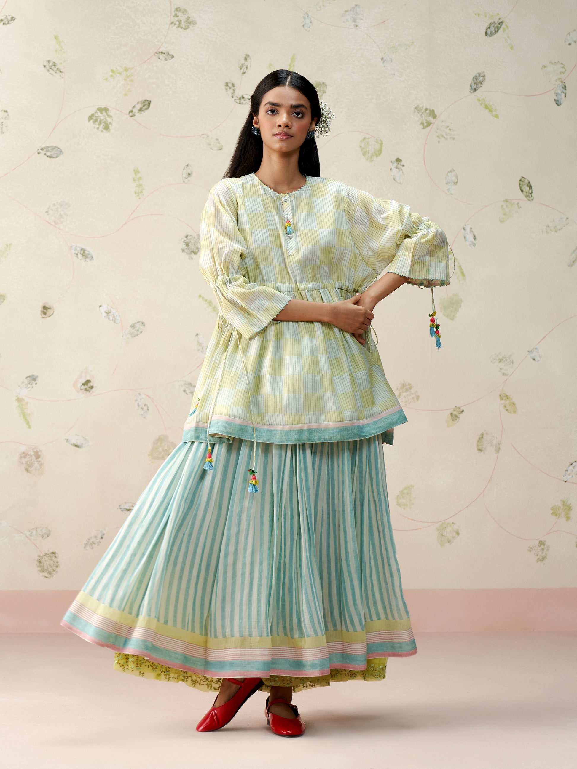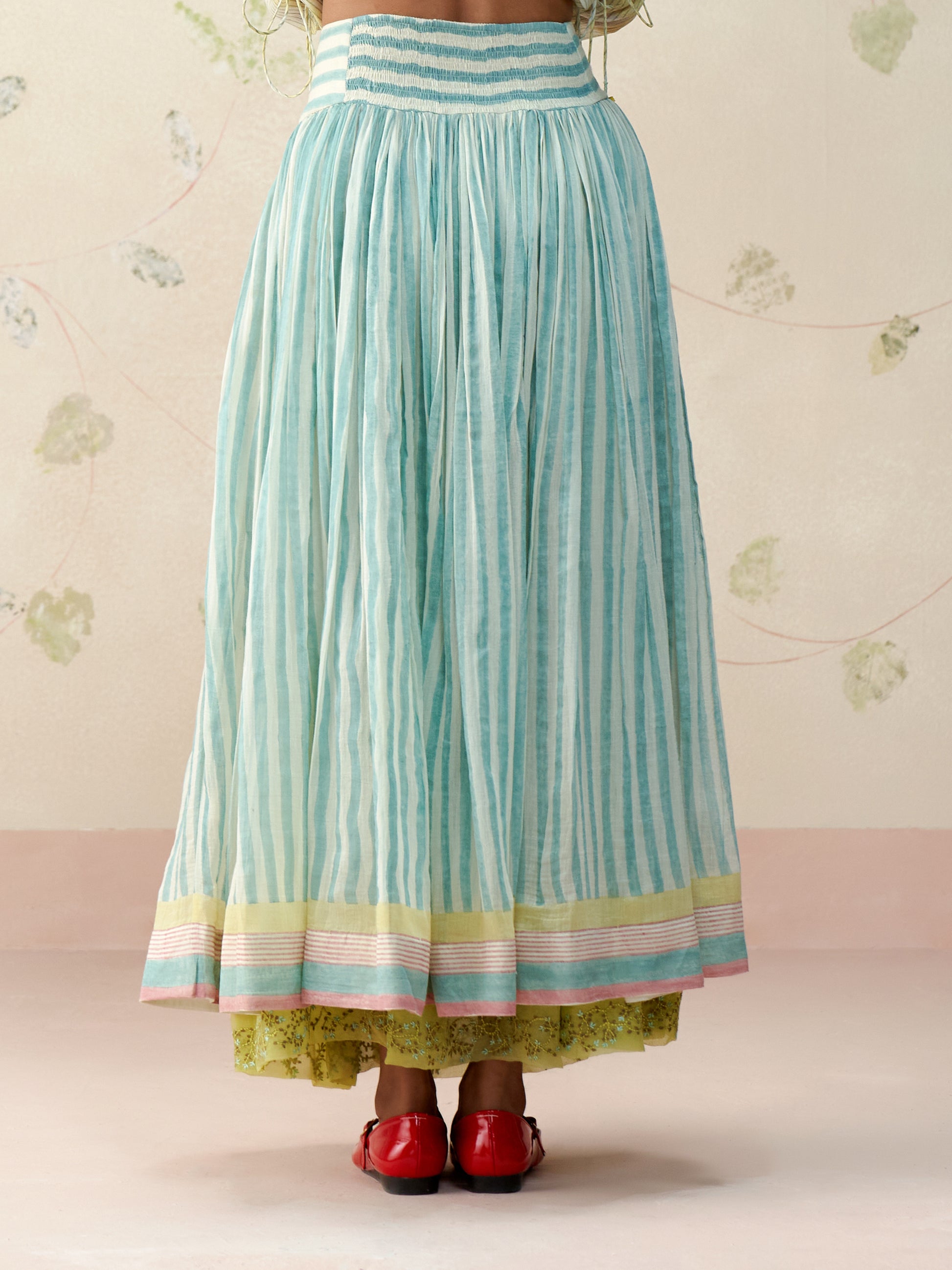 Made from handwoven Chanderi, this flared skirt features vertical hand block printed stripes and a colorful contrast border. Layered with subtle embroidered organza trim in the hem for added texture and depth.