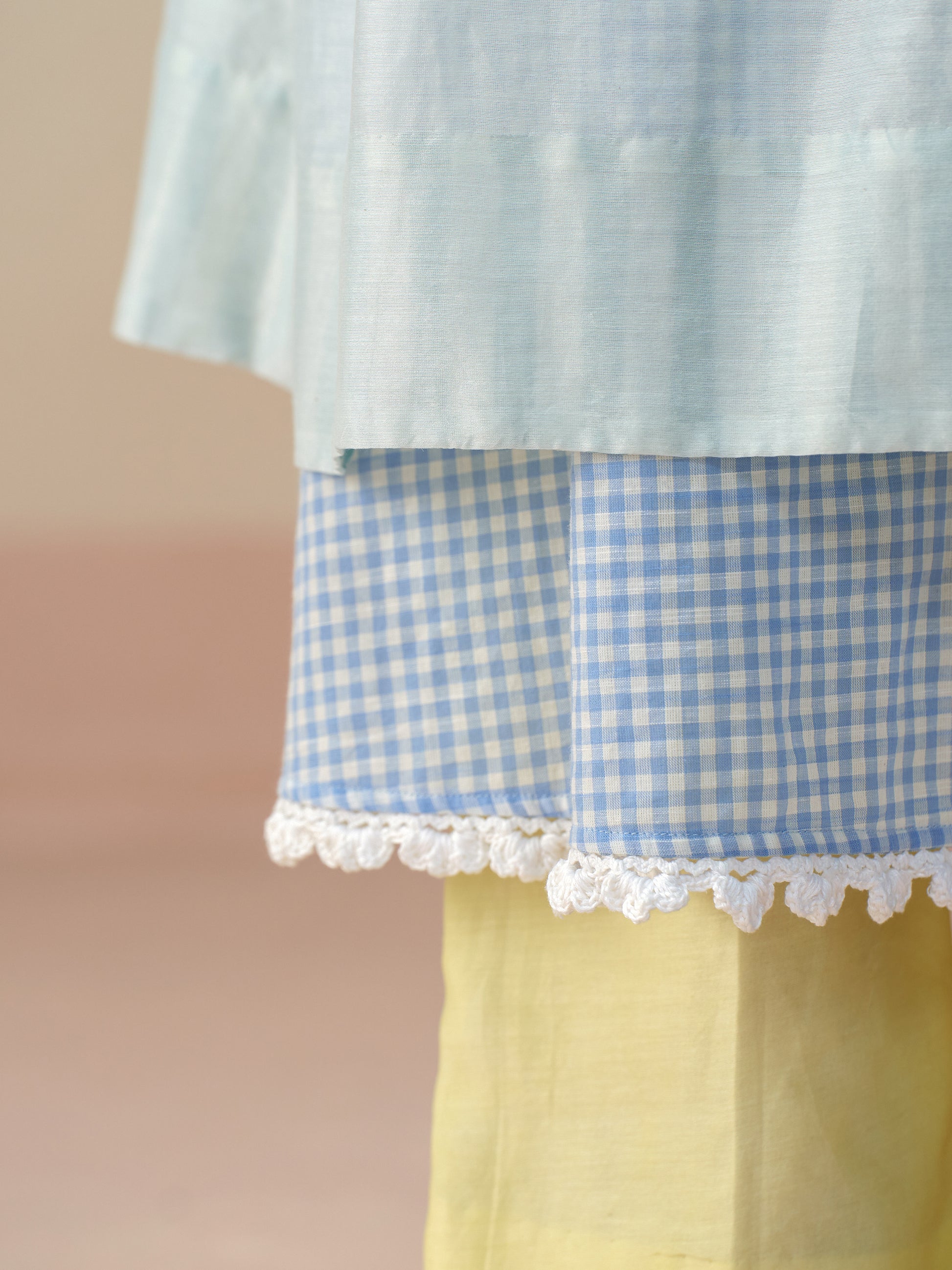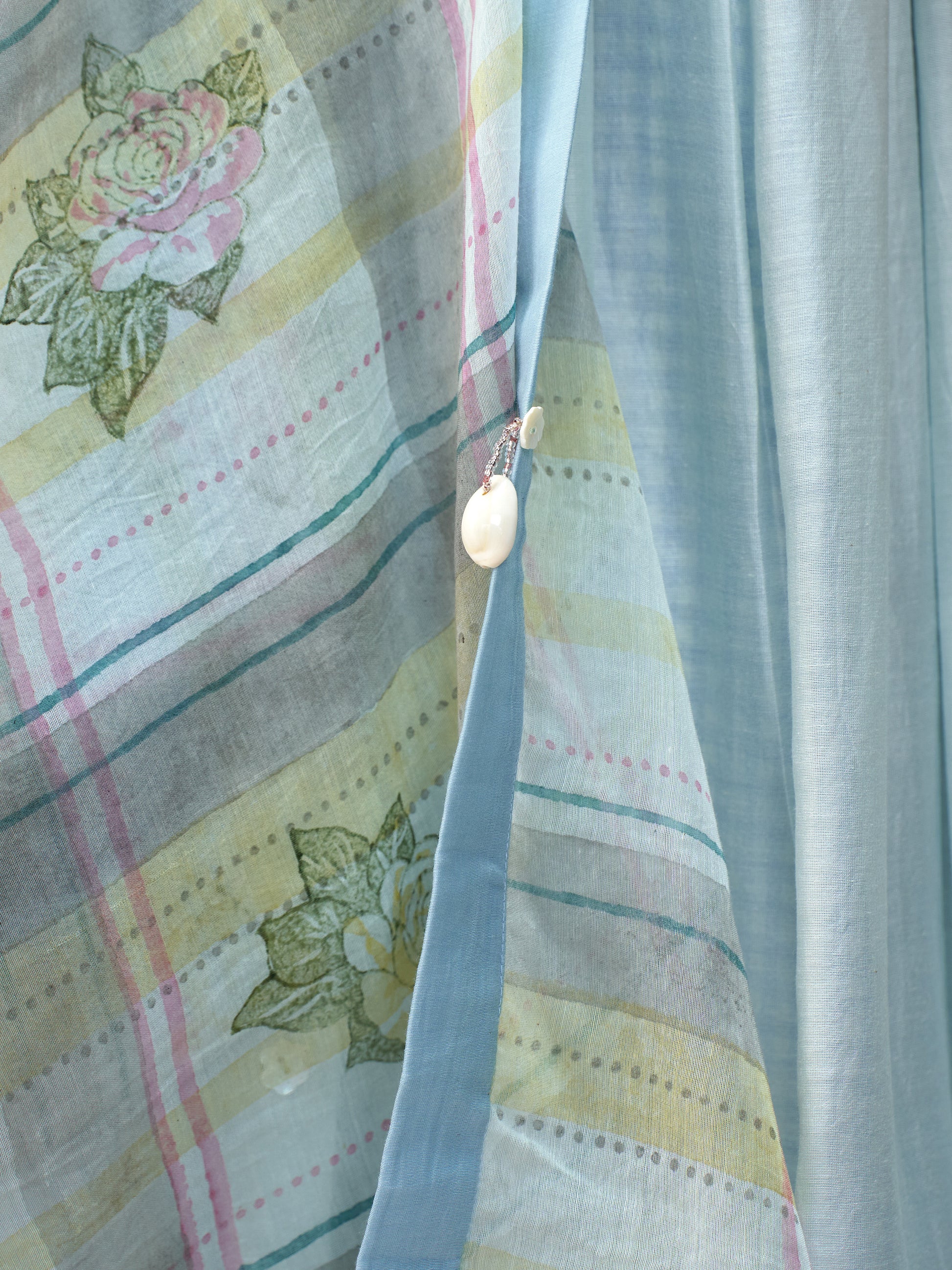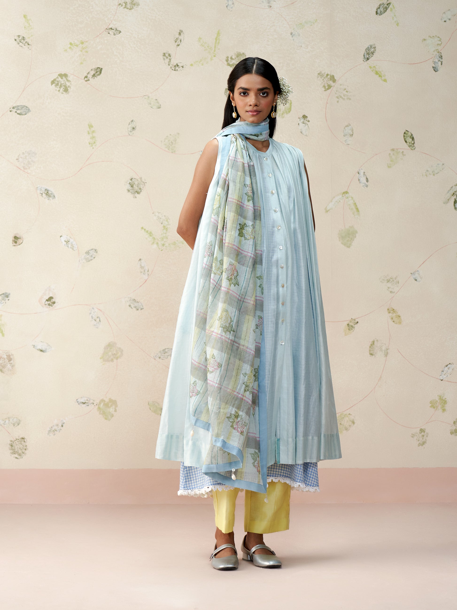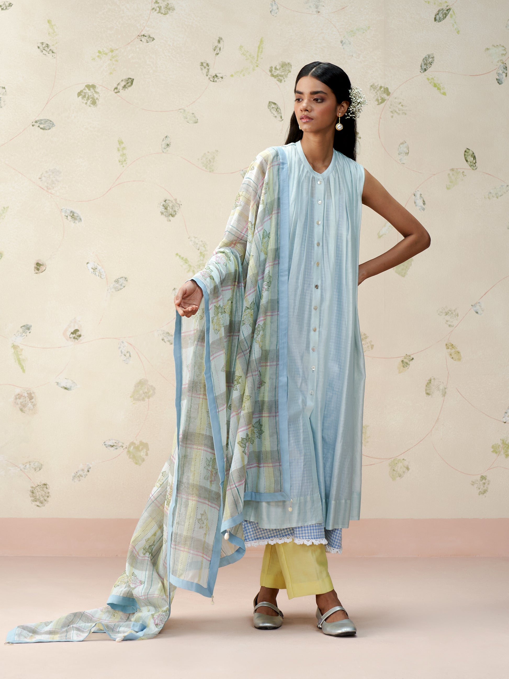 A gentle blend of texture and craft, this set features a handwoven mul Chanderi kurta paired with contrast Chanderi pants. Crafted with hand done smocking details and paired with handwoven cotton check lining accented with delicate crochet detailing that adds subtle charm. Thoughtfully tailored, the set balances traditional artistry with an easy, modern silhouette — perfect for days that call for quiet elegance. A hand block printed dupatta that brings together juxtaposed floral and check patterns in a refreshing palette. Crafted in airy mul Chanderi, it drapes with ease and lightness. Whether styled with solids or co-ords, this piece adds a touch of crafted sophistication to any ensemble.