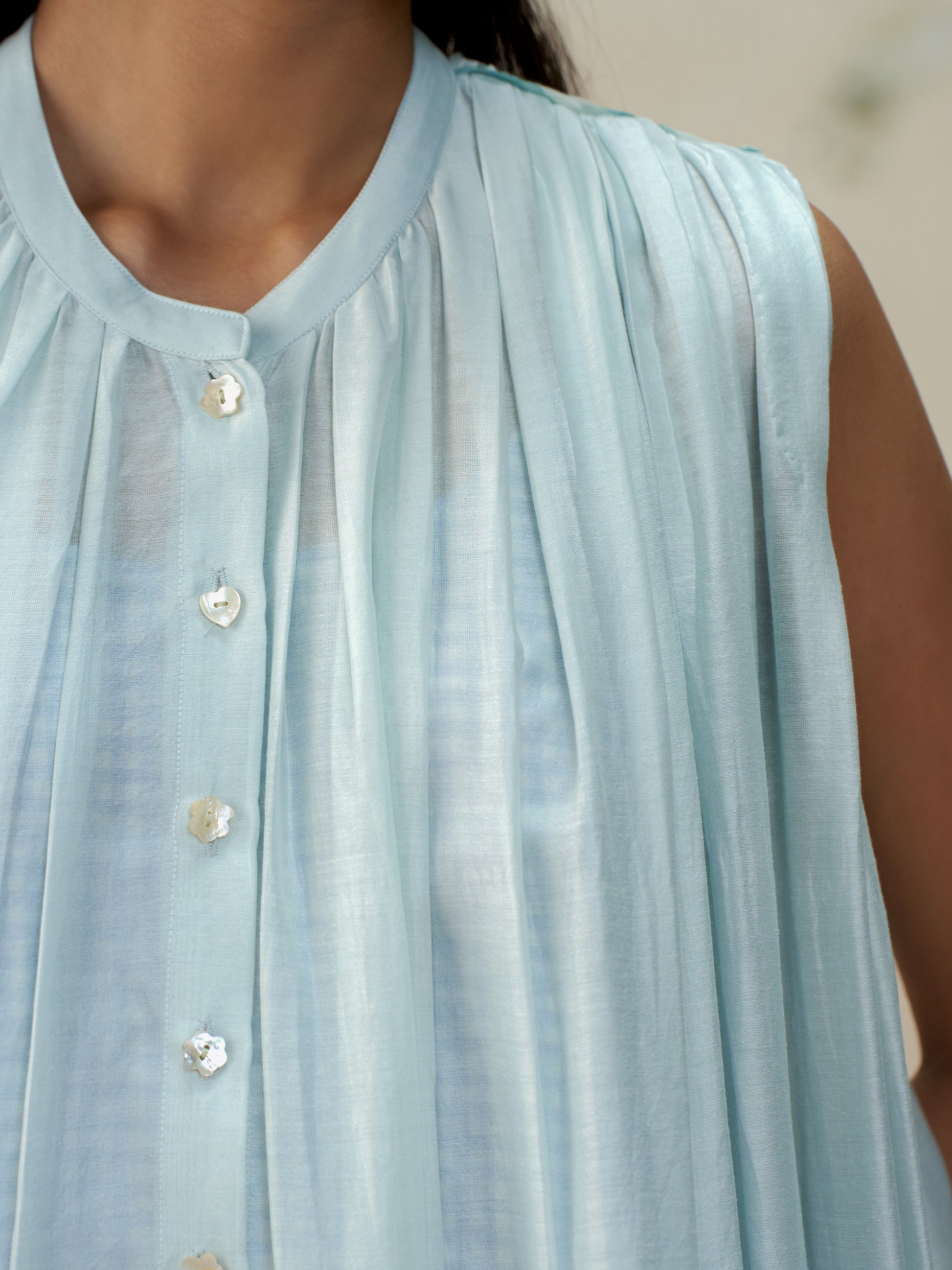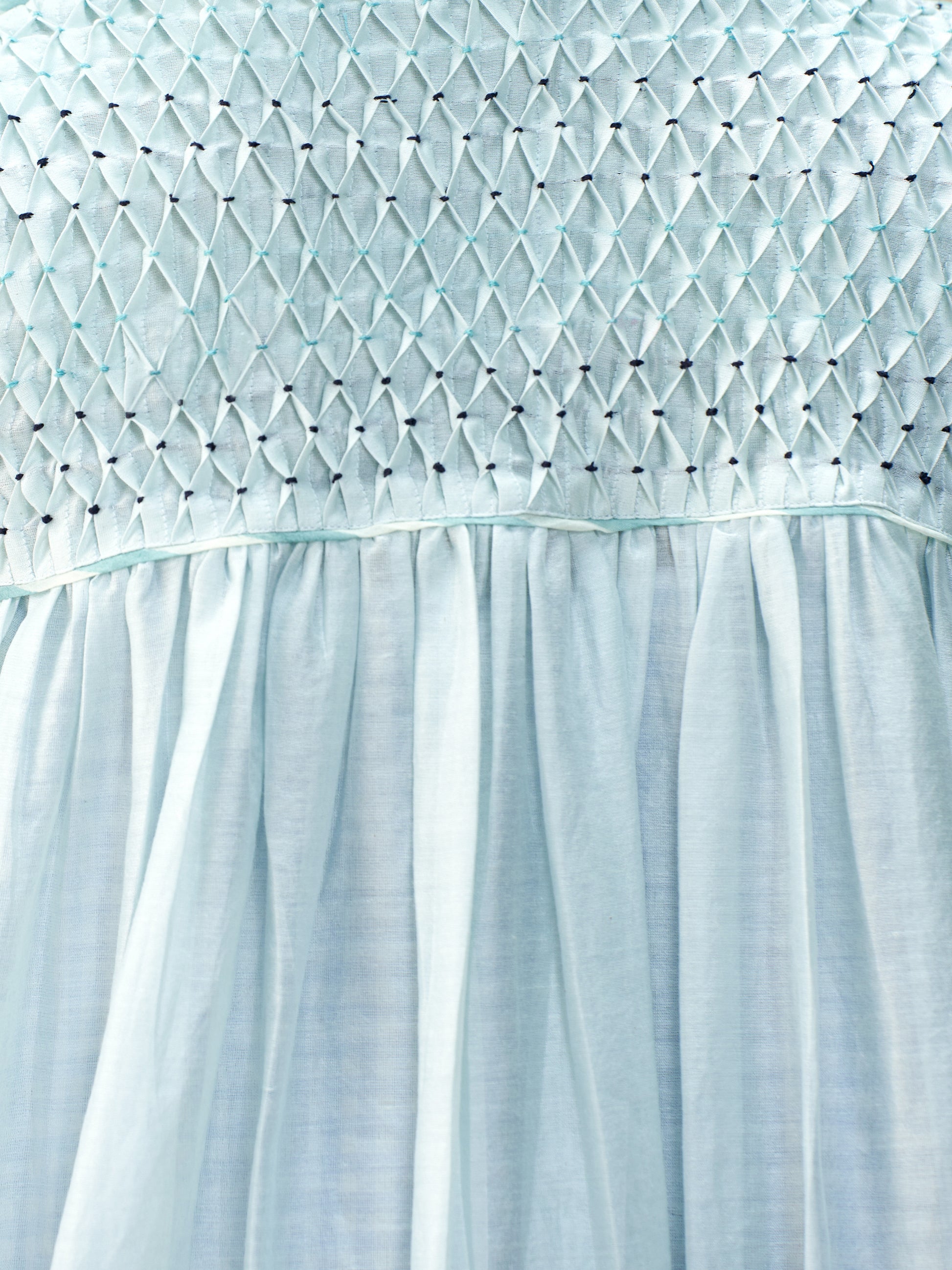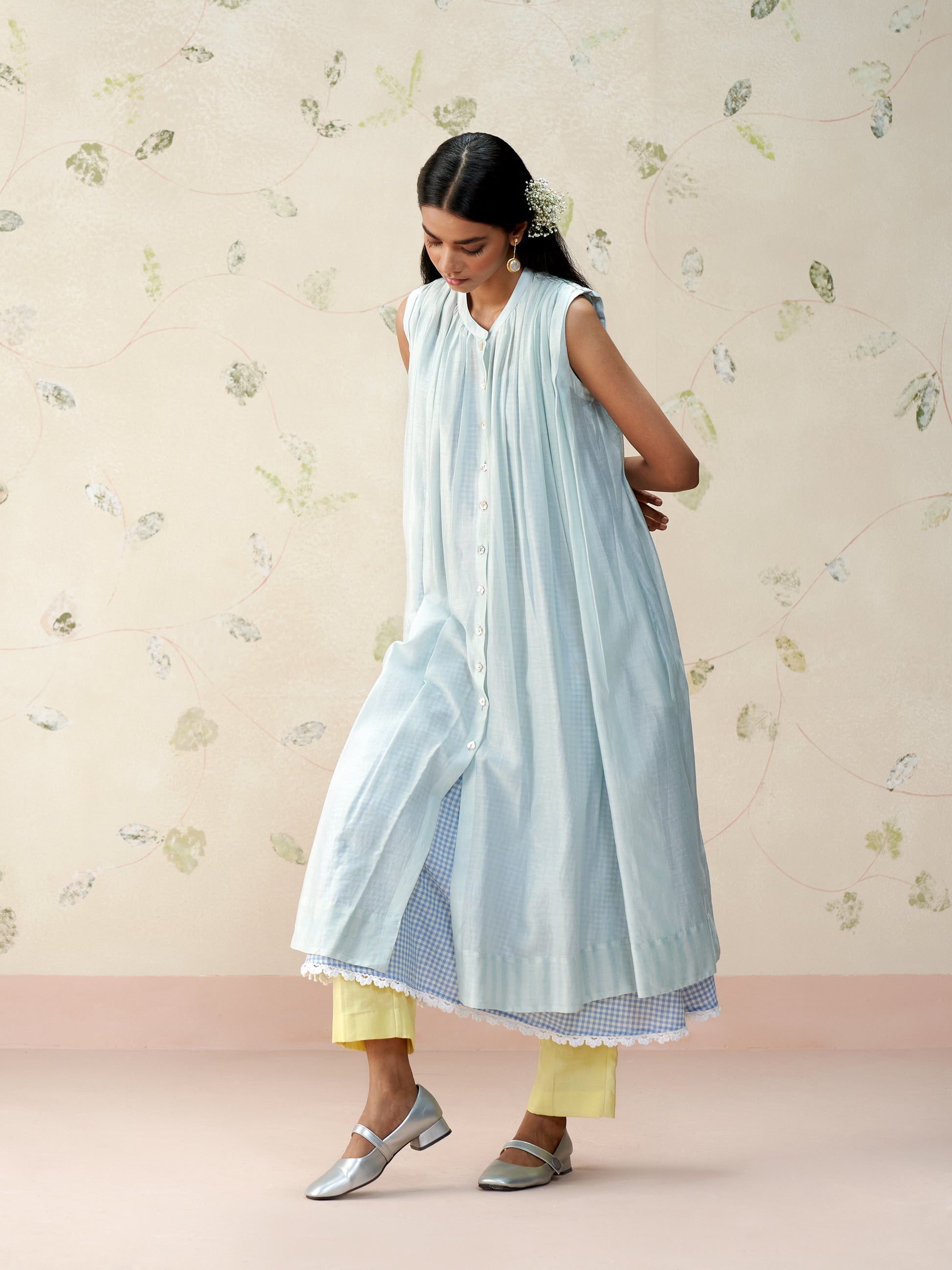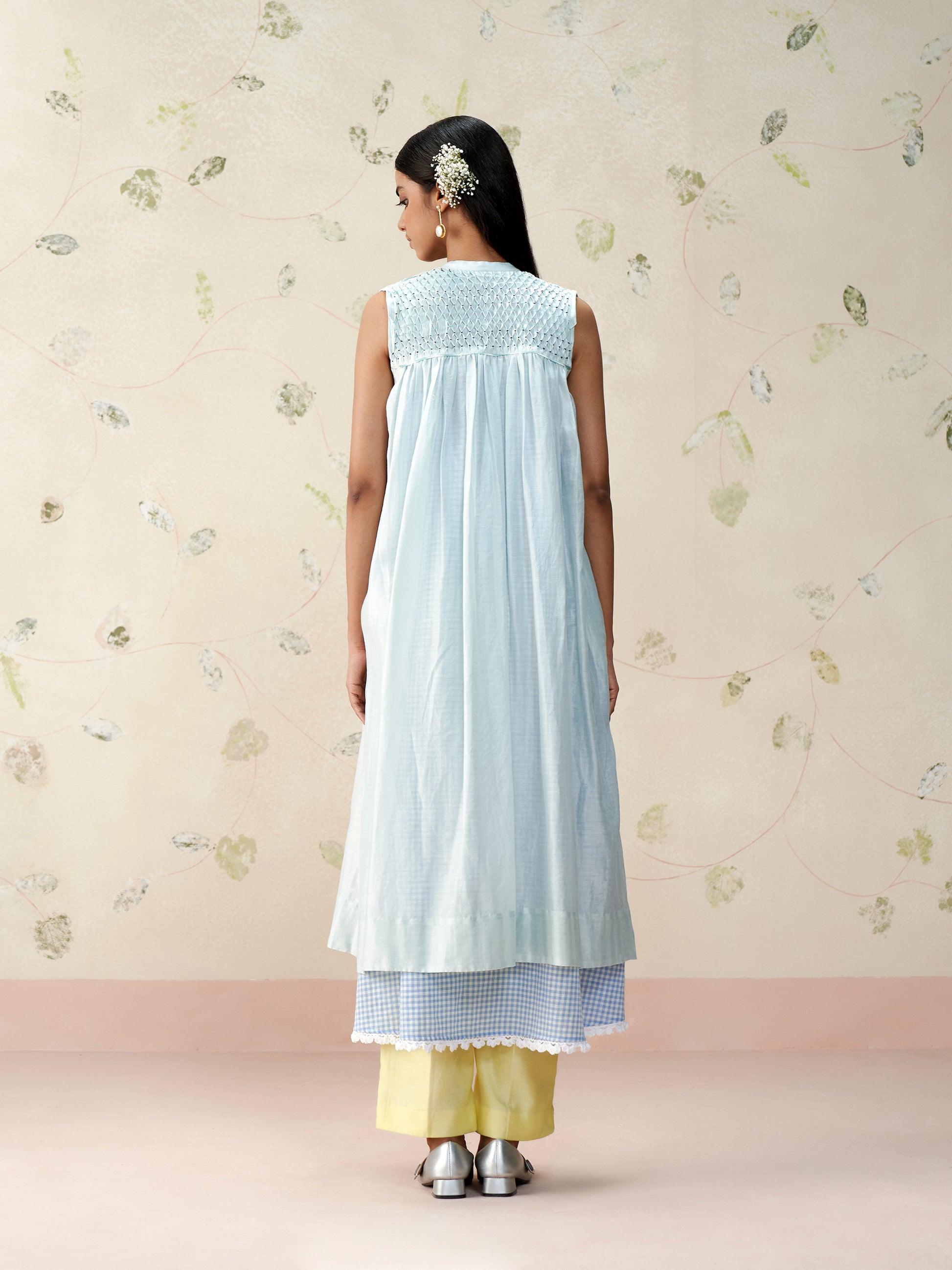 A gentle blend of texture and craft, this set features a handwoven mul Chanderi kurta paired with contrast Chanderi pants. Crafted with hand done smocking details and paired with handwoven cotton check lining accented with delicate crochet detailing that adds subtle charm. Thoughtfully tailored, the set balances traditional artistry with an easy, modern silhouette — perfect for days that call for quiet elegance. A hand block printed dupatta that brings together juxtaposed floral and check patterns in a refreshing palette. Crafted in airy mul Chanderi, it drapes with ease and lightness. Whether styled with solids or co-ords, this piece adds a touch of crafted sophistication to any ensemble.