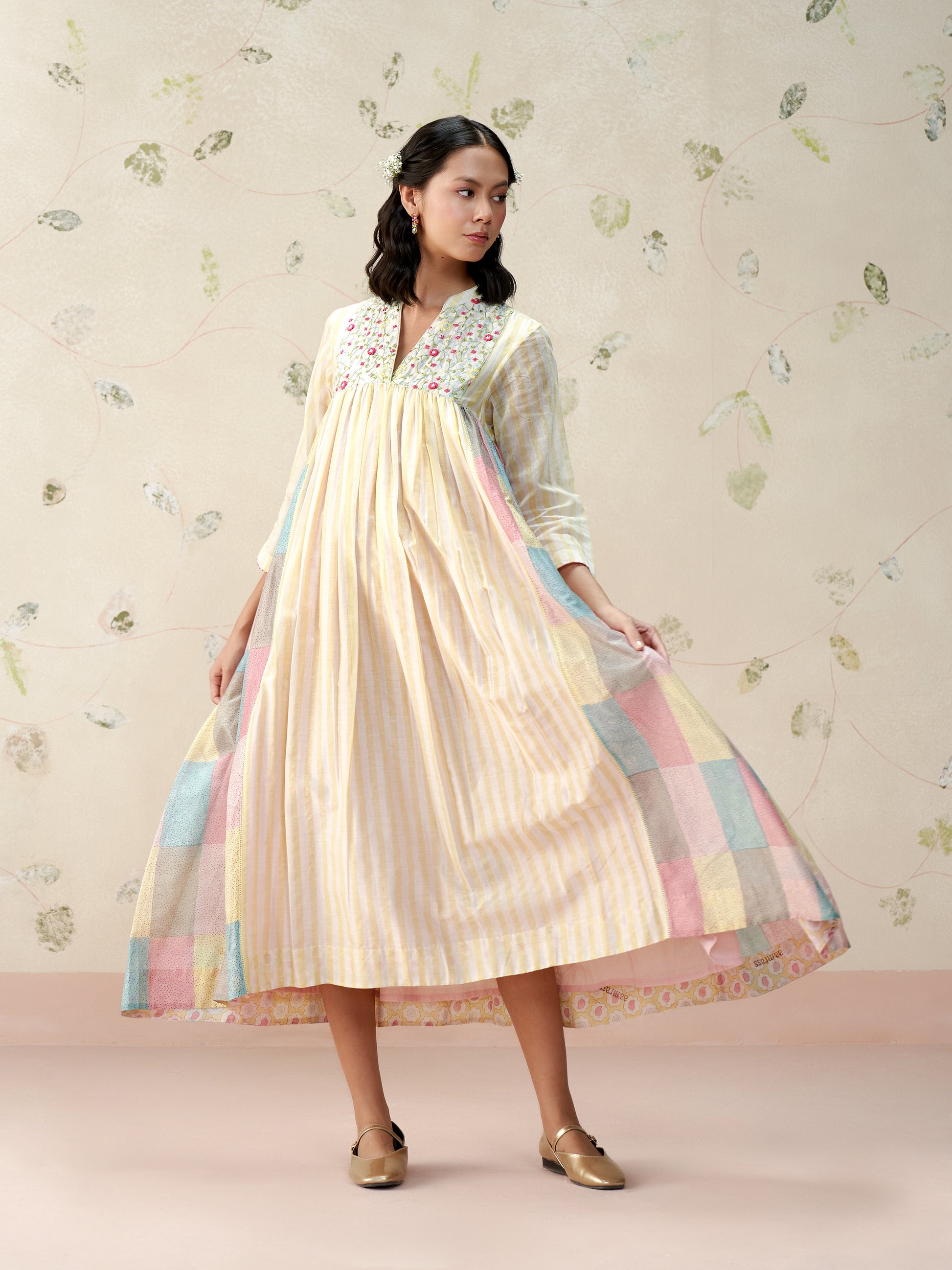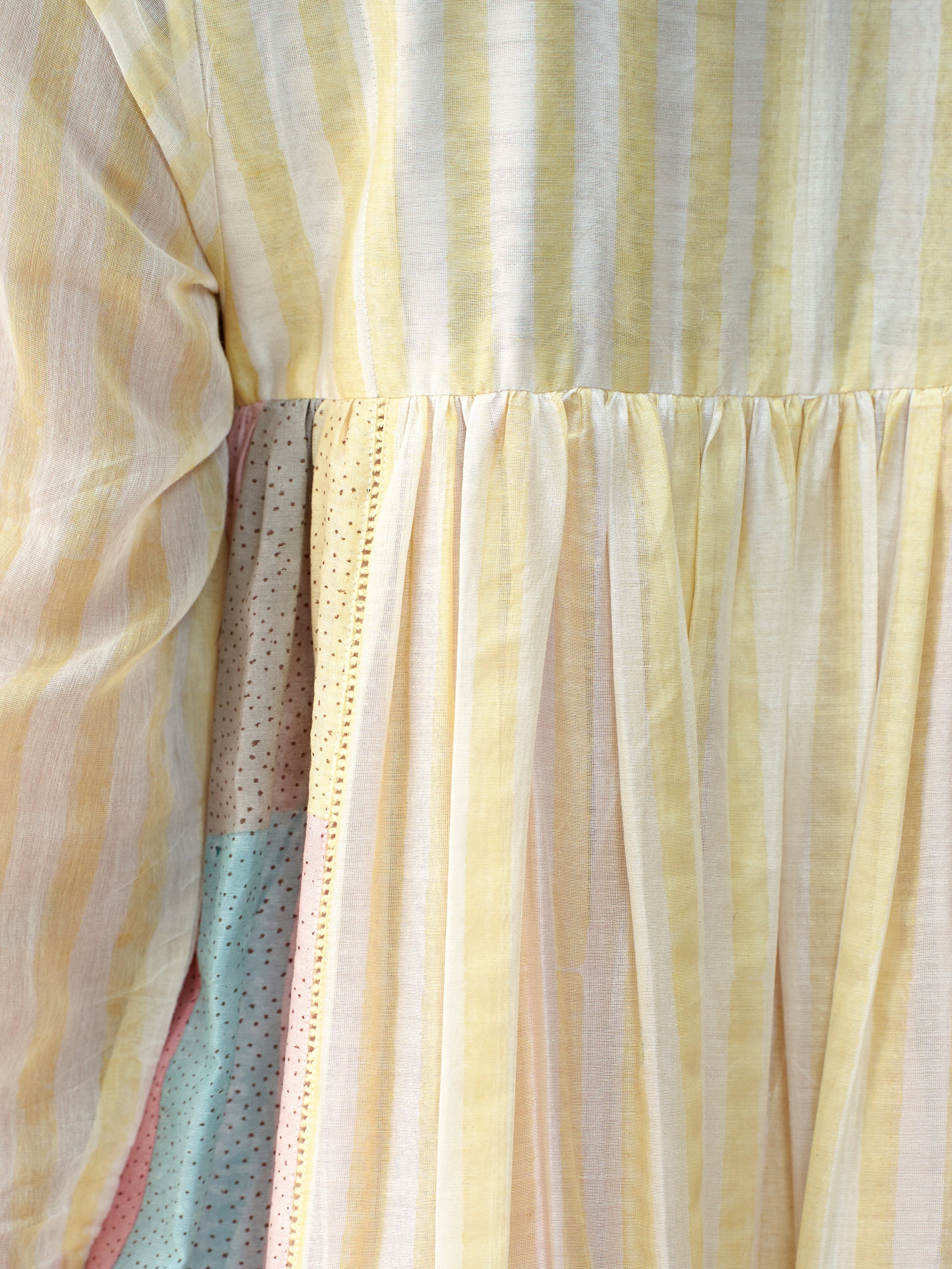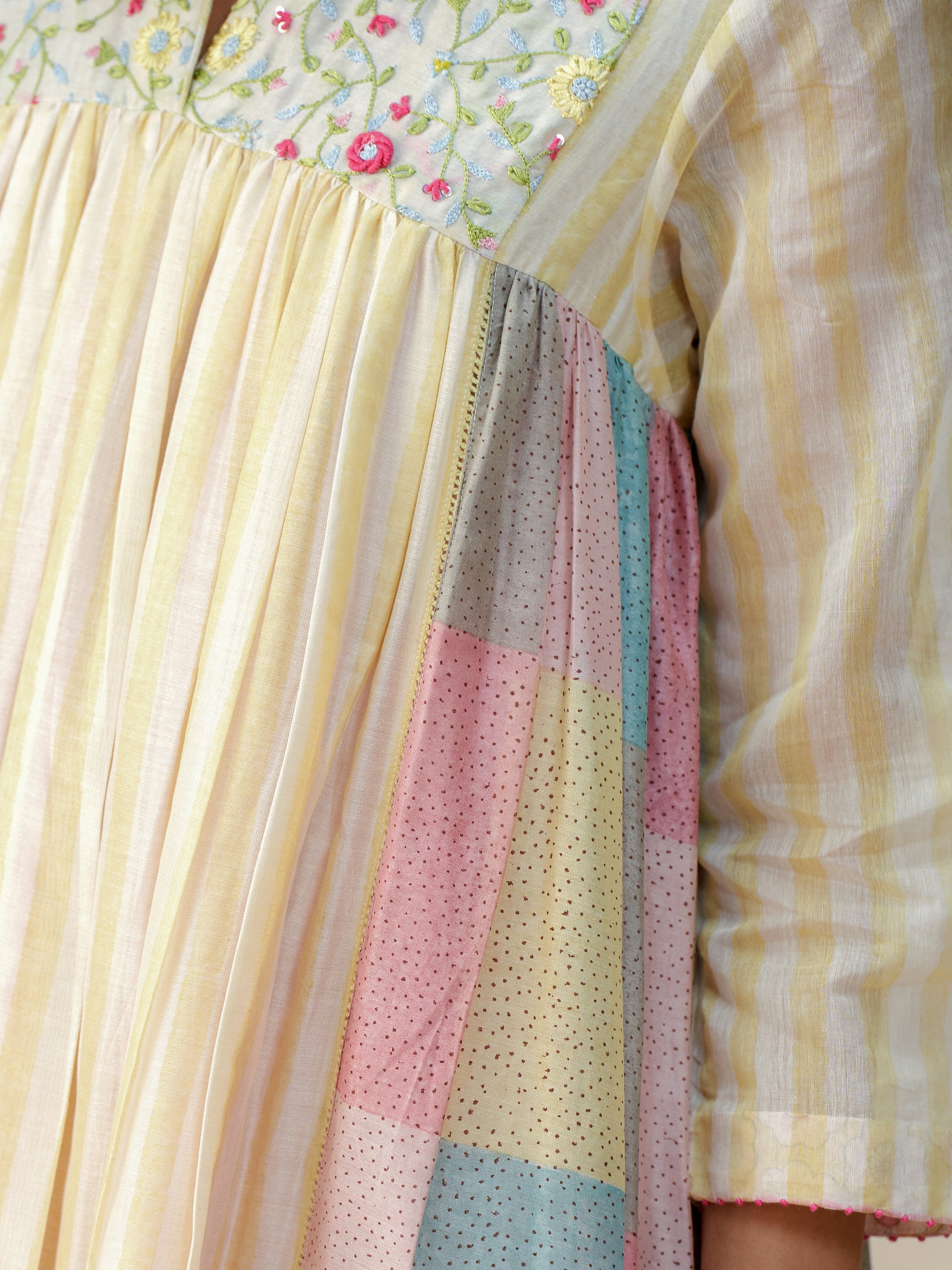 Crafted in 100% handwoven Chanderi, this breezy kurta is detailed with delicate hand-embroidered rosettes on the yoke. The flowing silhouette is complemented by handblock printed stripes on the sleeves and kalis, adding a subtle play of texture and colour. Lightweight and airy, it’s an effortless pick for sunlit days. Finished with contrast hand block printed lining.