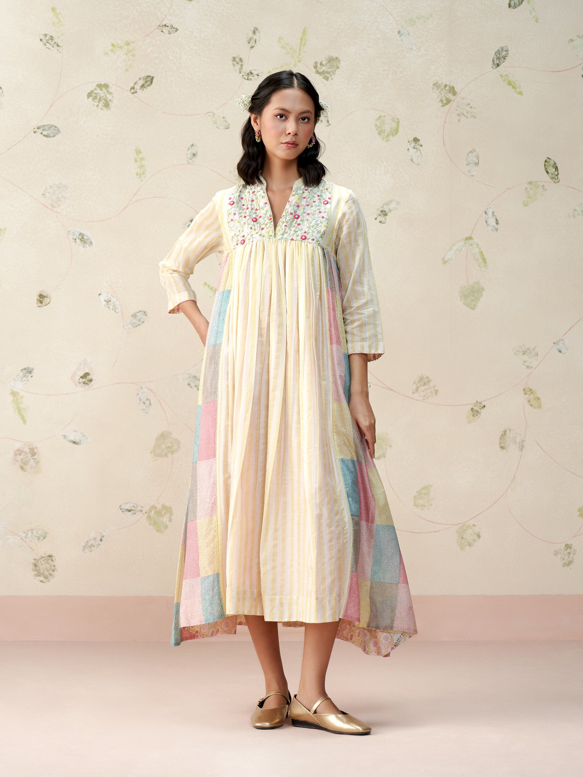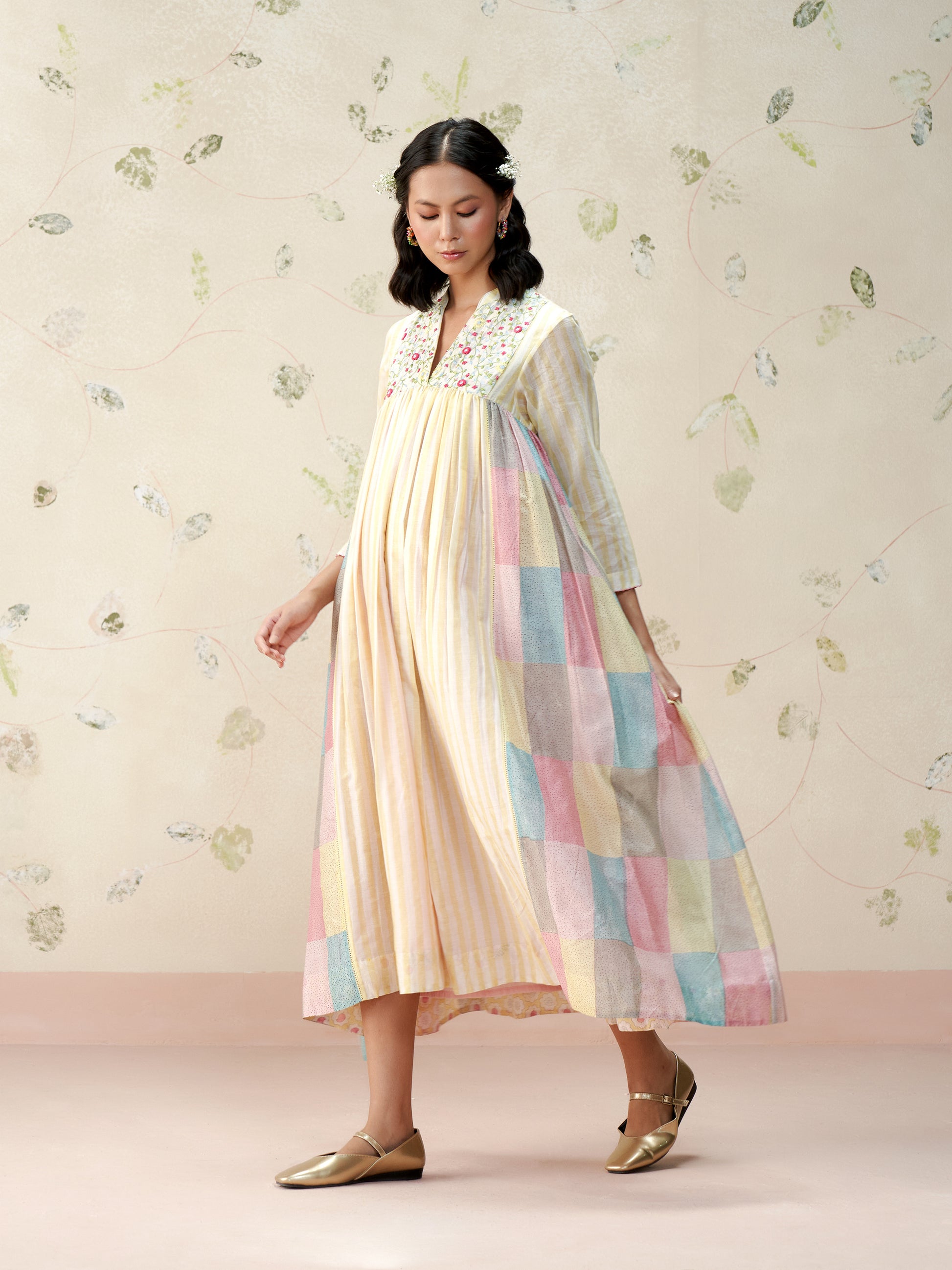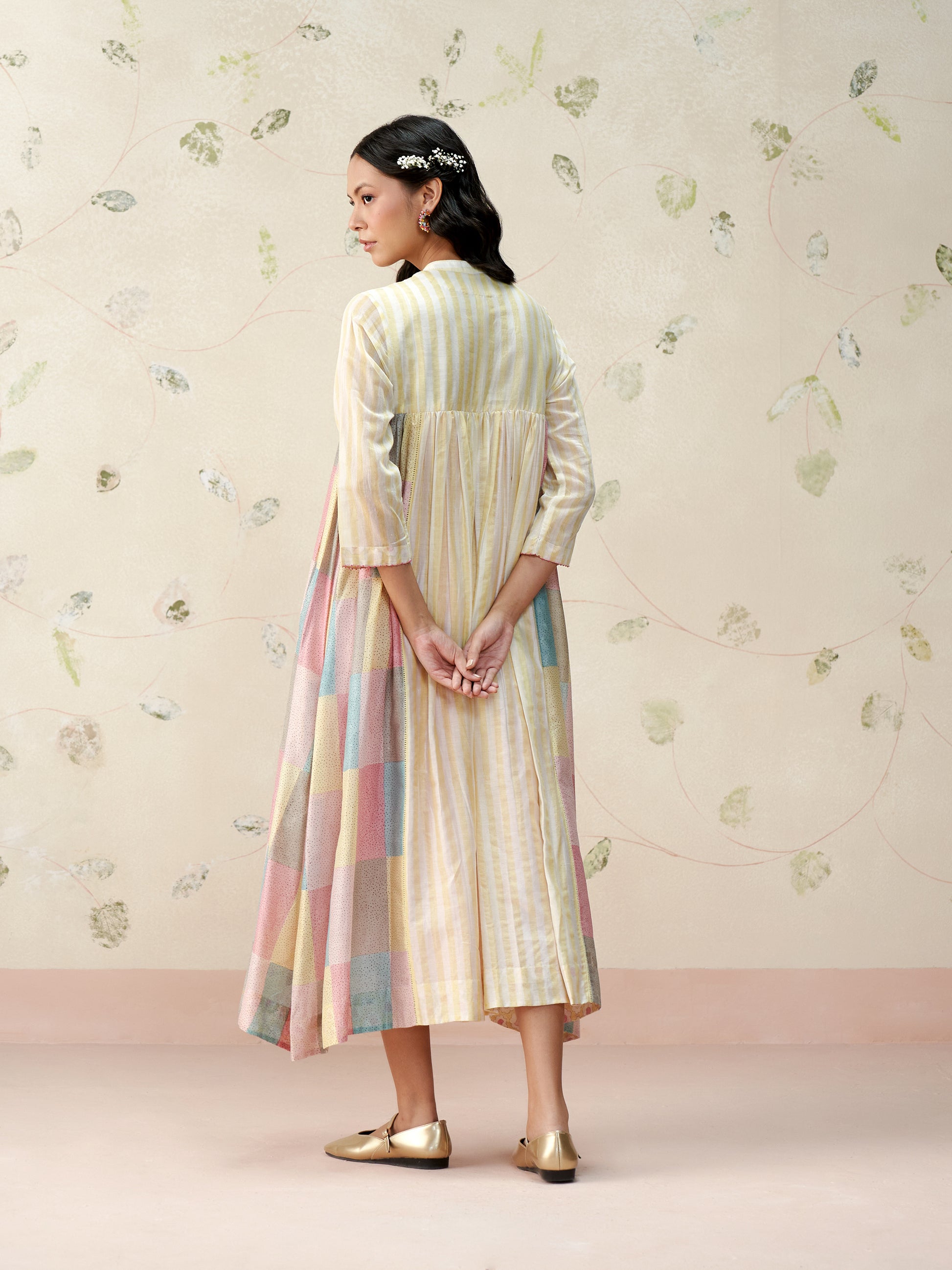 Crafted in 100% handwoven Chanderi, this breezy kurta is detailed with delicate hand-embroidered rosettes on the yoke. The flowing silhouette is complemented by handblock printed stripes on the sleeves and kalis, adding a subtle play of texture and colour. Lightweight and airy, it’s an effortless pick for sunlit days. Finished with contrast hand block printed lining.