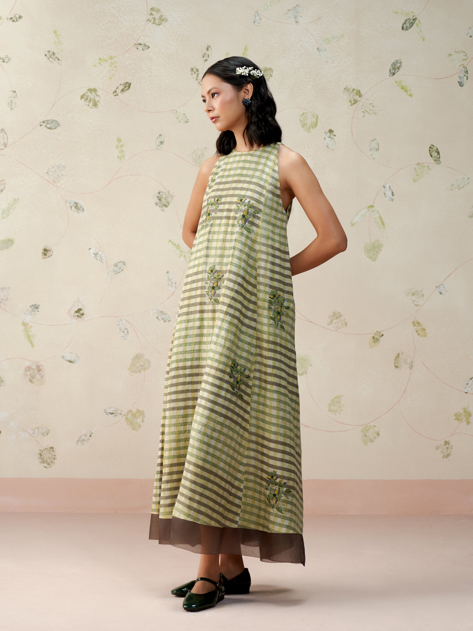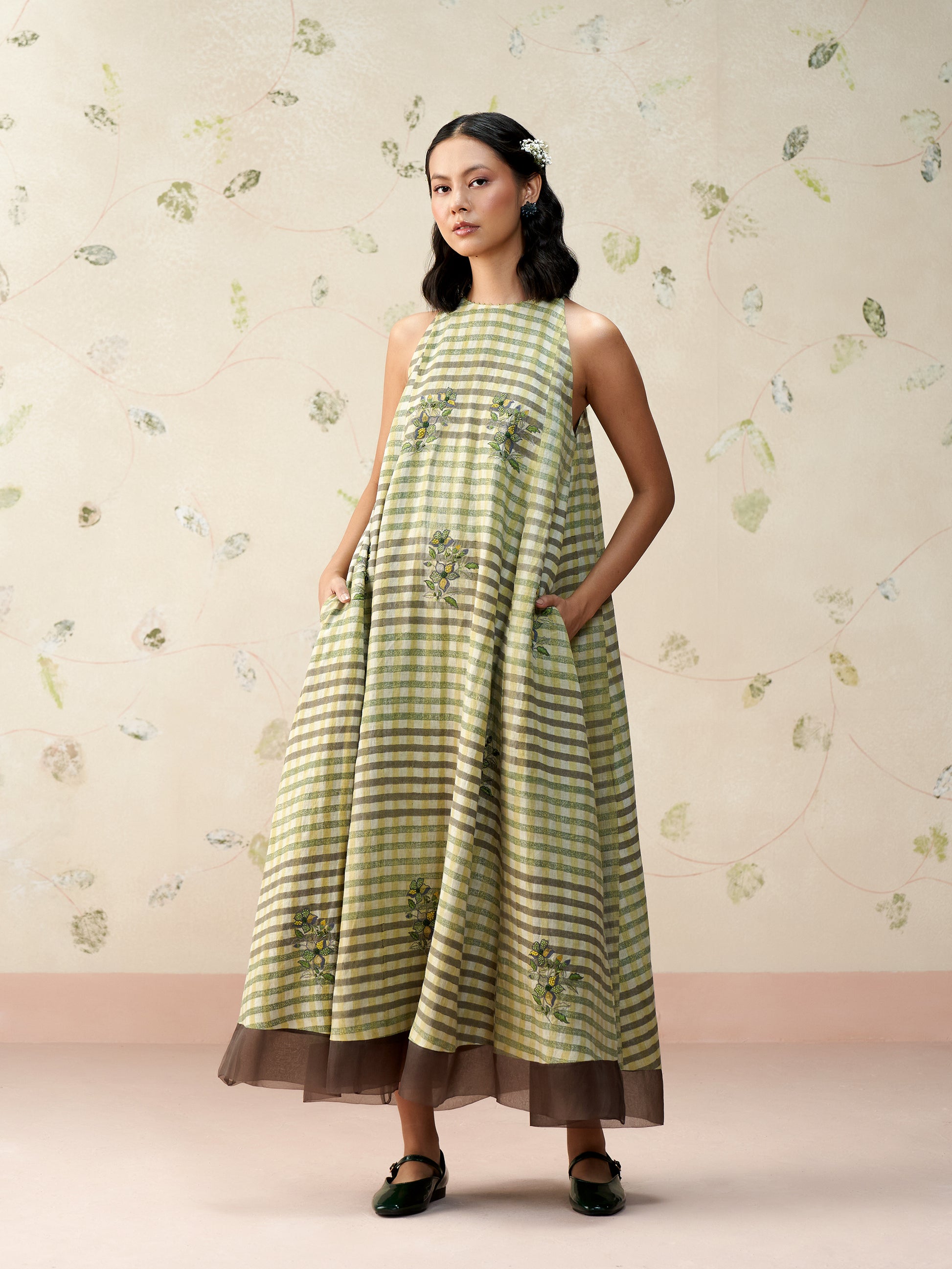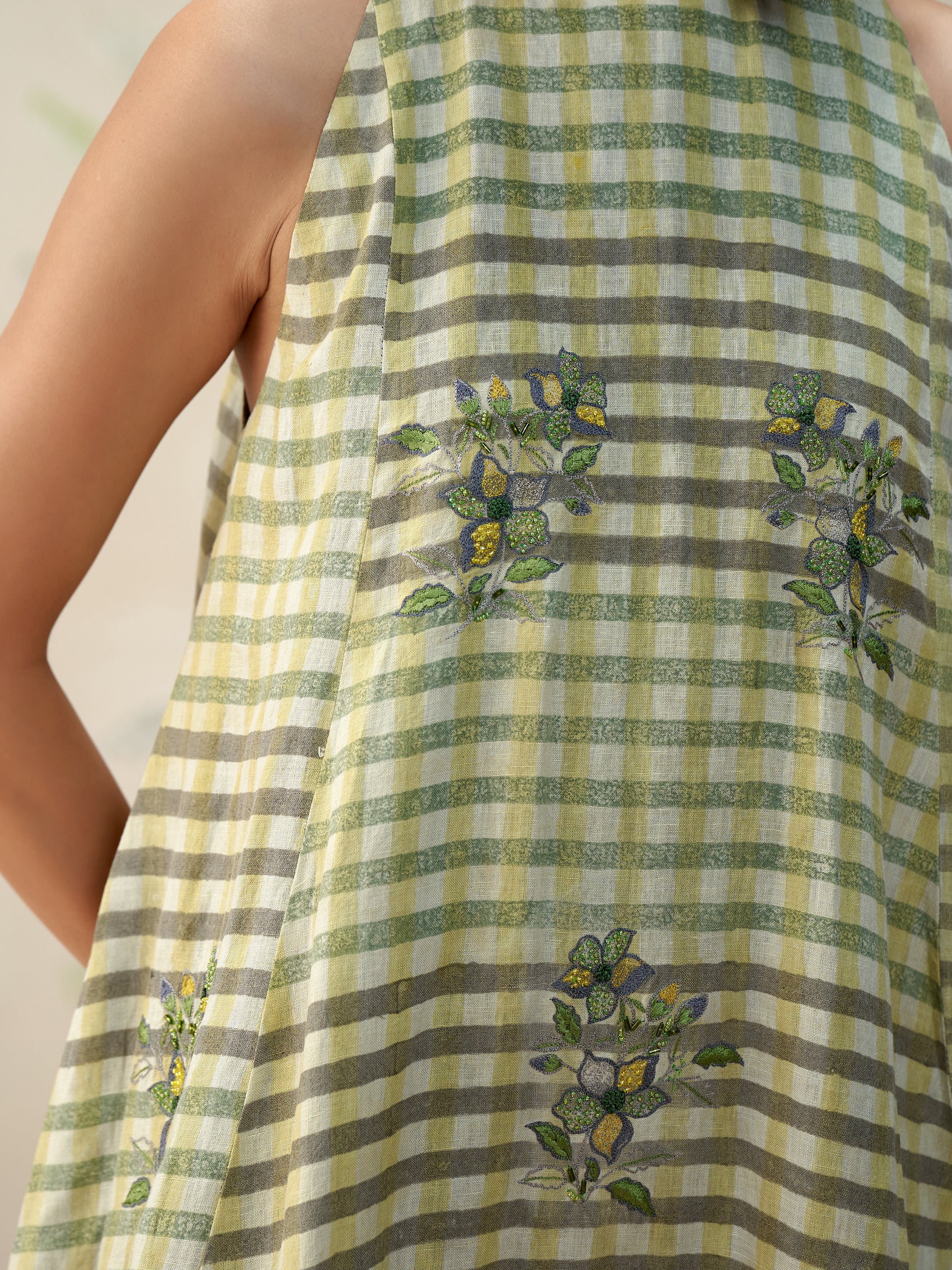 Sleeveless flared dress crafted in 100% pure linen with a hand block printed check pattern. Features delicate hand-embroidered floral motifs and a soft contrast organza hem. Designed for ease and movement with side pockets and a high neckline.