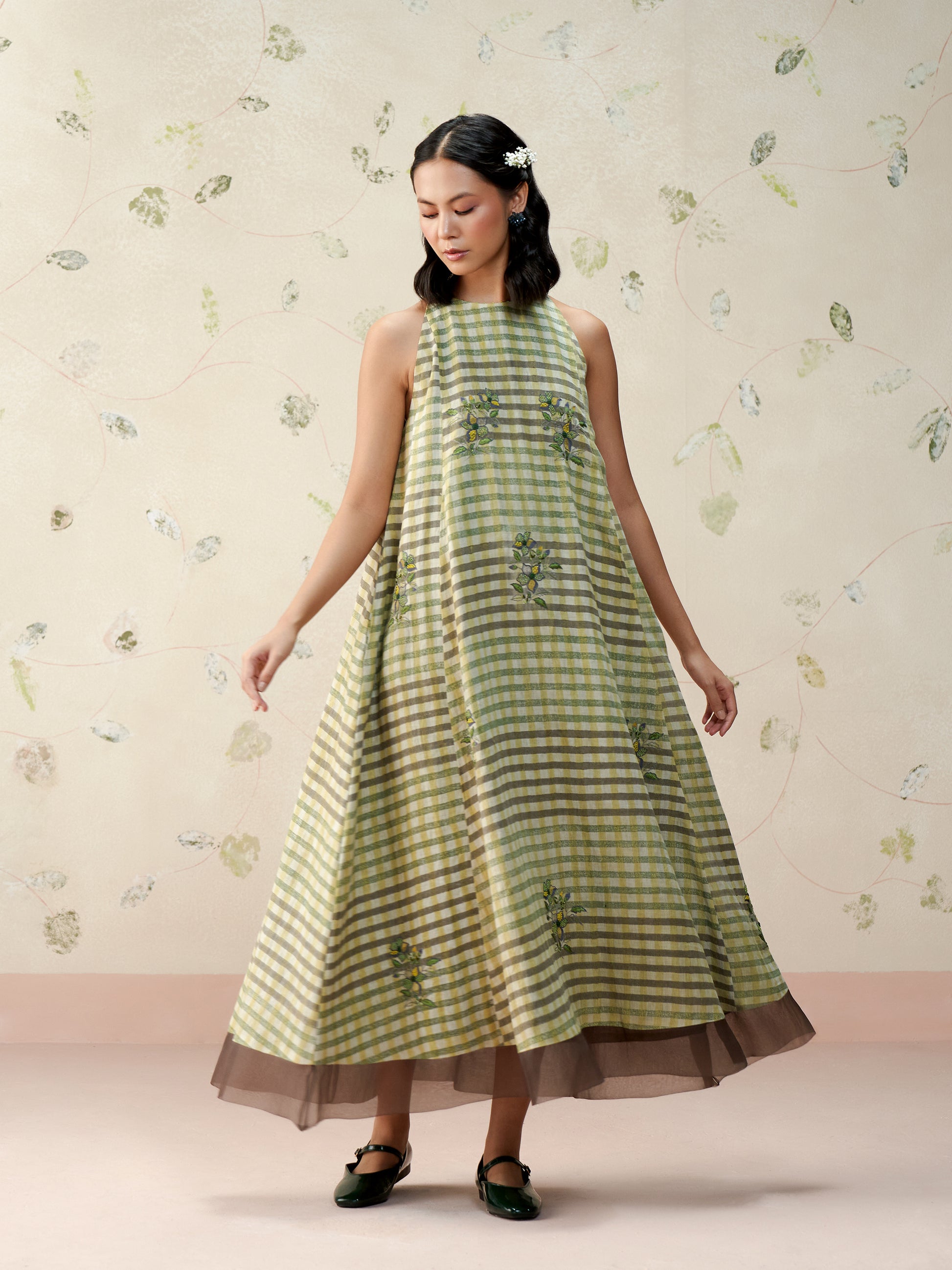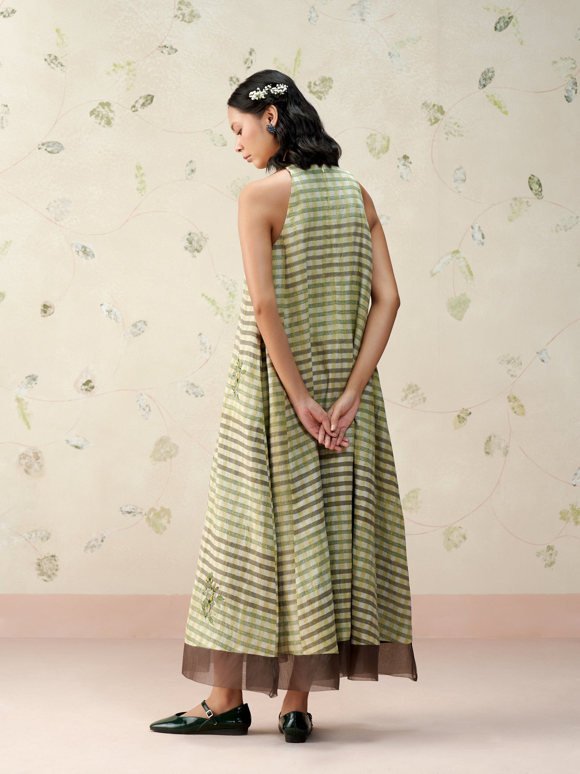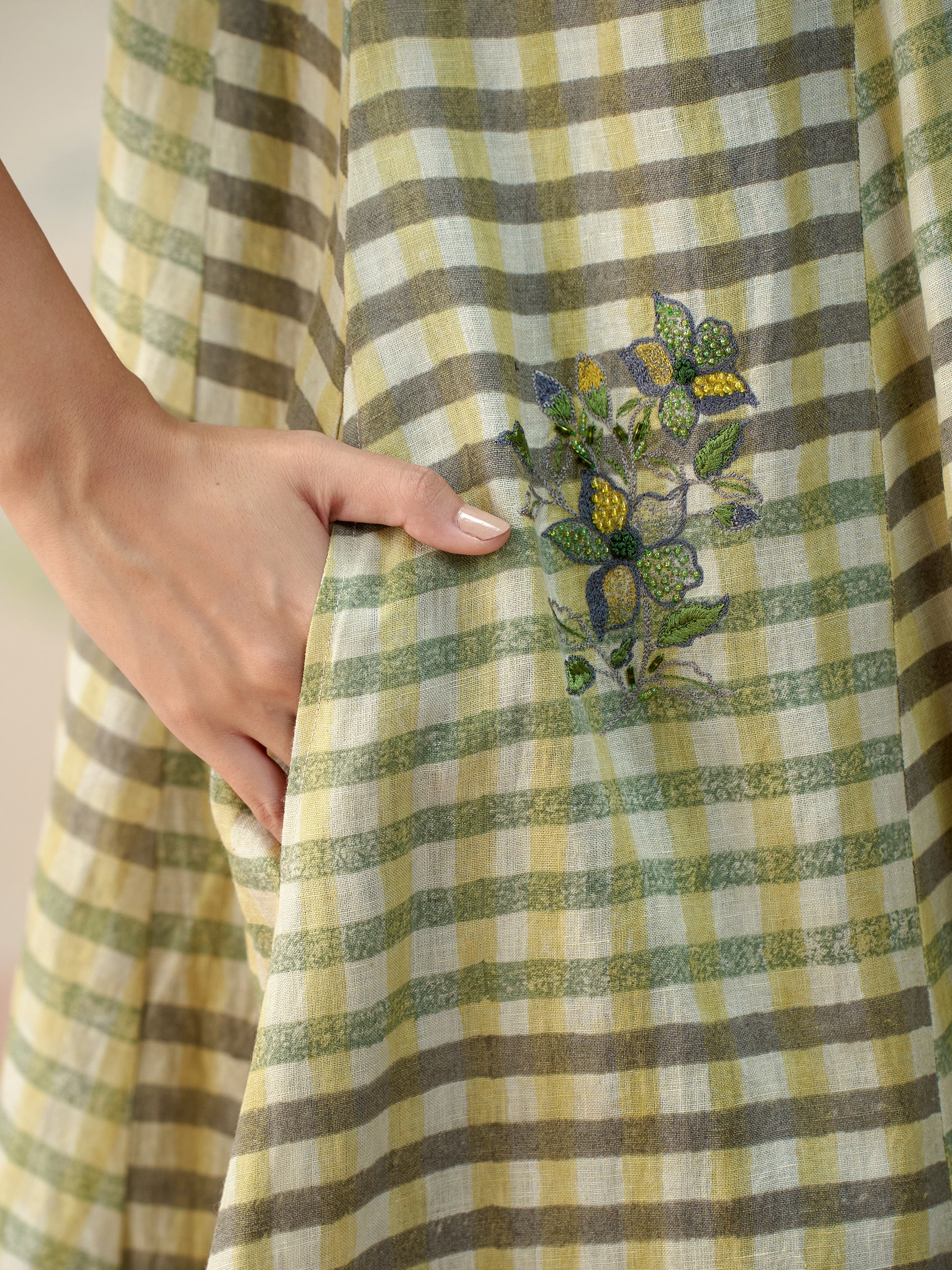 Sleeveless flared dress crafted in 100% pure linen with a hand block printed check pattern. Features delicate hand-embroidered floral motifs and a soft contrast organza hem. Designed for ease and movement with side pockets and a high neckline.
