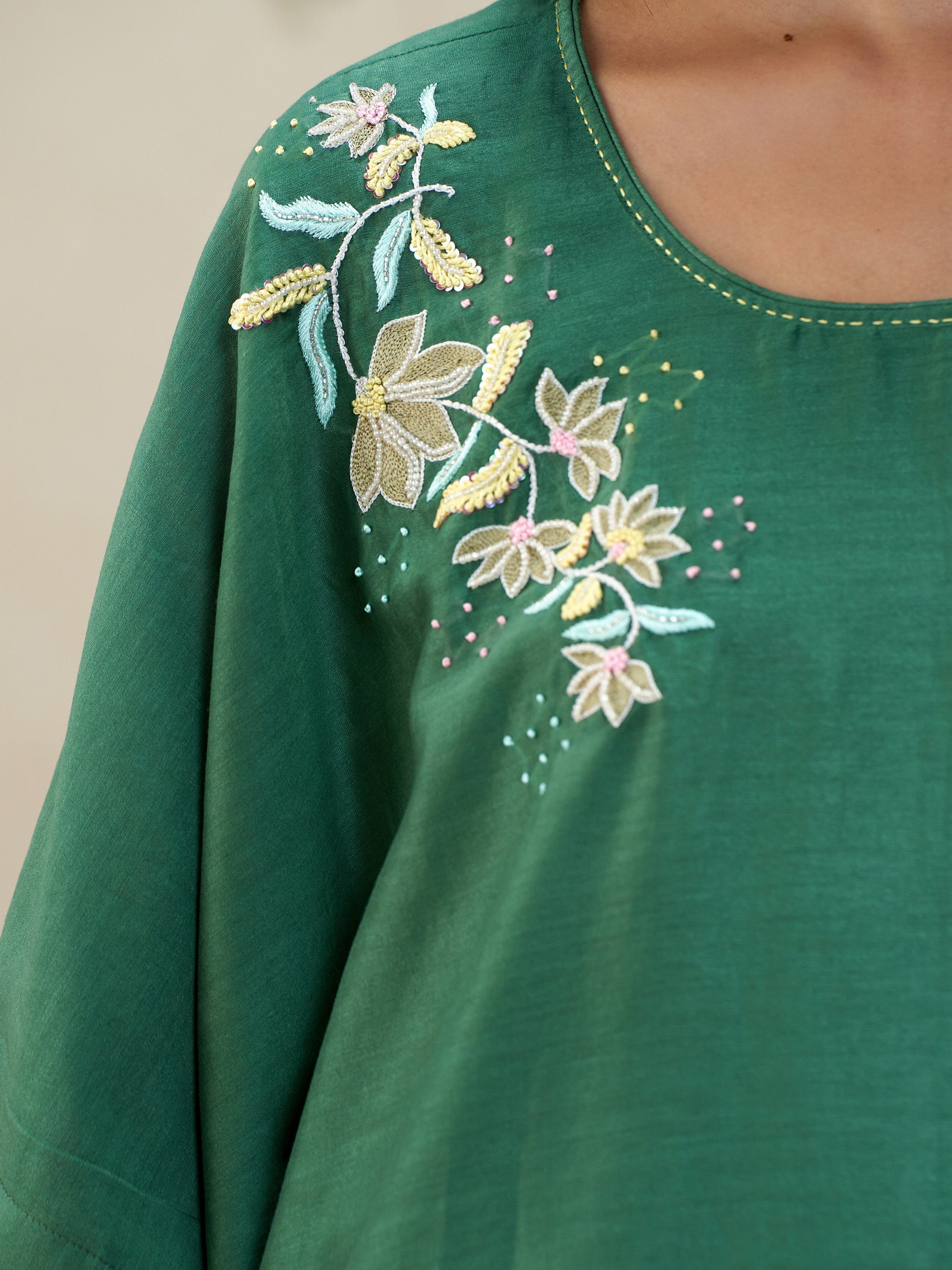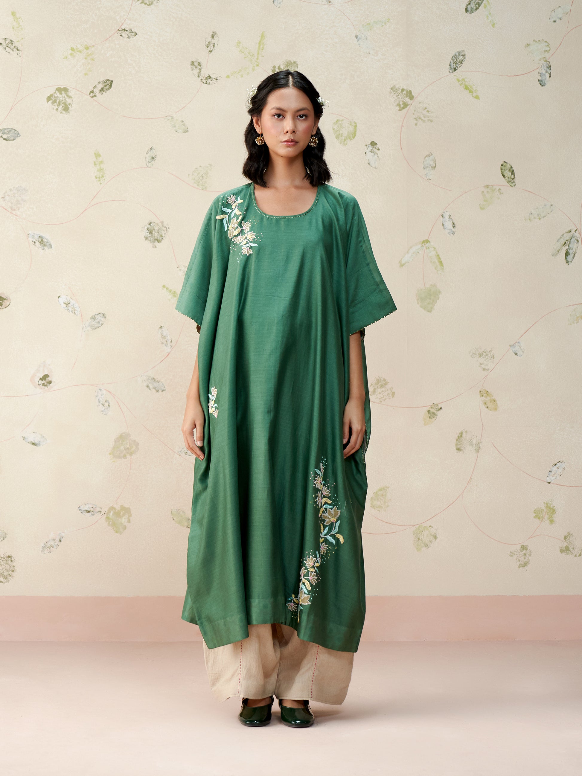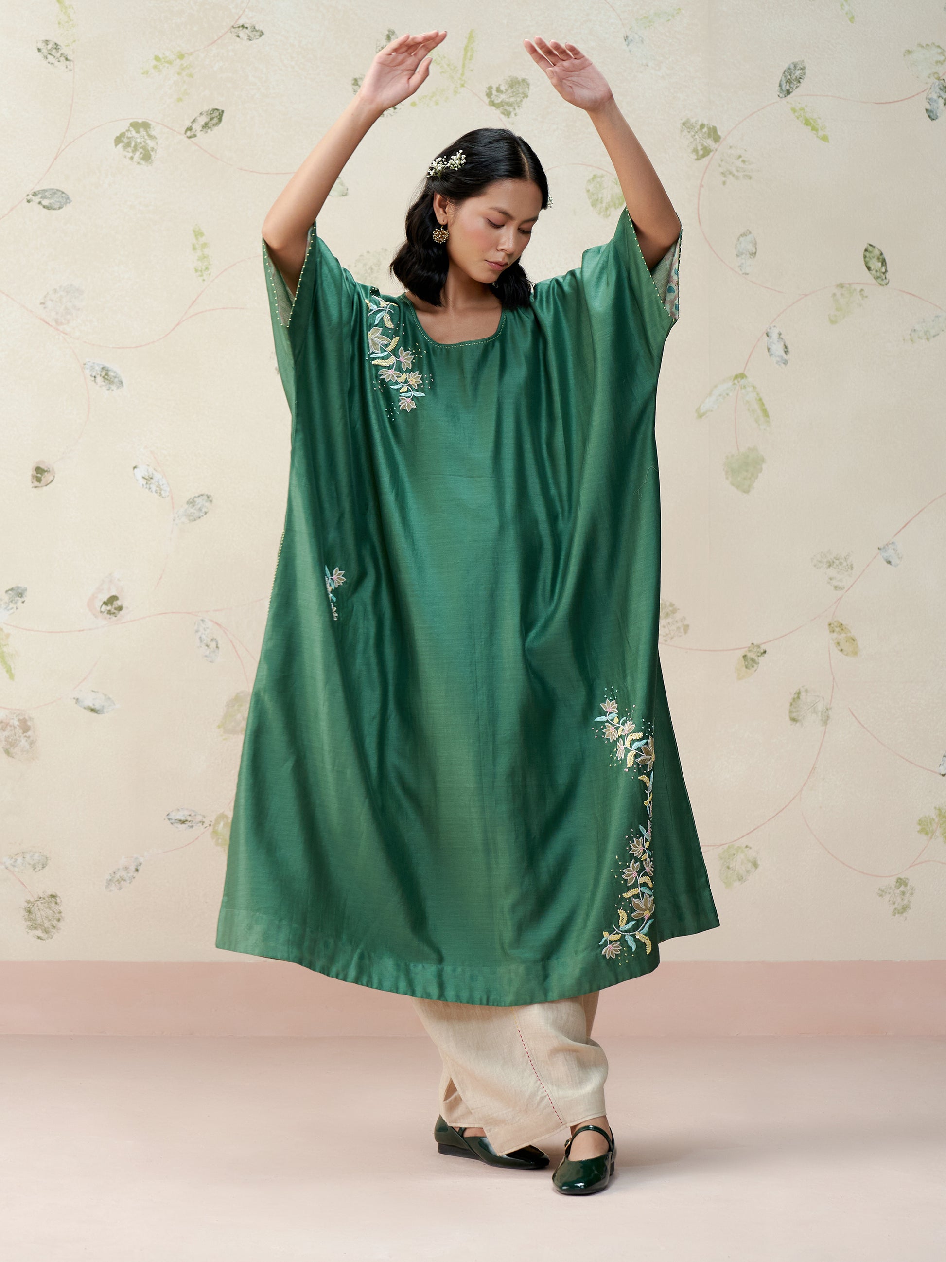 This freesize kaftan top in turqoise green blends comfort with elegance through its airy silhouette and flowy drape. Thoughtfully detailed with delicate floral hand embroidery and subtle contrast prints finishes, it’s a relaxed yet refined piece that’s perfect for everyday ease or slow, special moments.