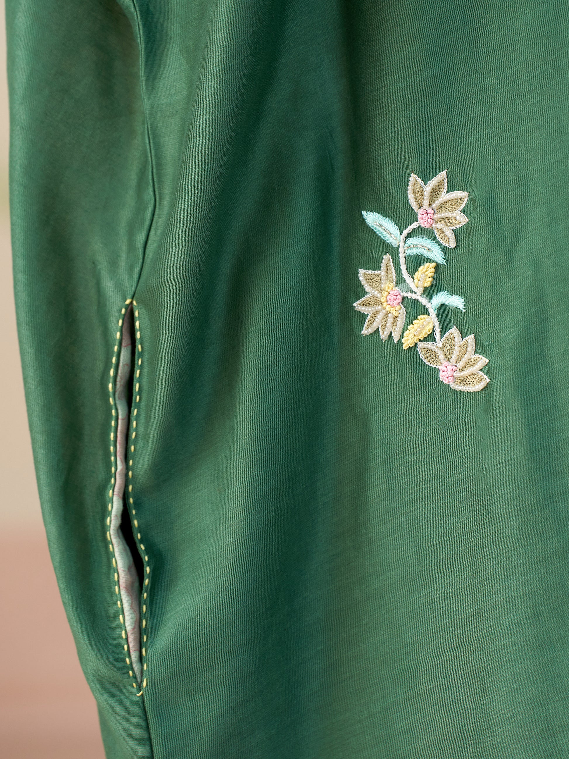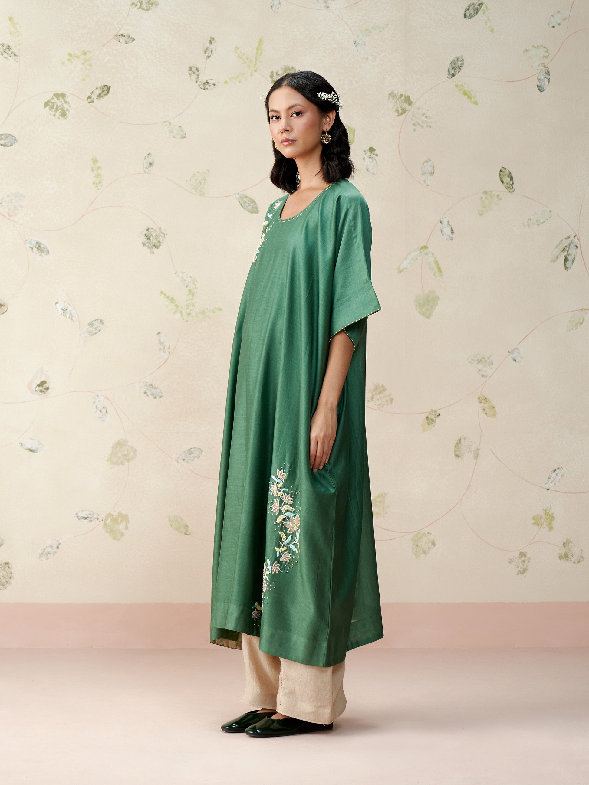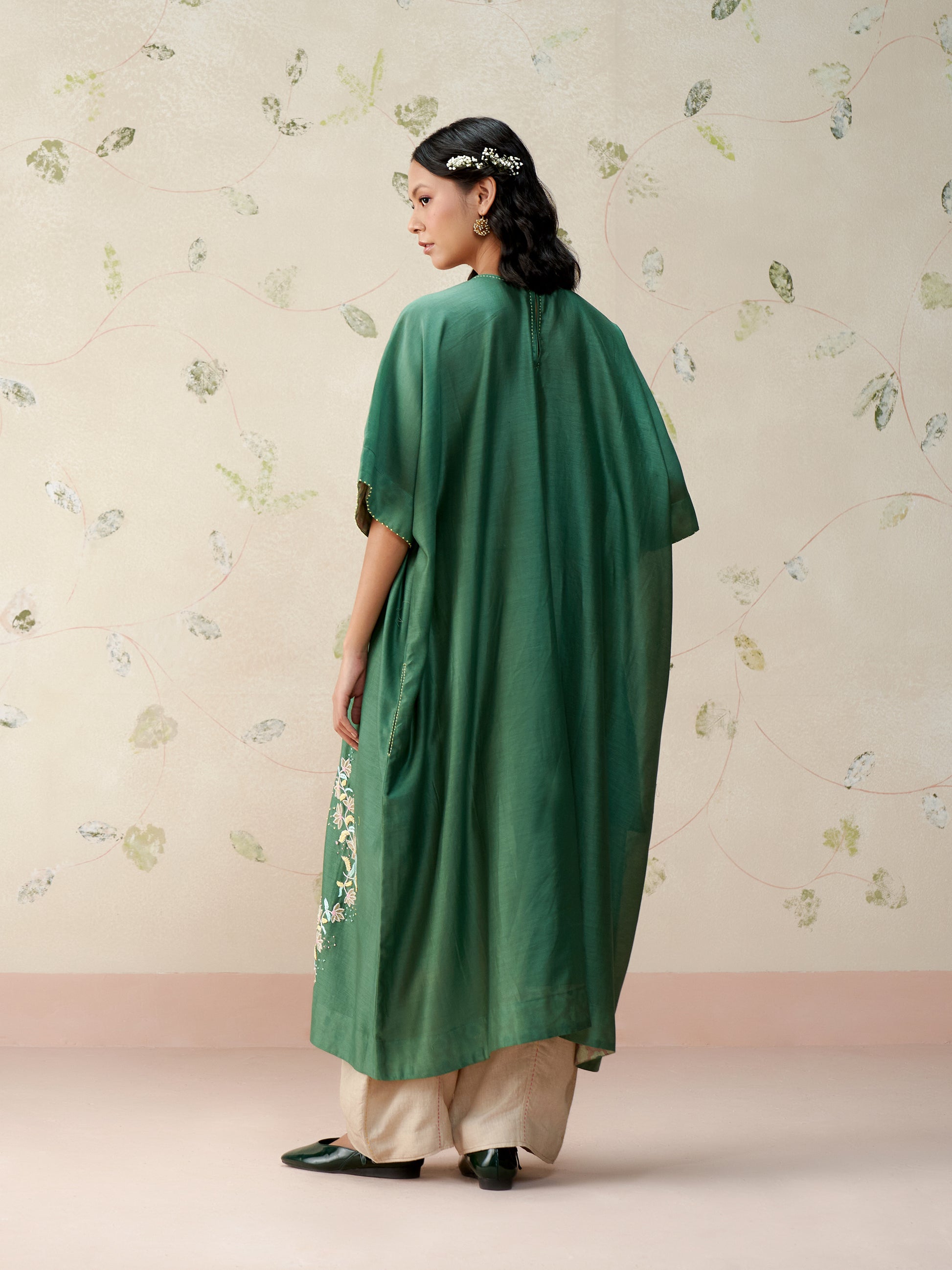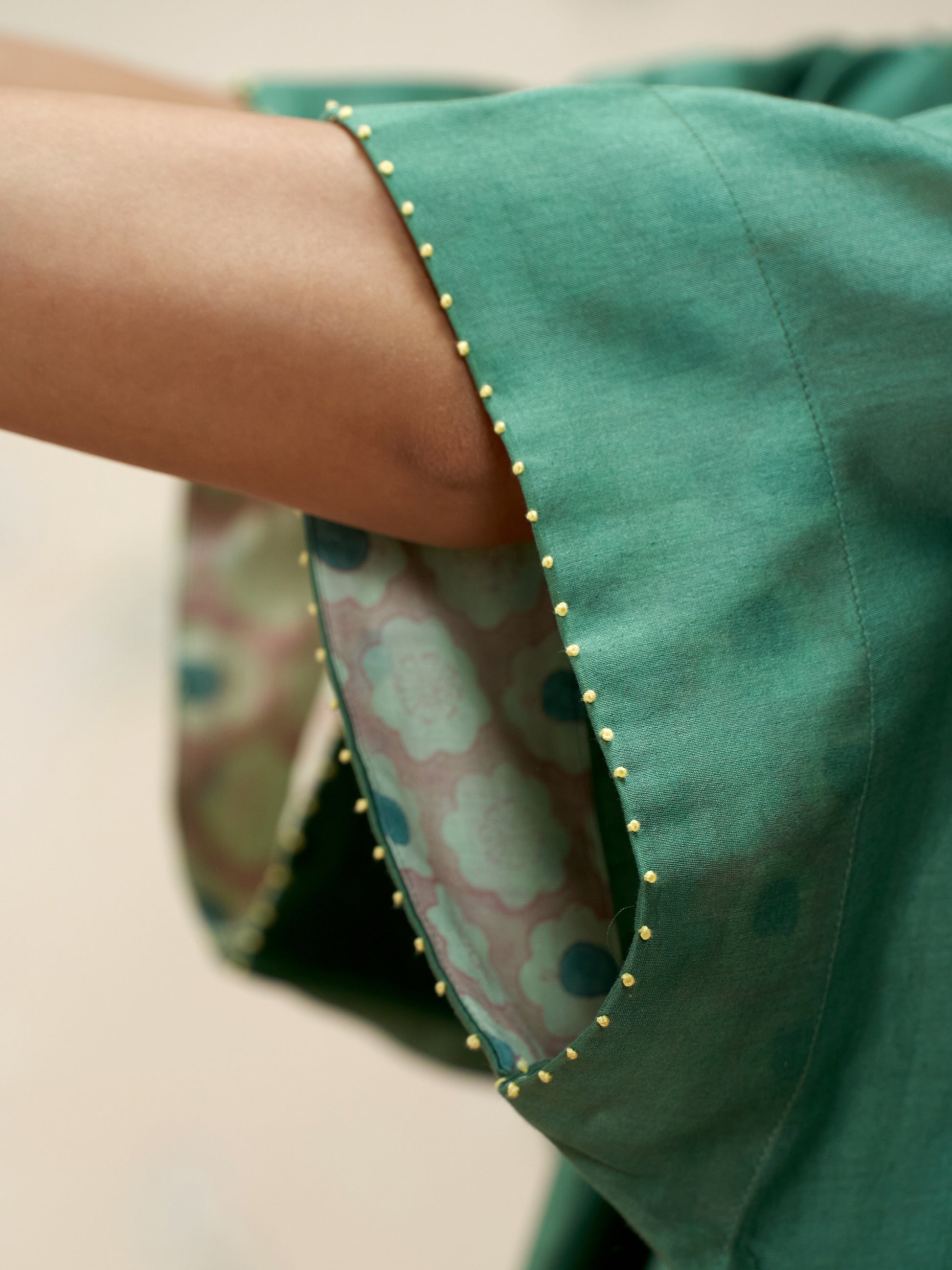 This freesize kaftan top in turqoise green blends comfort with elegance through its airy silhouette and flowy drape. Thoughtfully detailed with delicate floral hand embroidery and subtle contrast prints finishes, it’s a relaxed yet refined piece that’s perfect for everyday ease or slow, special moments.