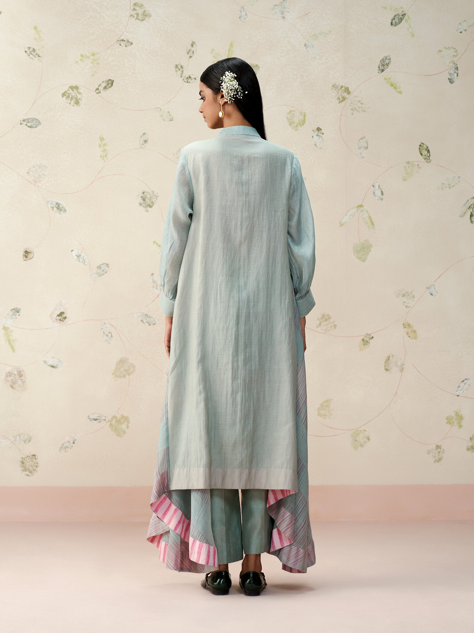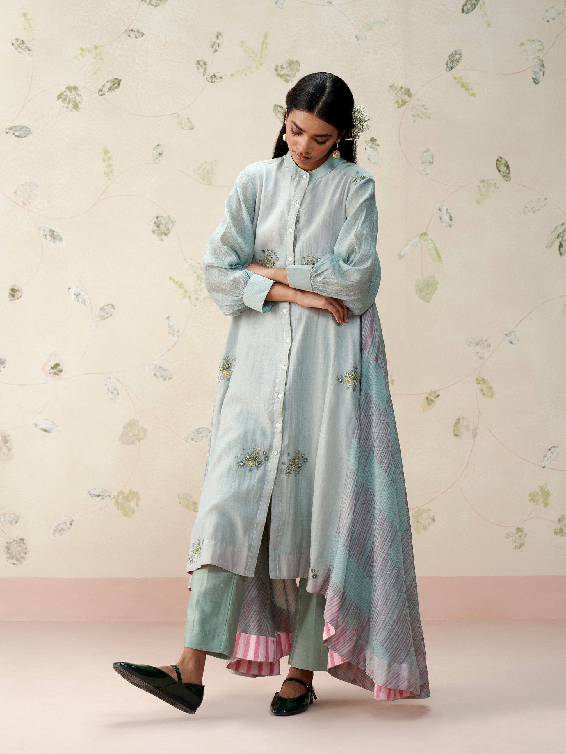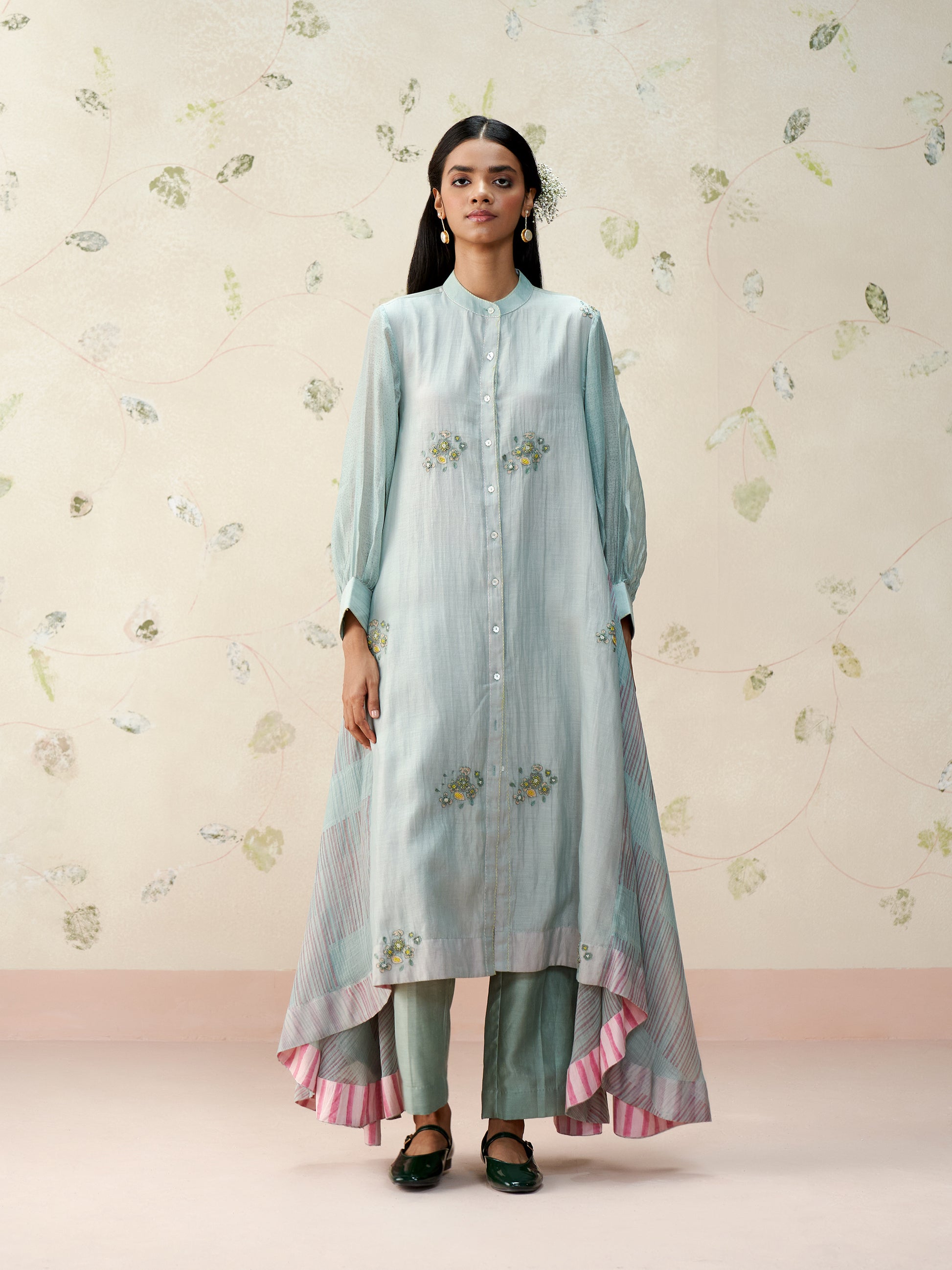 A relaxed A-line silhouette in handwoven mul chanderi, this powder blue kurta features delicate hand-embroidered floral motifs and gathered sheer sleeves. The uneven, flowy hem is highlighted with hand block printed stripes for a playful touch. Paired with straight chanderi pants, it’s an effortless blend of elegance and ease.