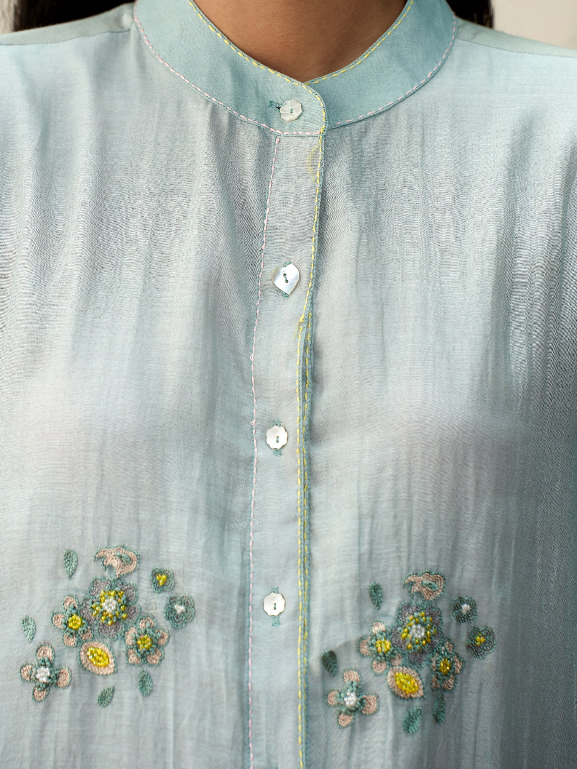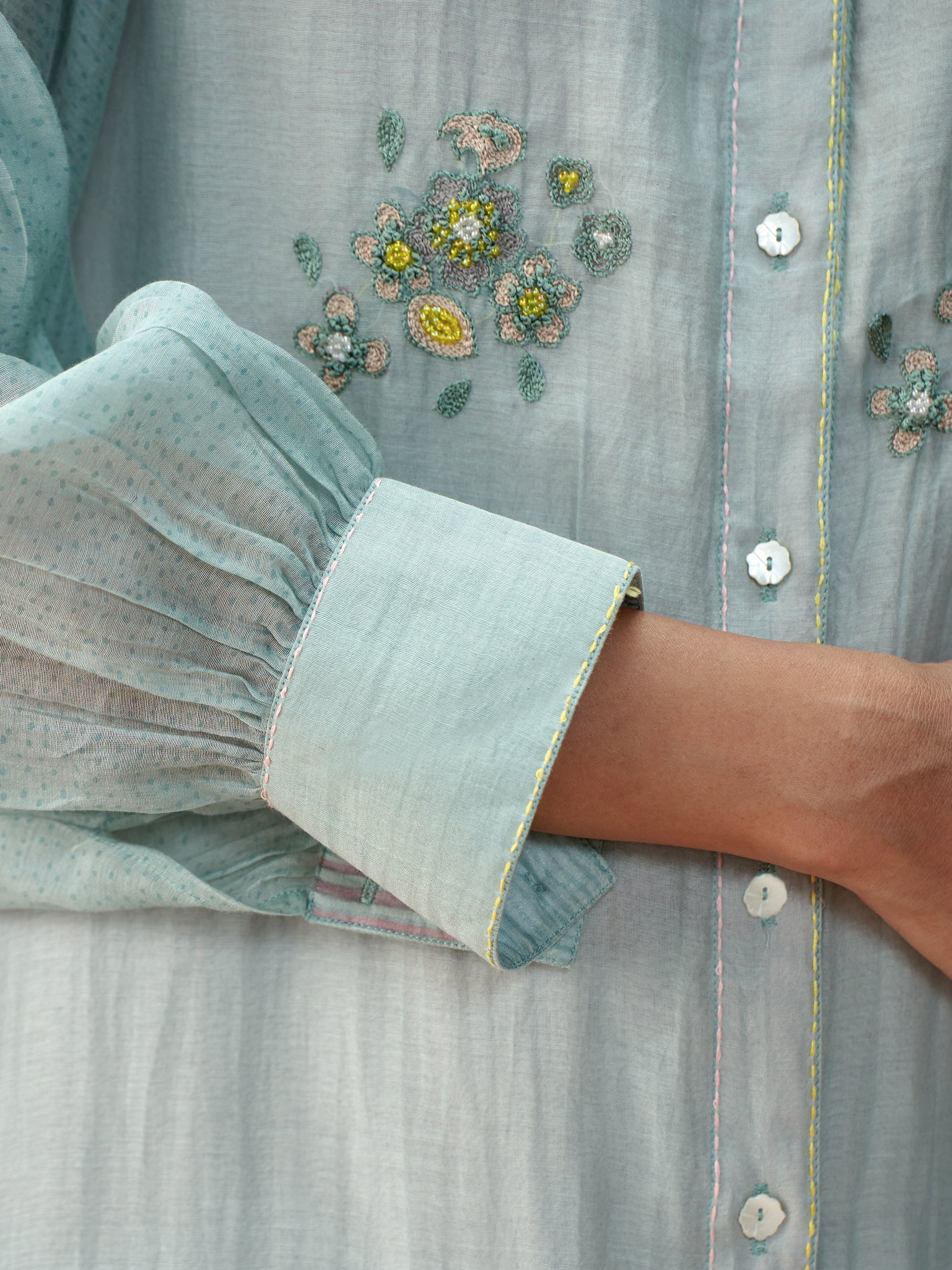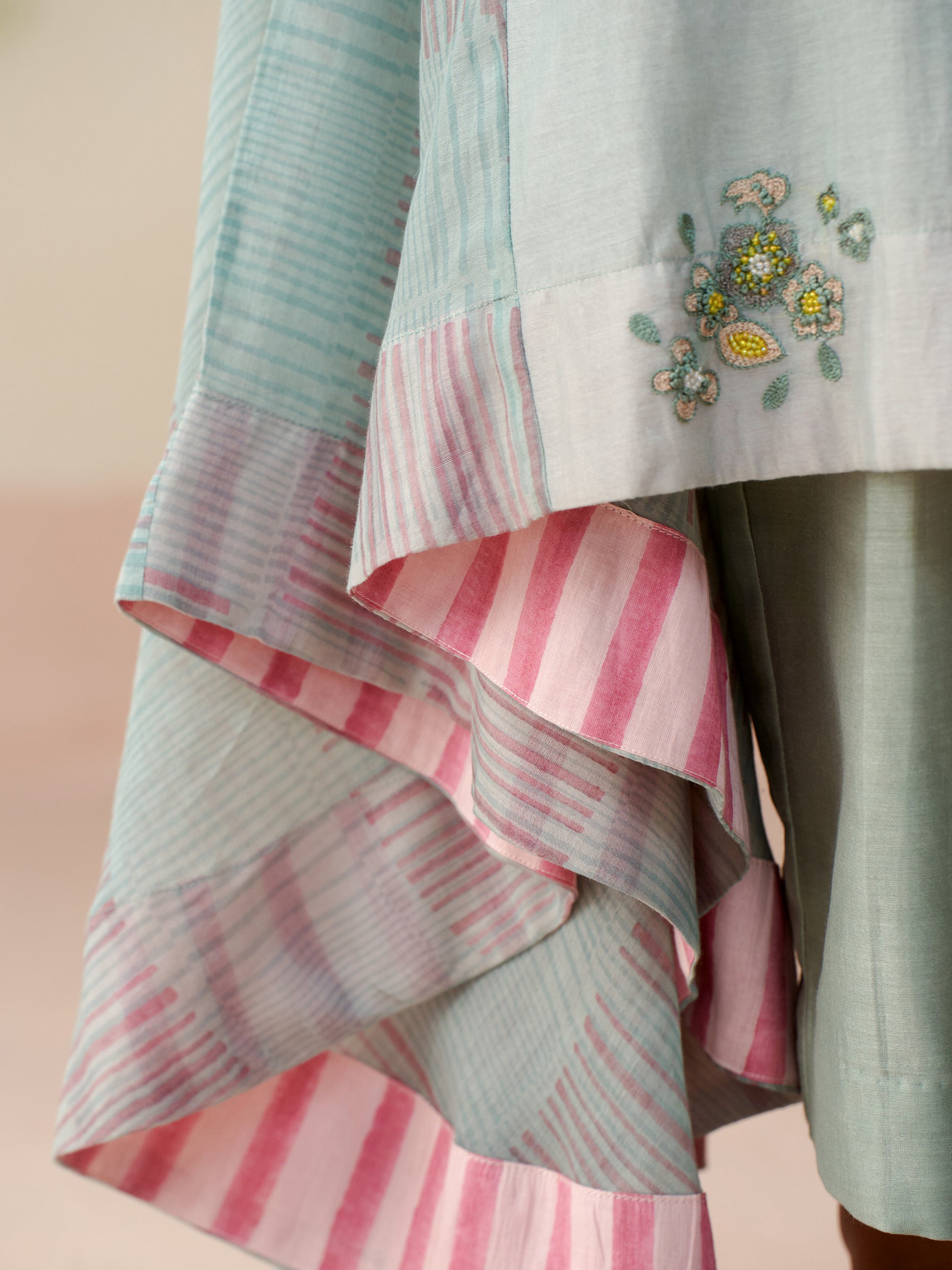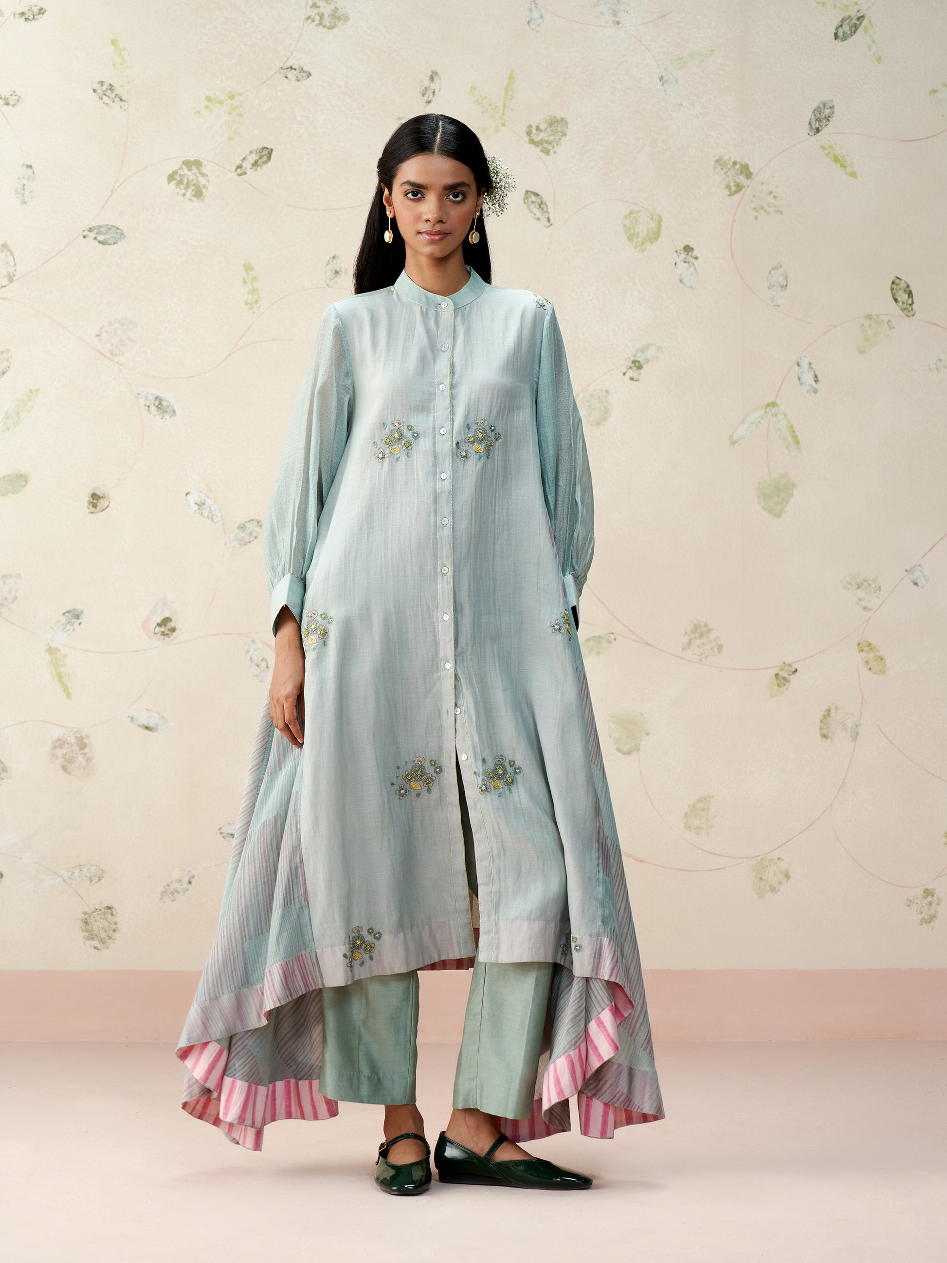 A relaxed A-line silhouette in handwoven mul chanderi, this powder blue kurta features delicate hand-embroidered floral motifs and gathered sheer sleeves. The uneven, flowy hem is highlighted with hand block printed stripes for a playful touch. Paired with straight chanderi pants, it’s an effortless blend of elegance and ease.