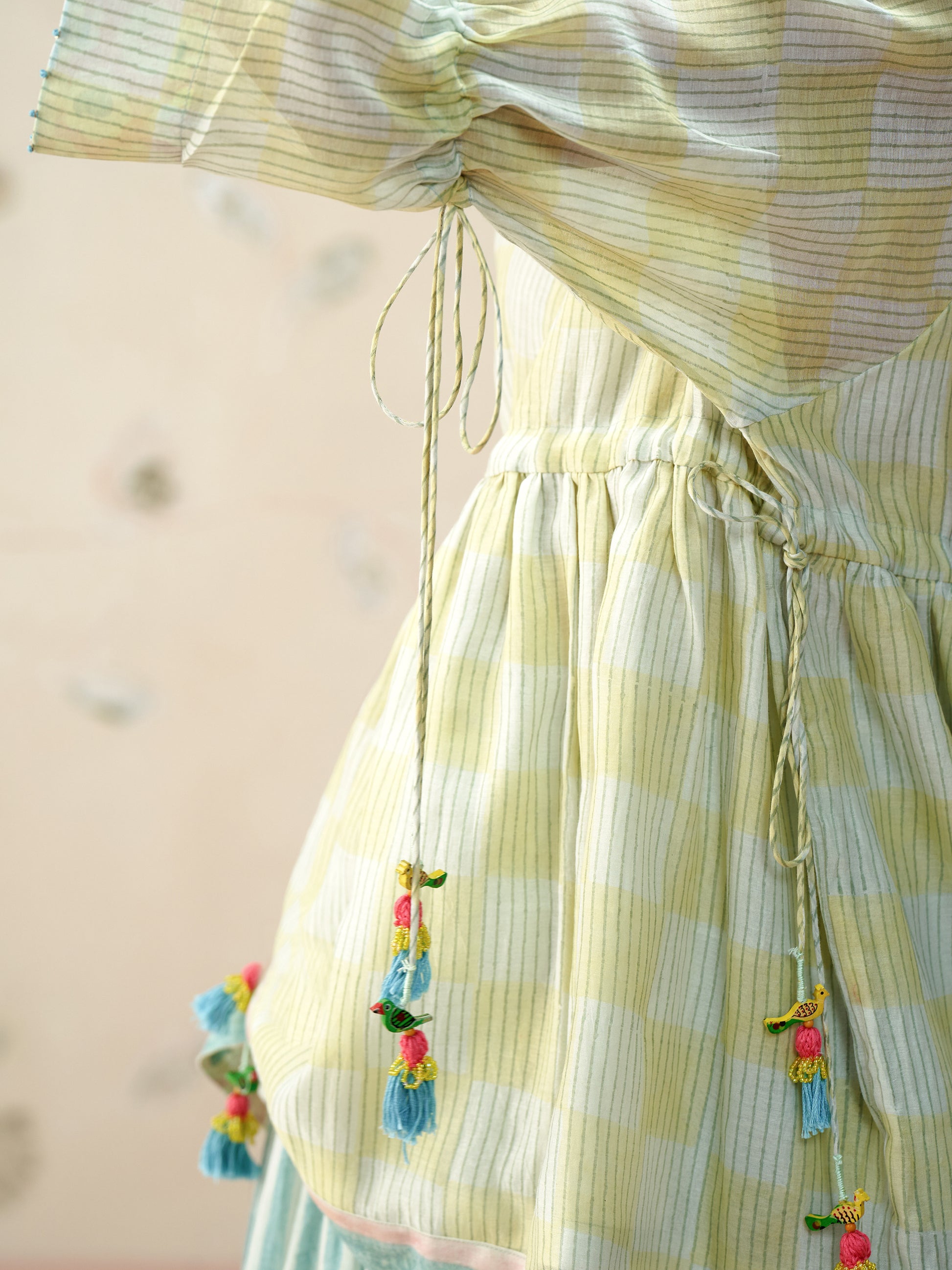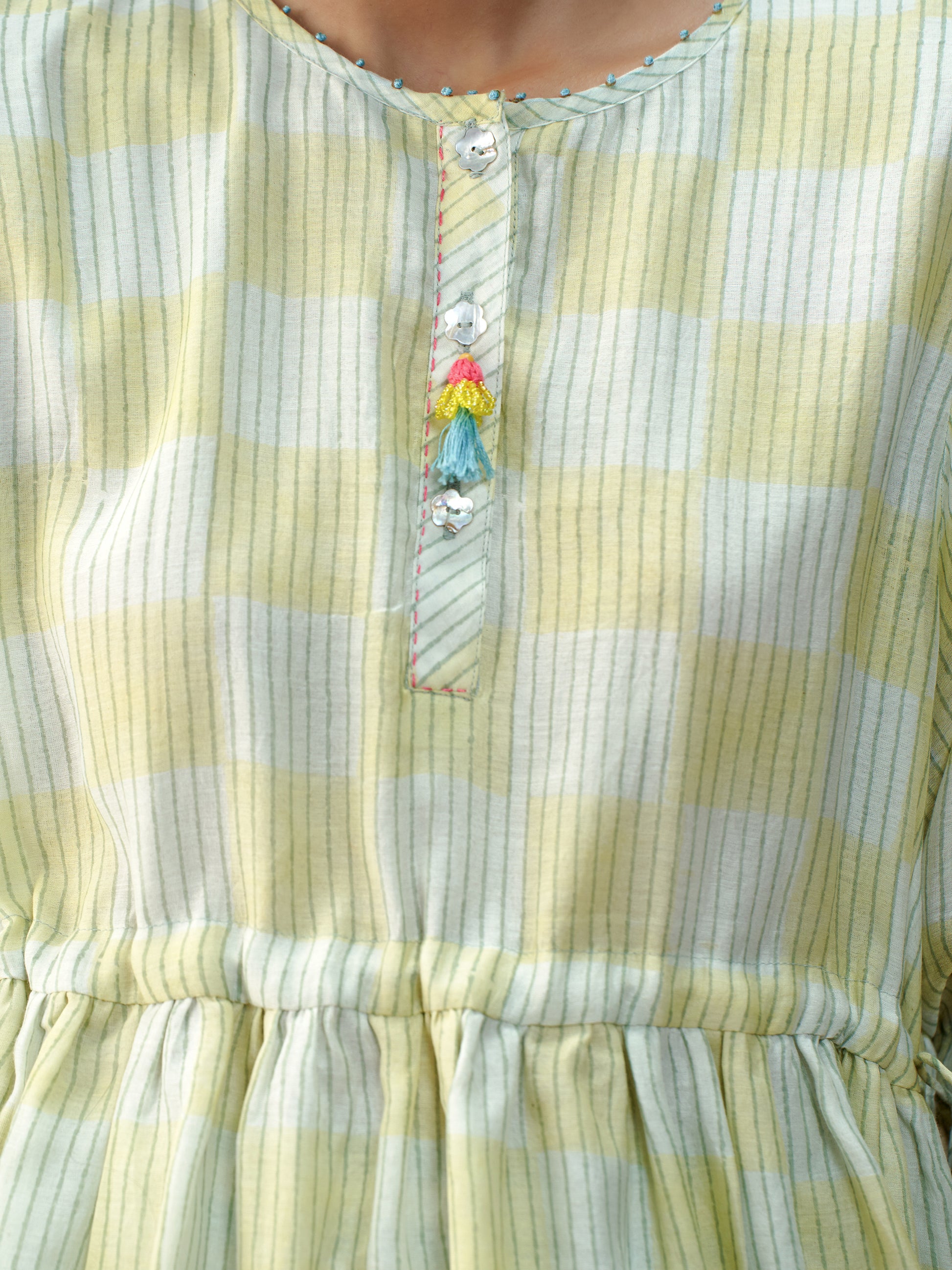 Crafted from soft, breathable handwoven mul Chanderi, this relaxed-fit top features hand block printed checks in soothing blue tones. Detailed with gentle gathers, adjustable drawstrings, and playful handcrafted tassels for effortless charm.