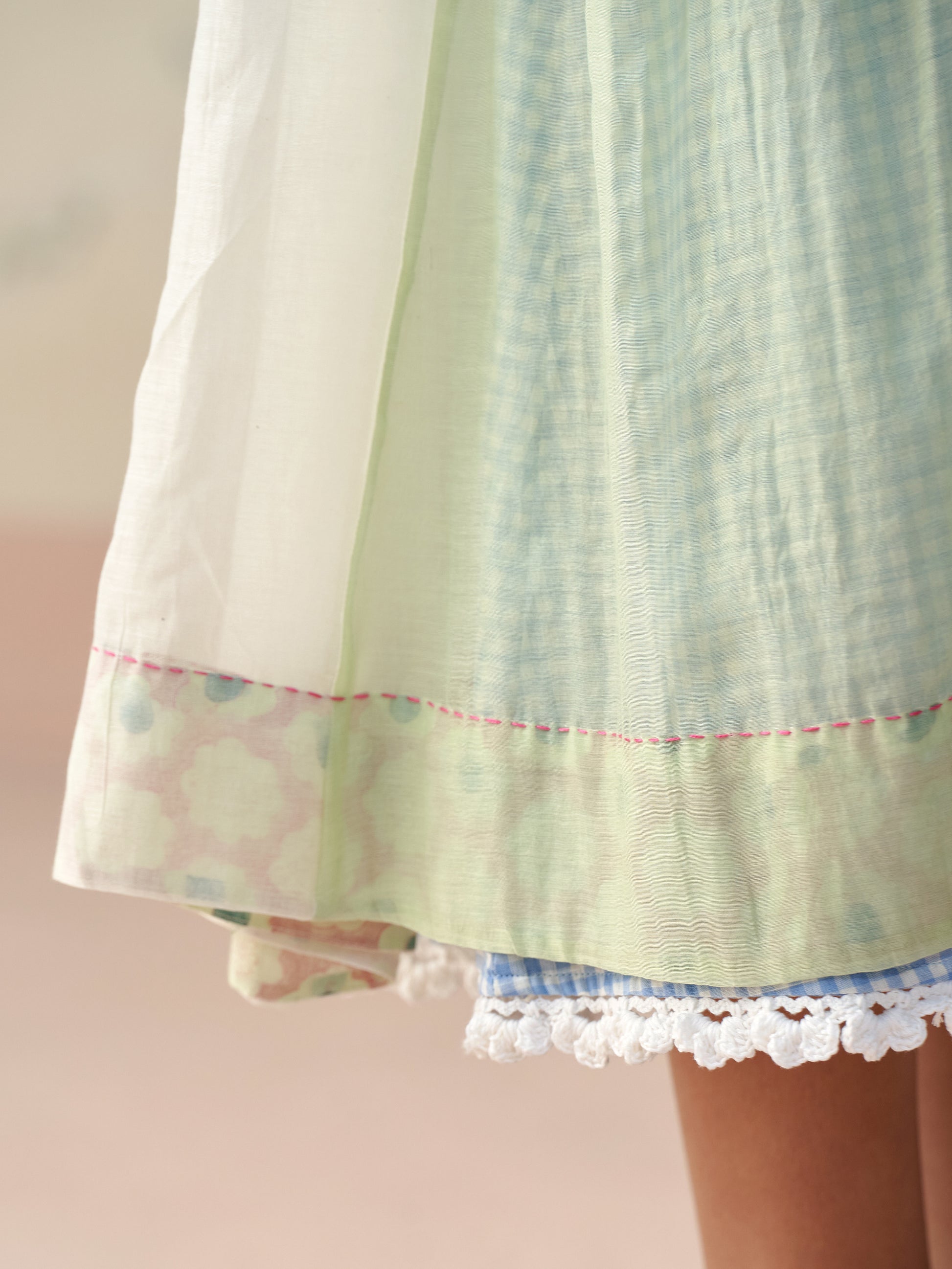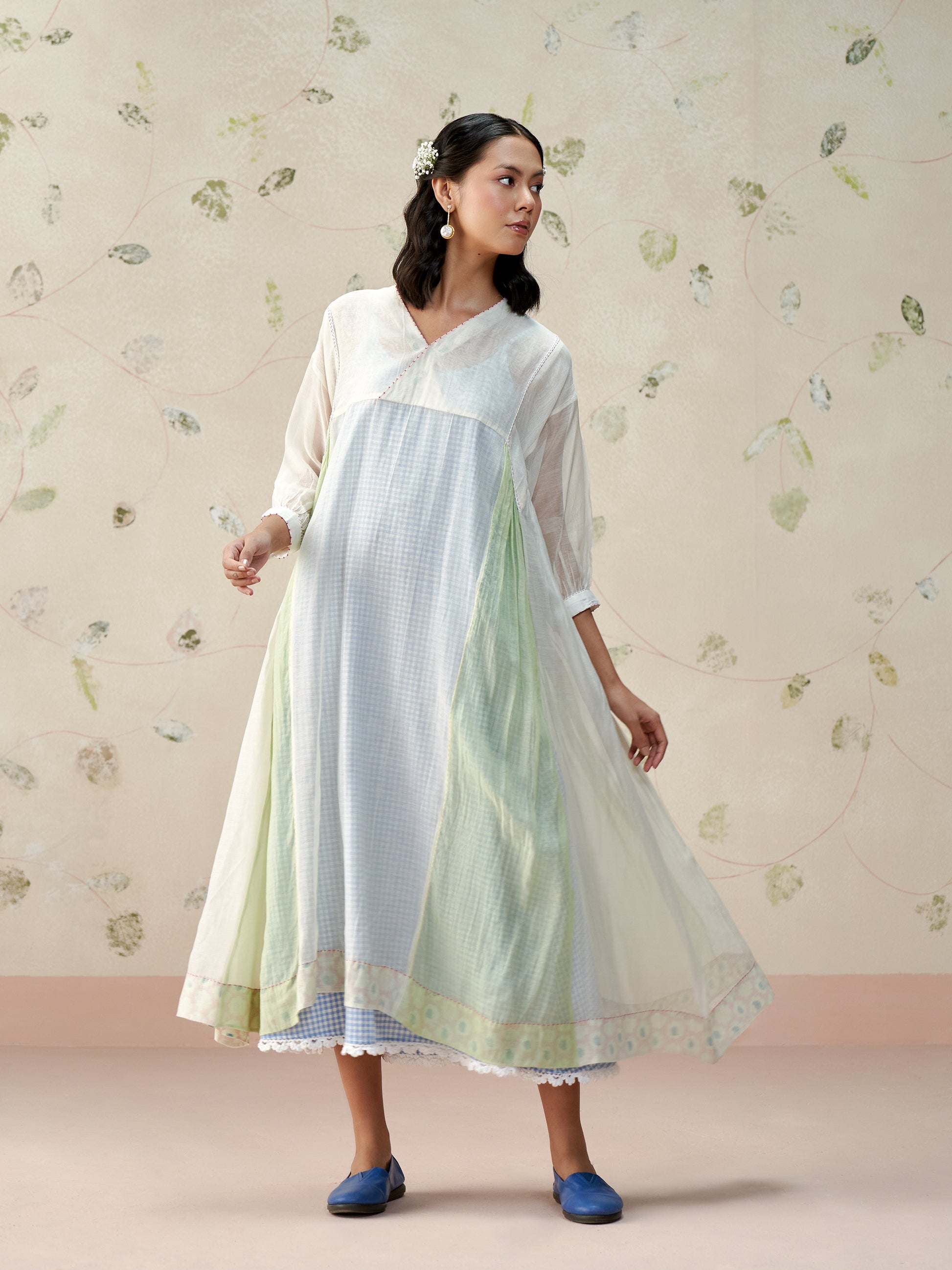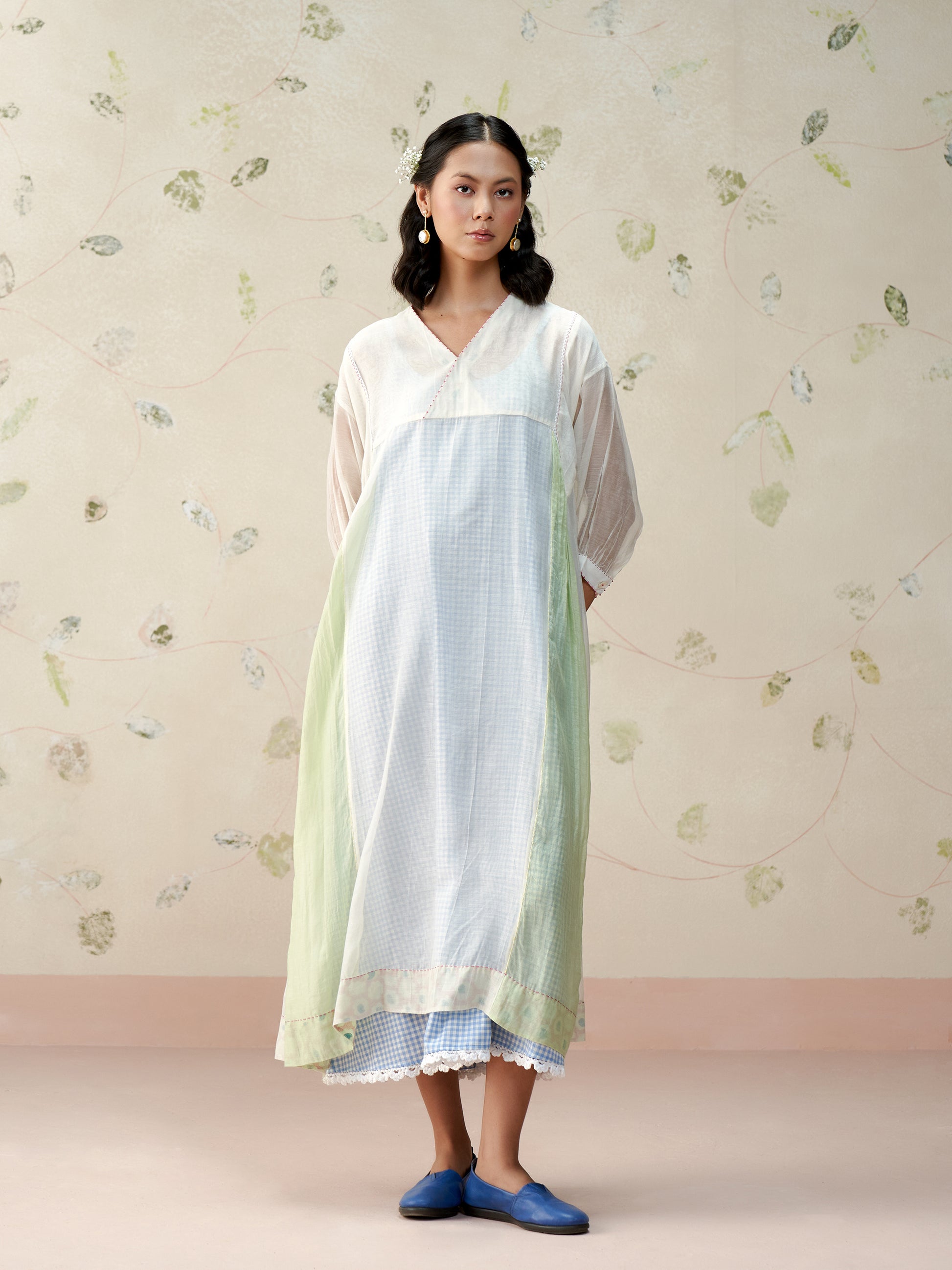 Flowy loose fitting dress in handwoven mul chanderi with contrast panelleing details paired with a handwoven cotton lining in chequered pattern and crochet details.