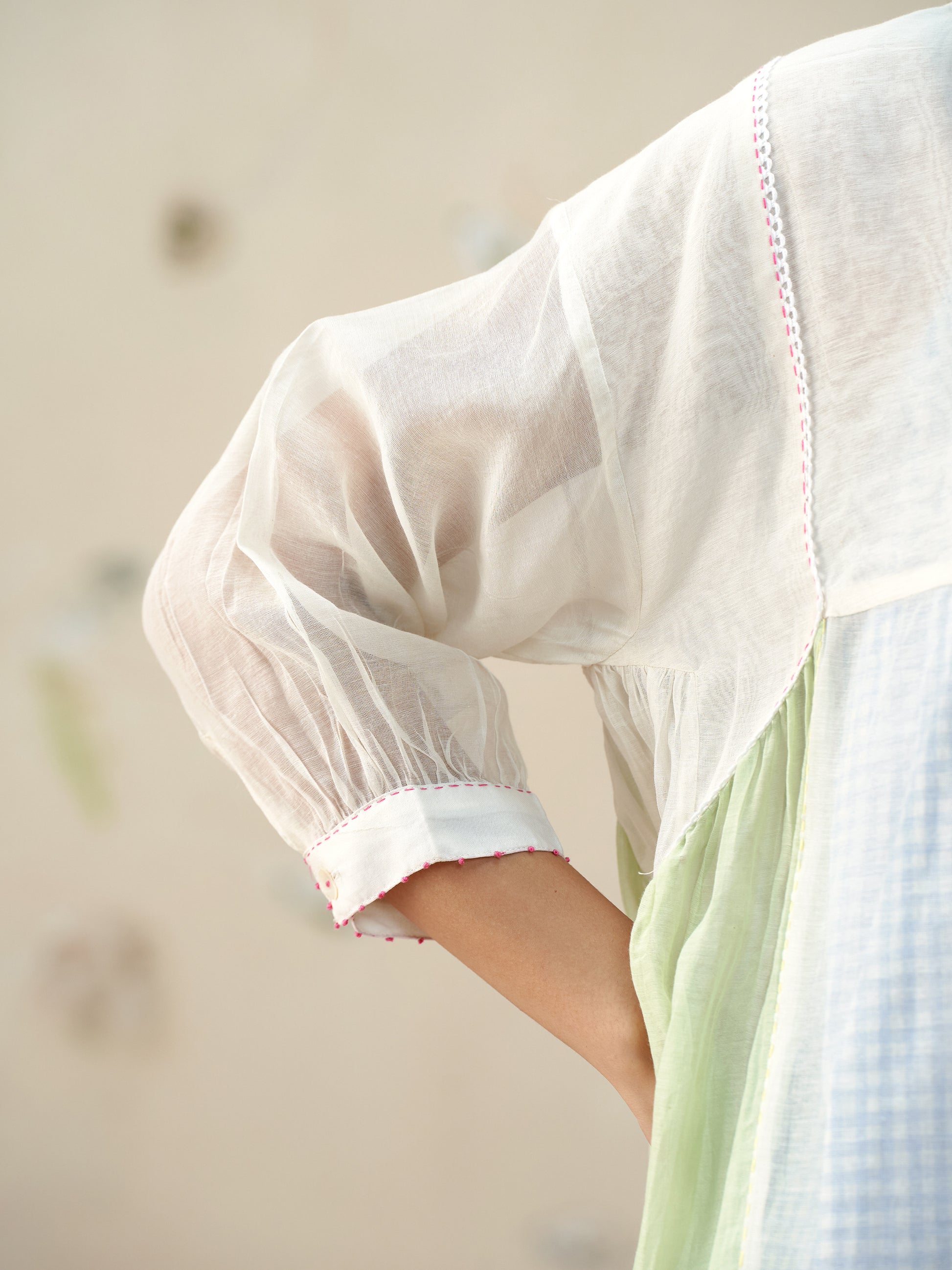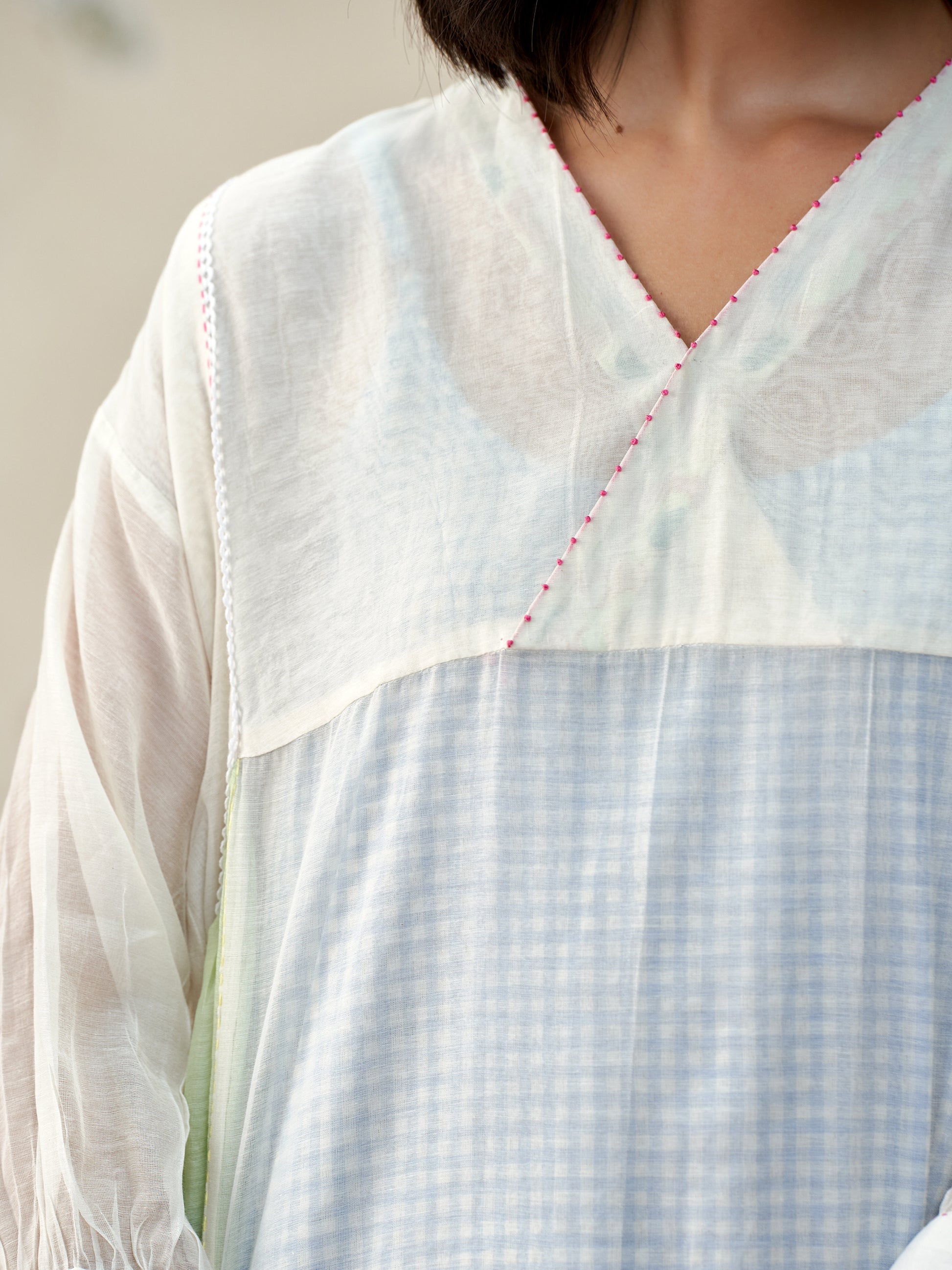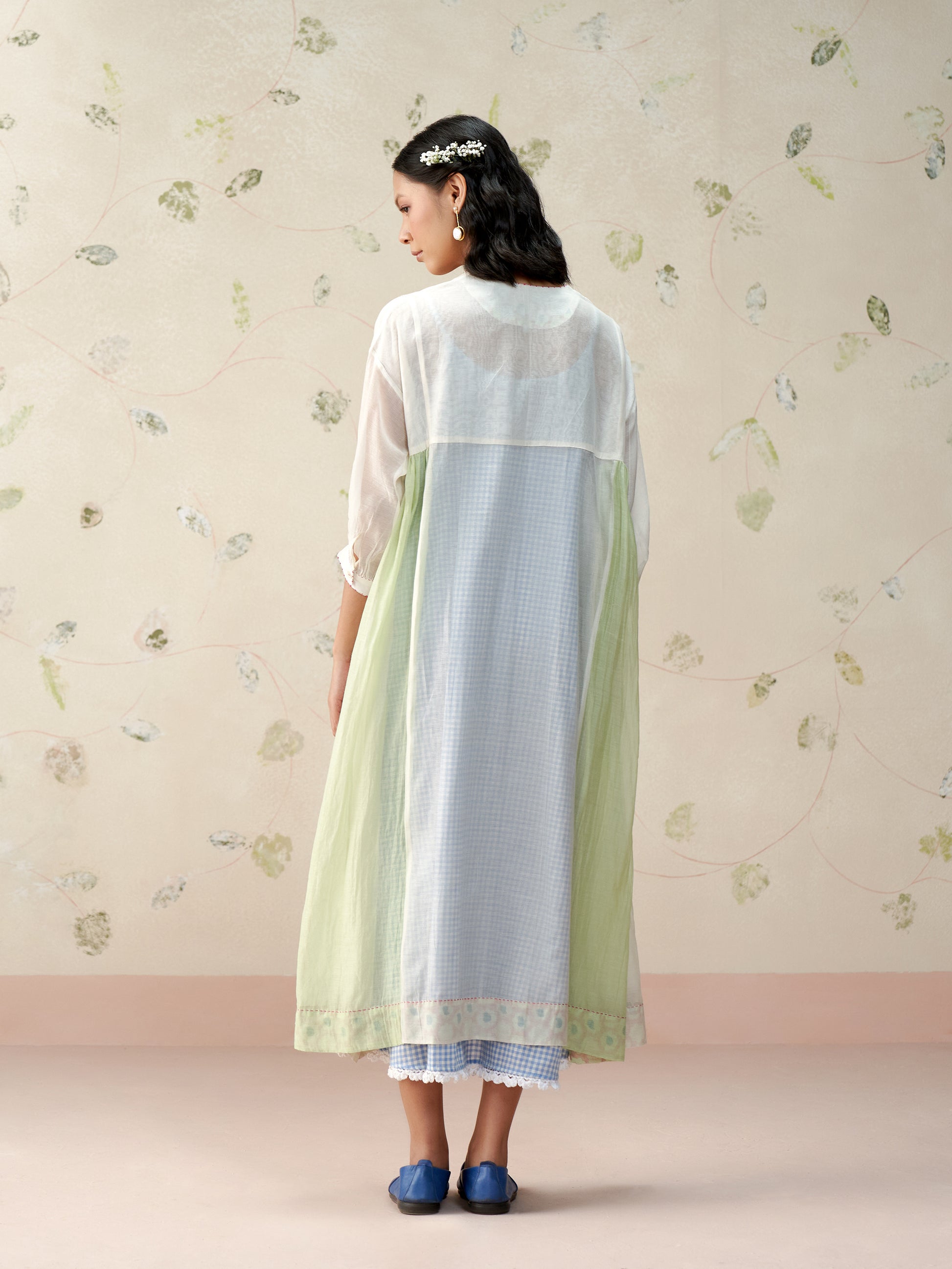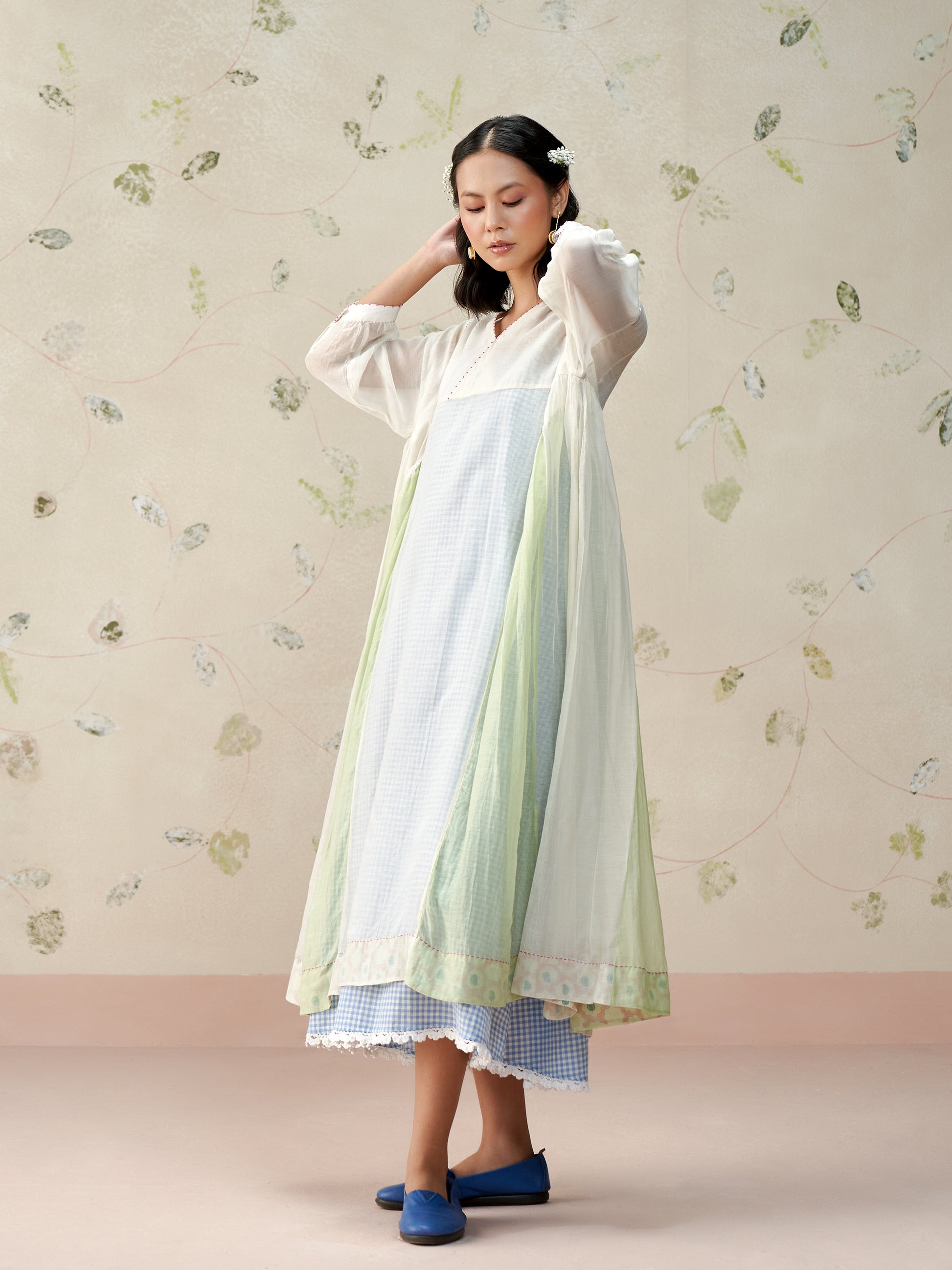 Flowy loose fitting dress in handwoven mul chanderi with contrast panelleing details paired with a handwoven cotton lining in chequered pattern and crochet details.