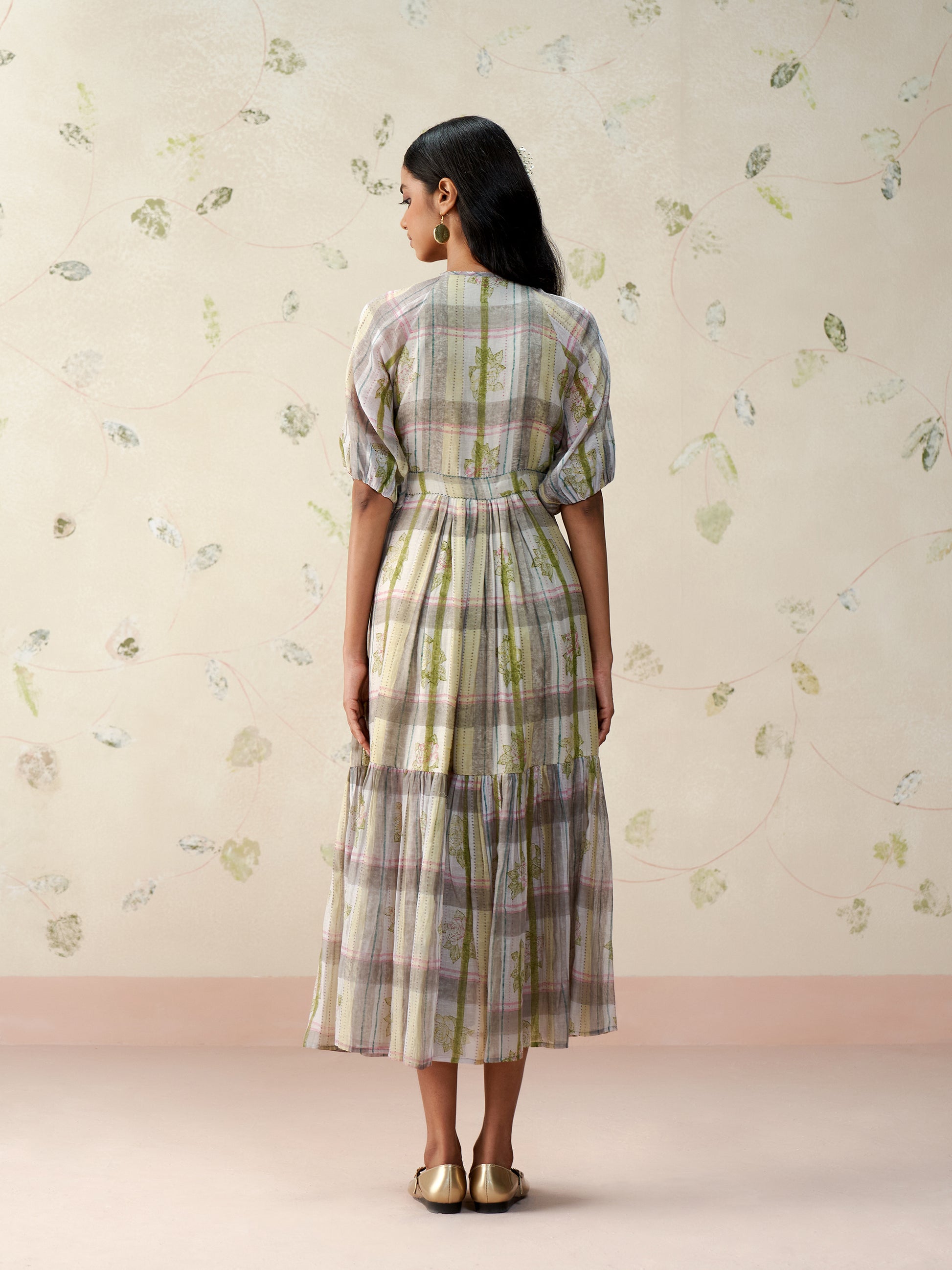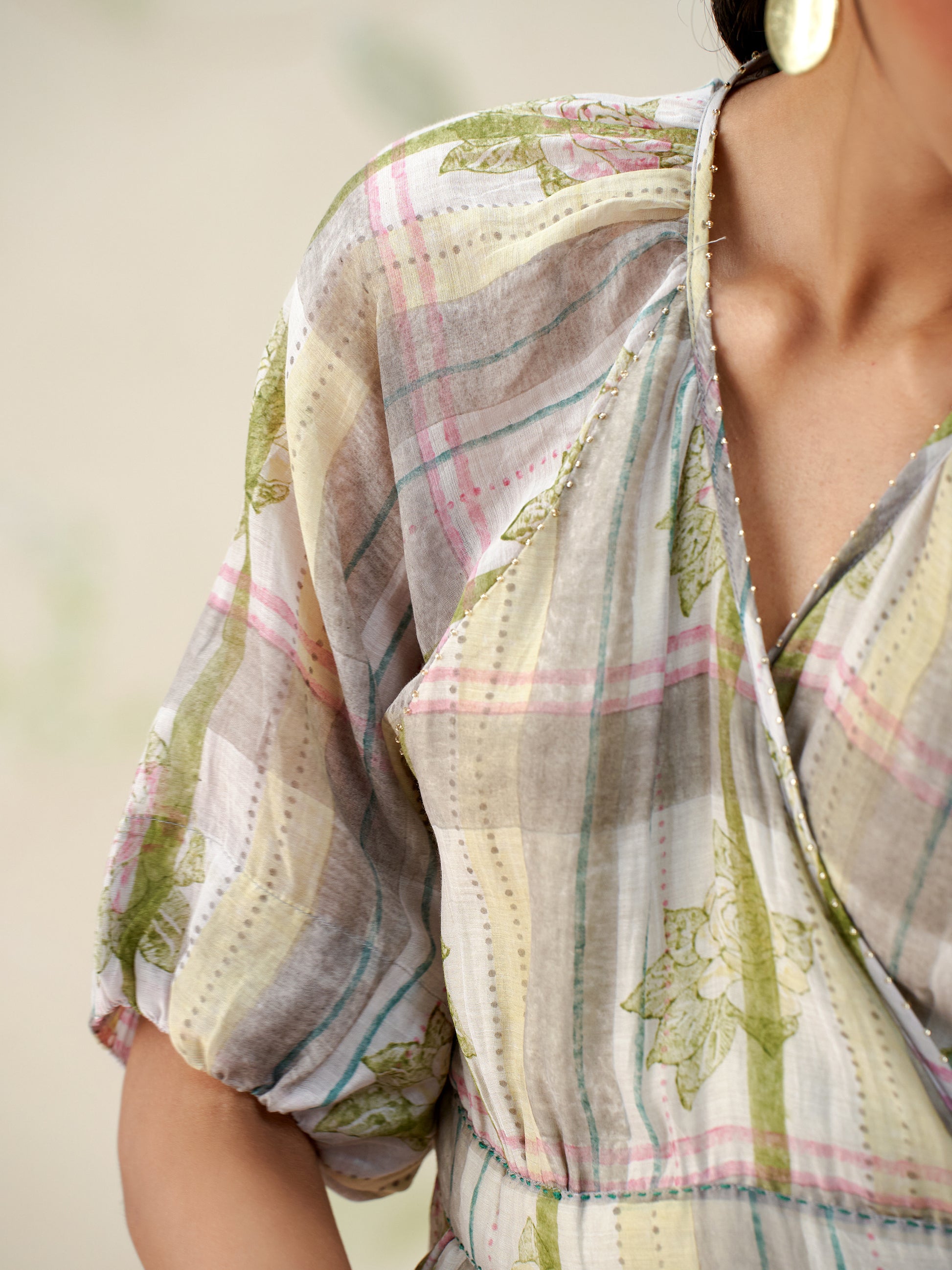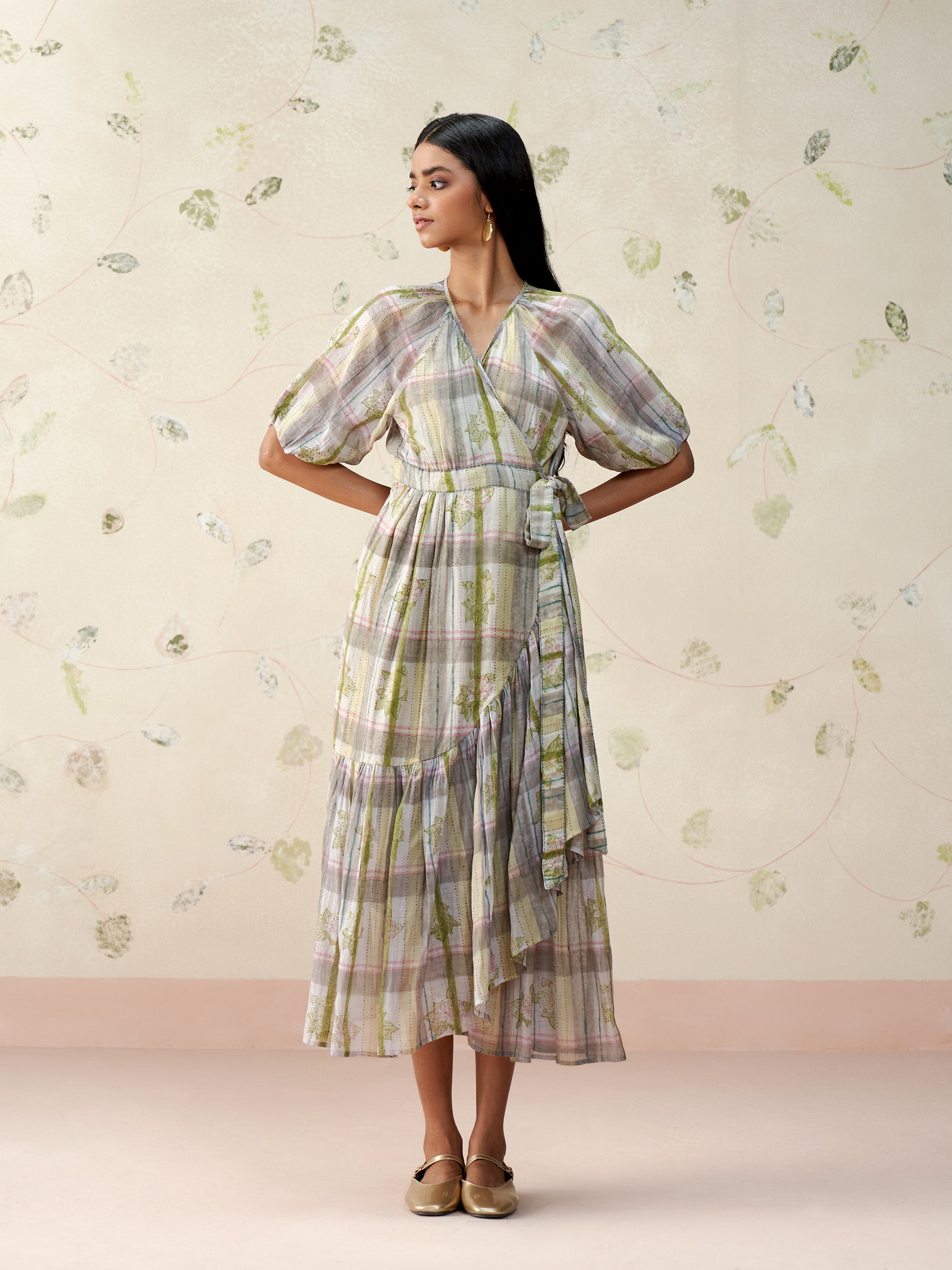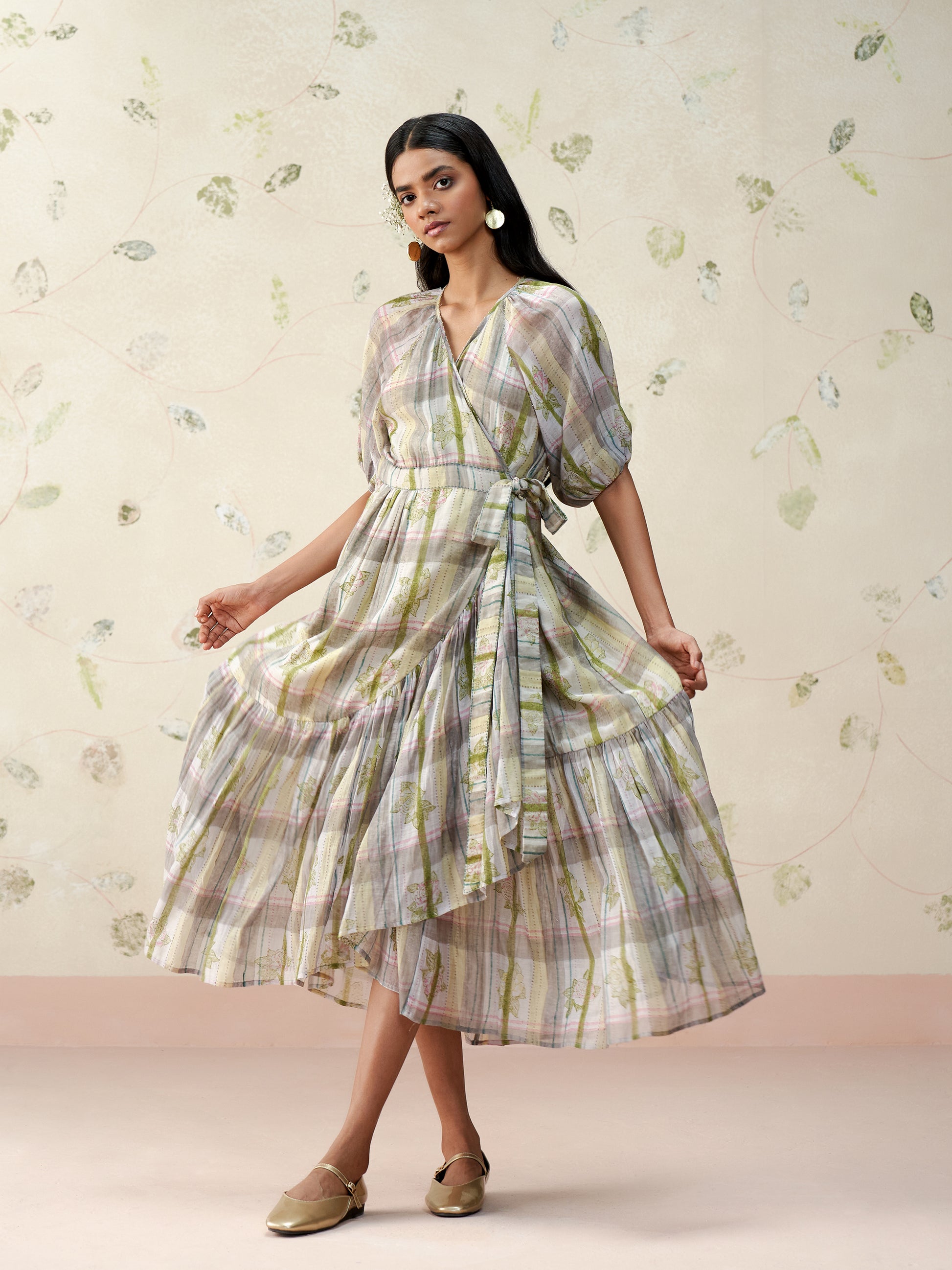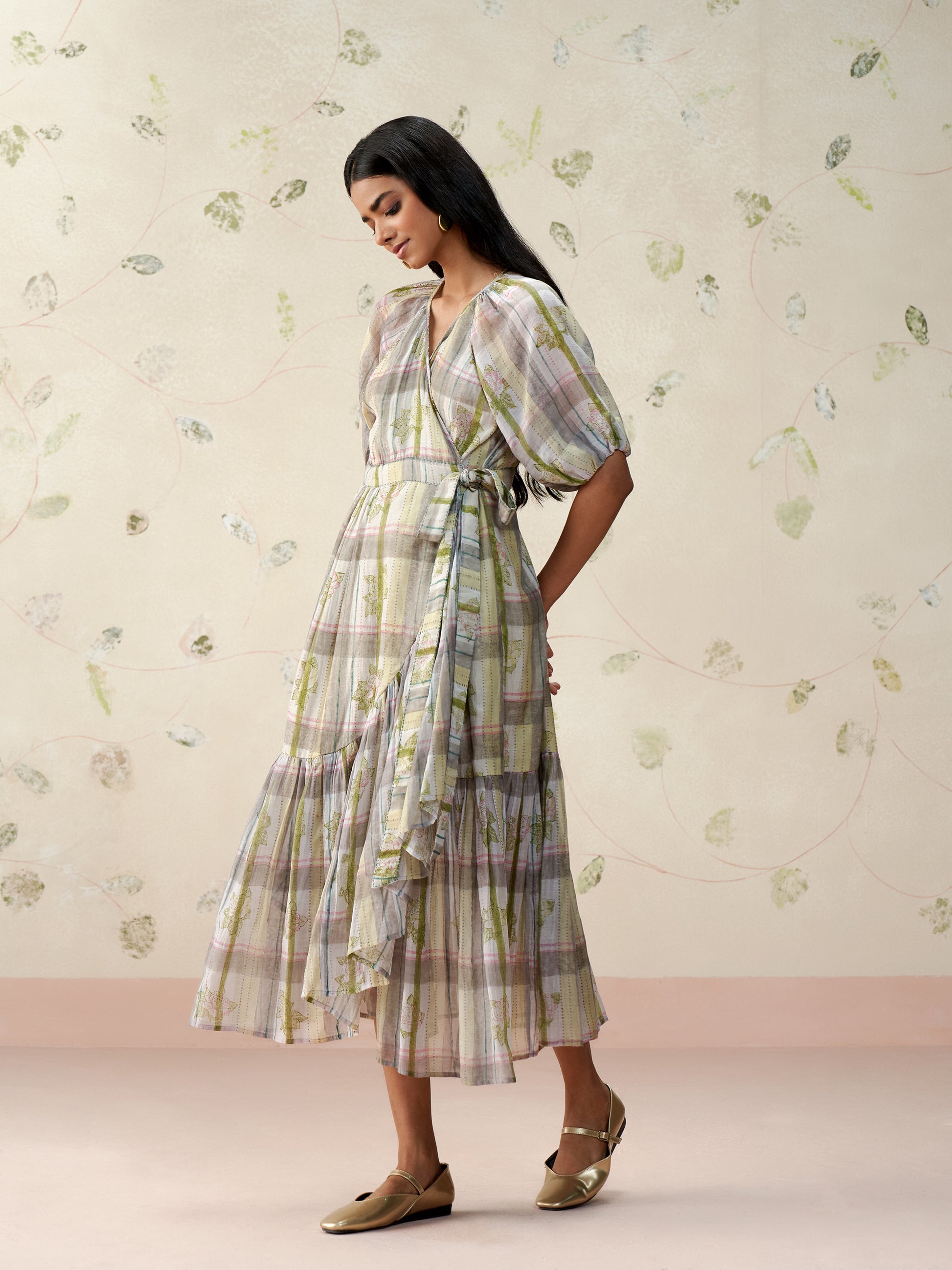 Wrap dress crafted in handwoven mul Chanderi featuring a rose chequered hand block printed pattern. Designed with a gathered neckline, elbow-length sleeves, and a tiered hem for graceful movement. Adjustable waist tie for a flexible fit, finished with a cotton lining for comfort.