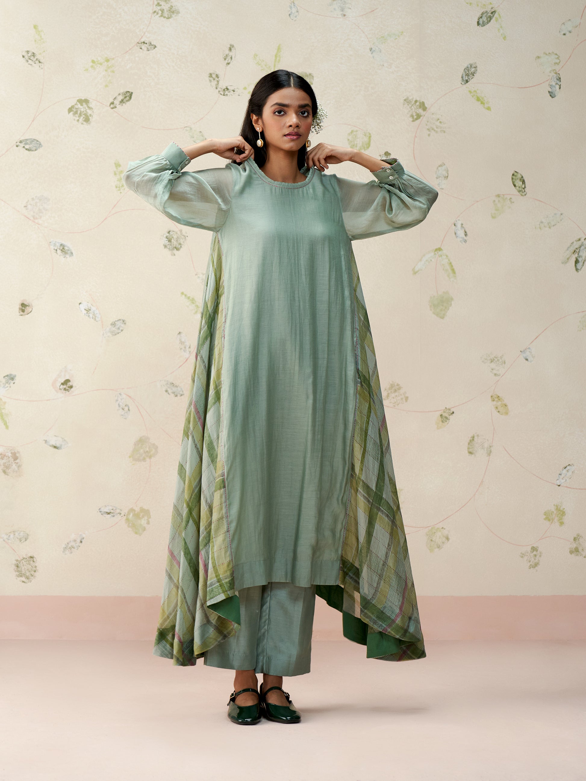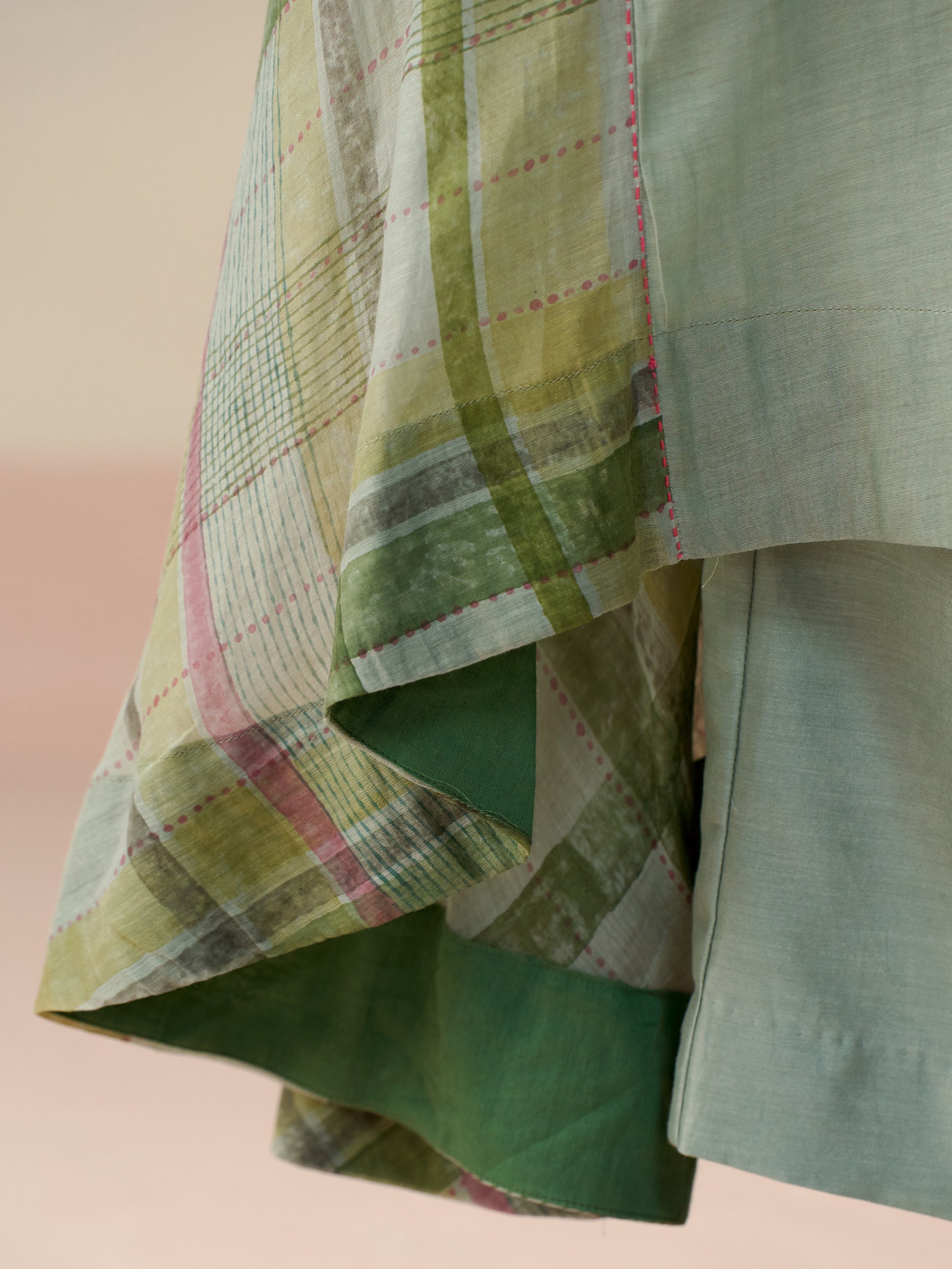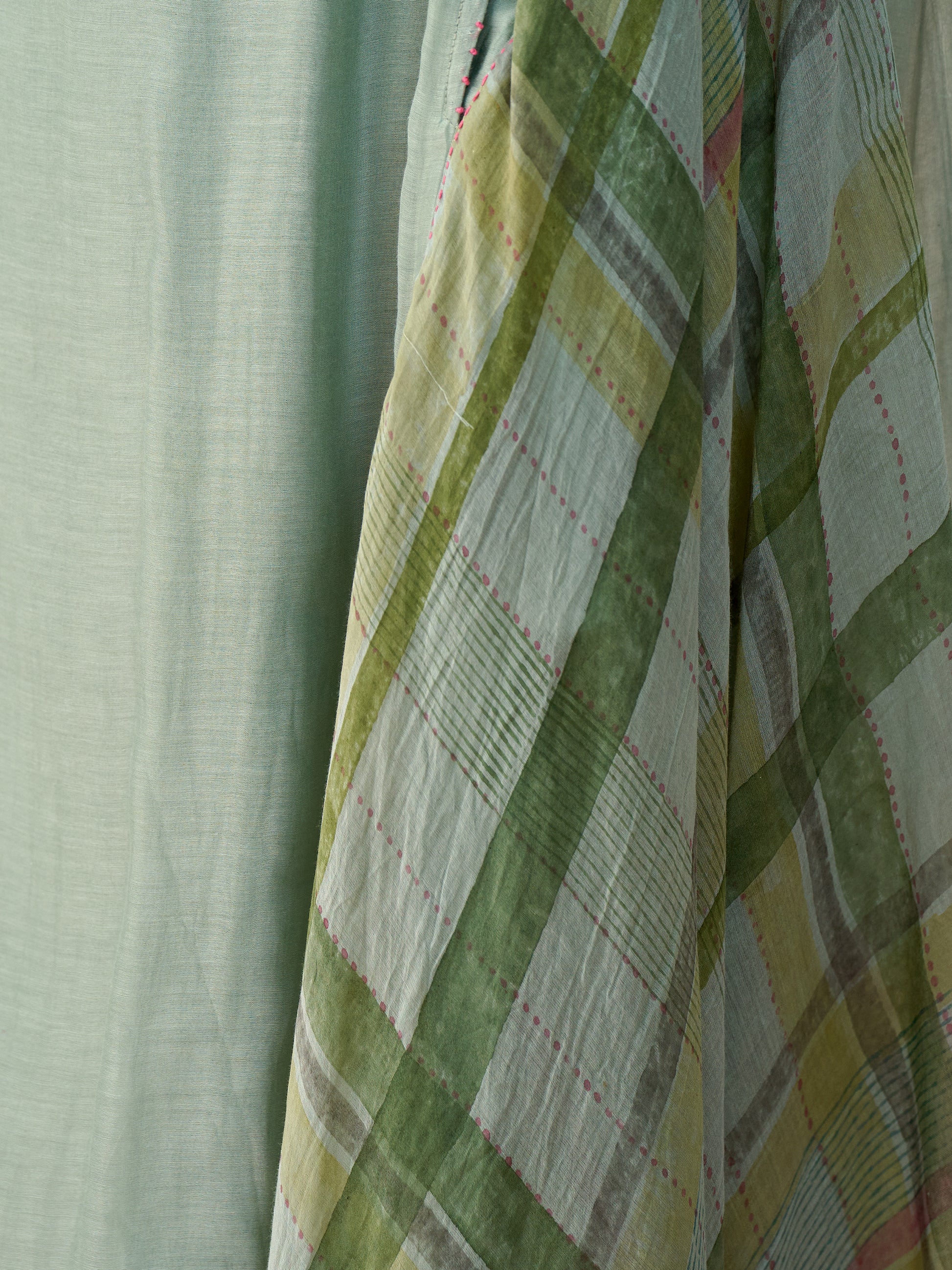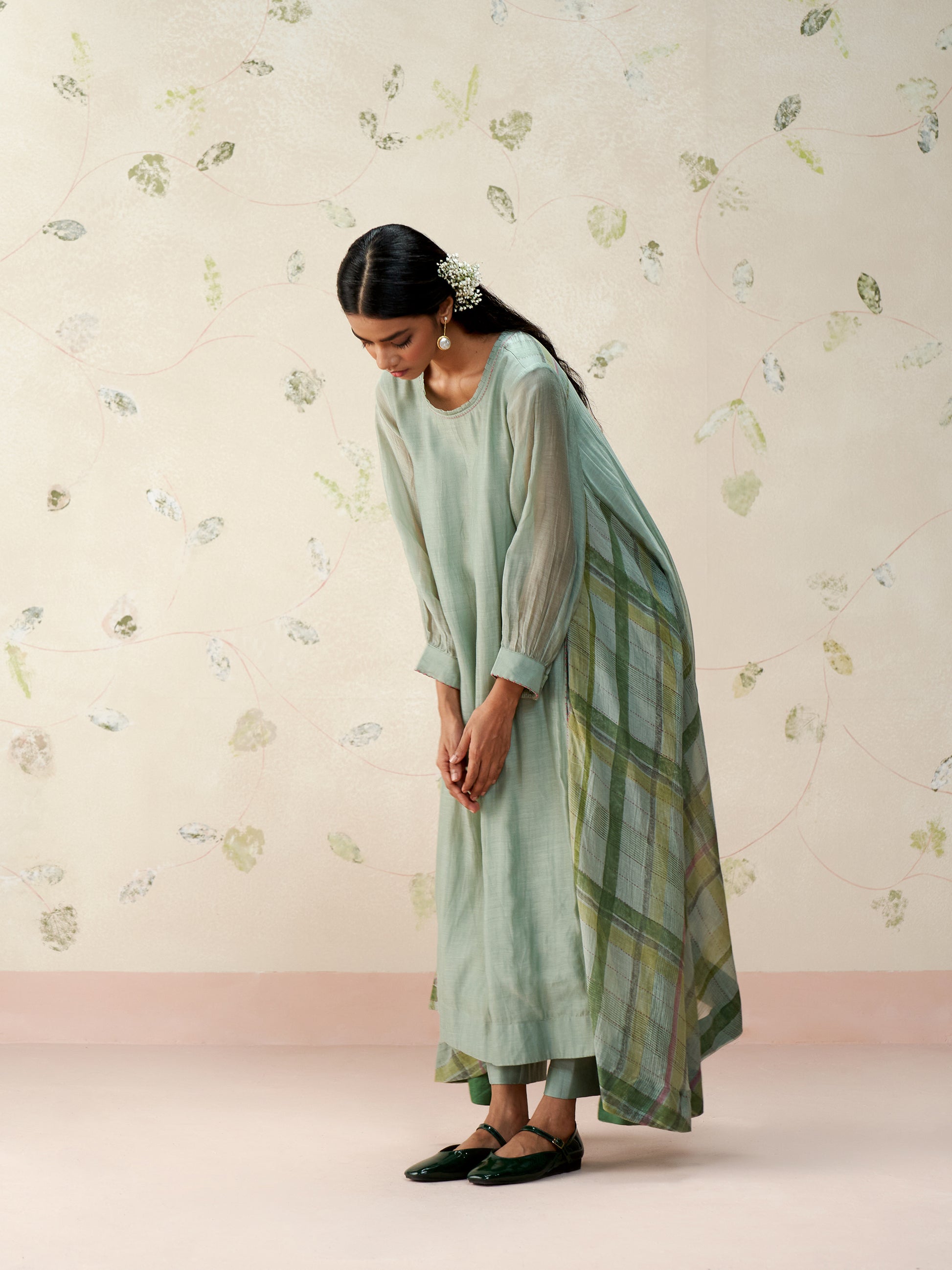 A breezy, relaxed-fit kurta set crafted in soft handwoven mul chanderi. Features hand block printed checkered kalis with floral motifs in a soft English palette. Finished with pleated details at the neckline and an inverted back pleat for ease and elegance. Paired with matching straight pants and a lightweight mul chanderi dupatta featuring hand block printed checks and floral motifs. Accented with a fresh contrast border and finished with delicate hand made tassels.
