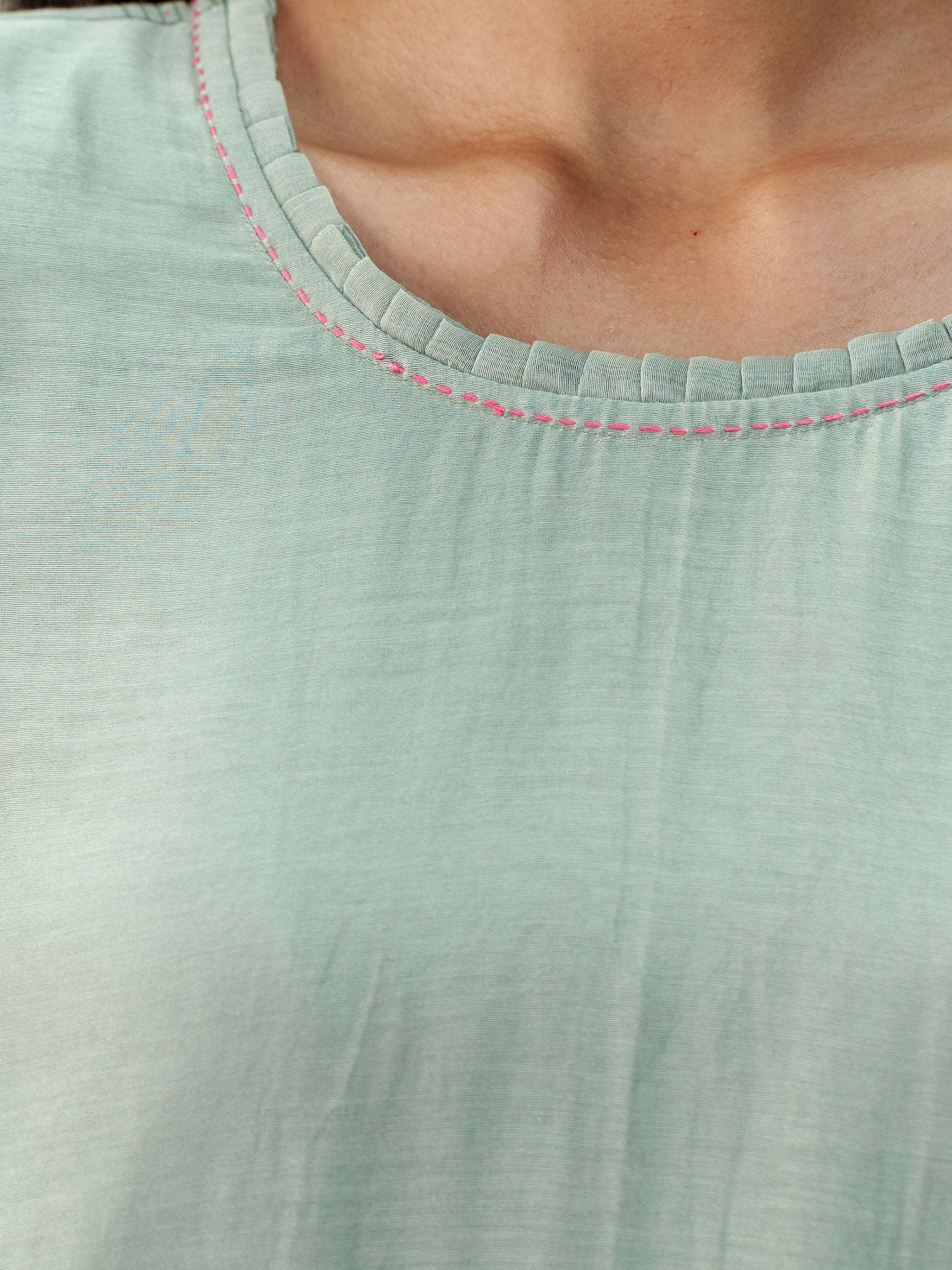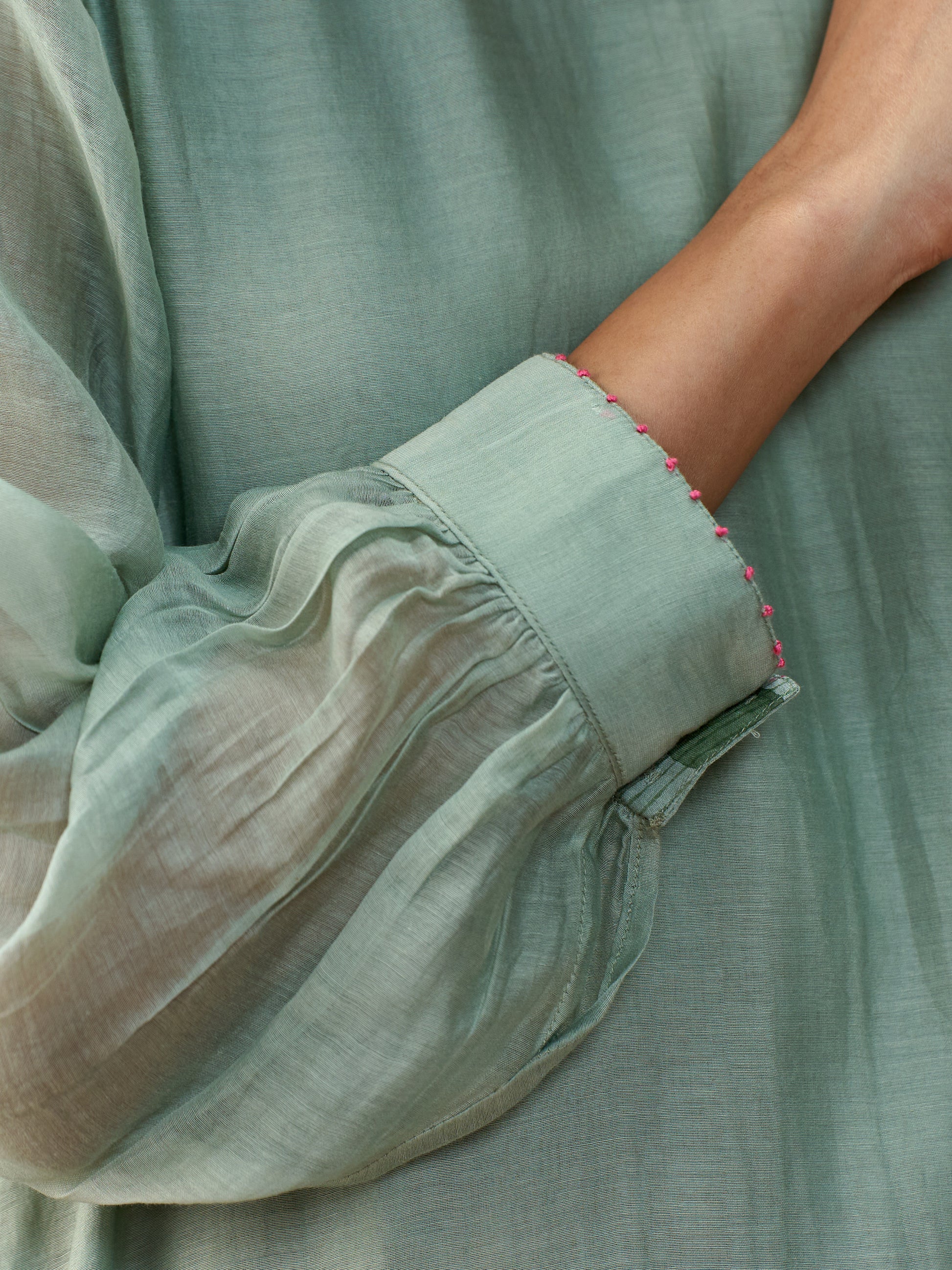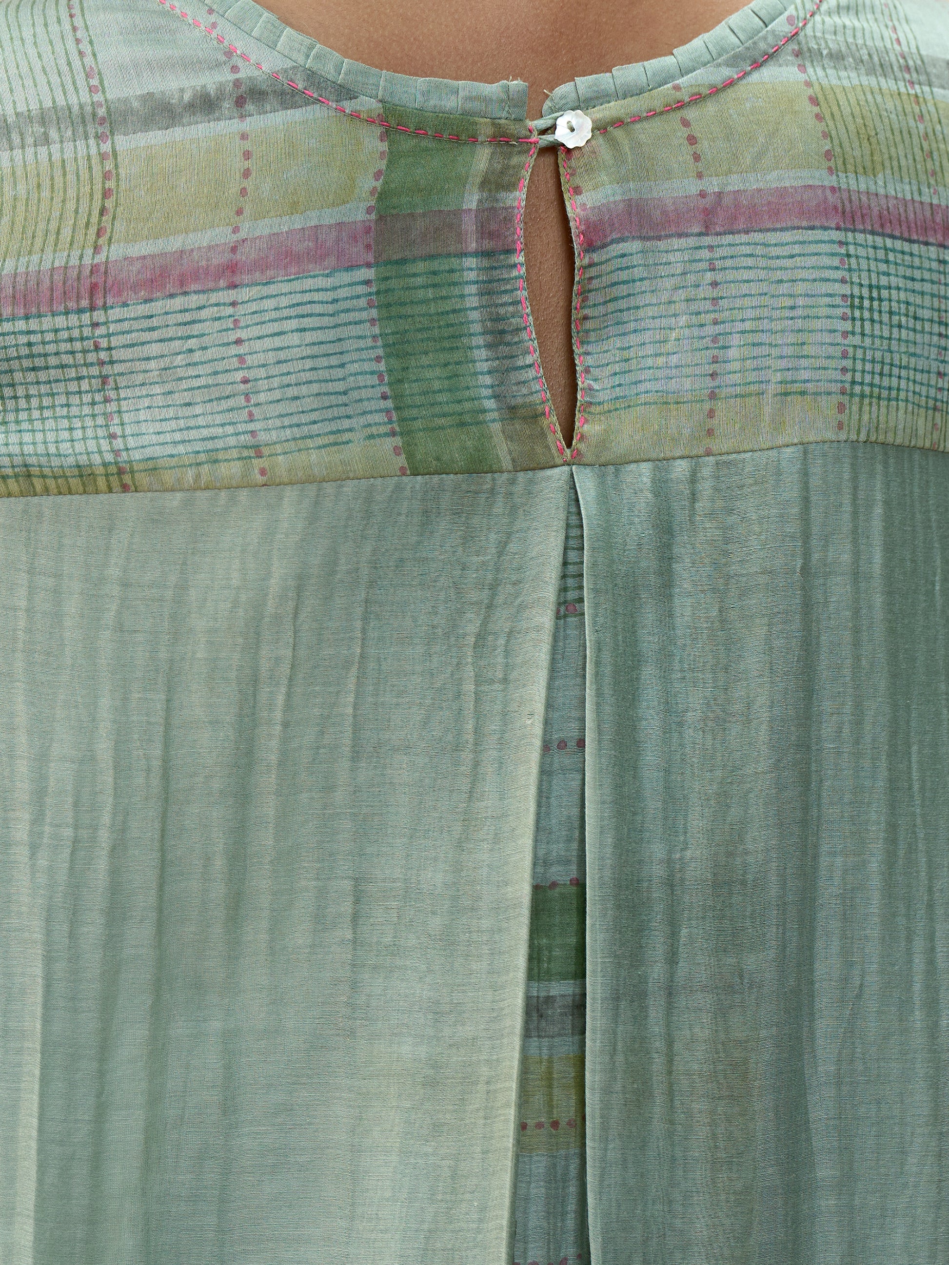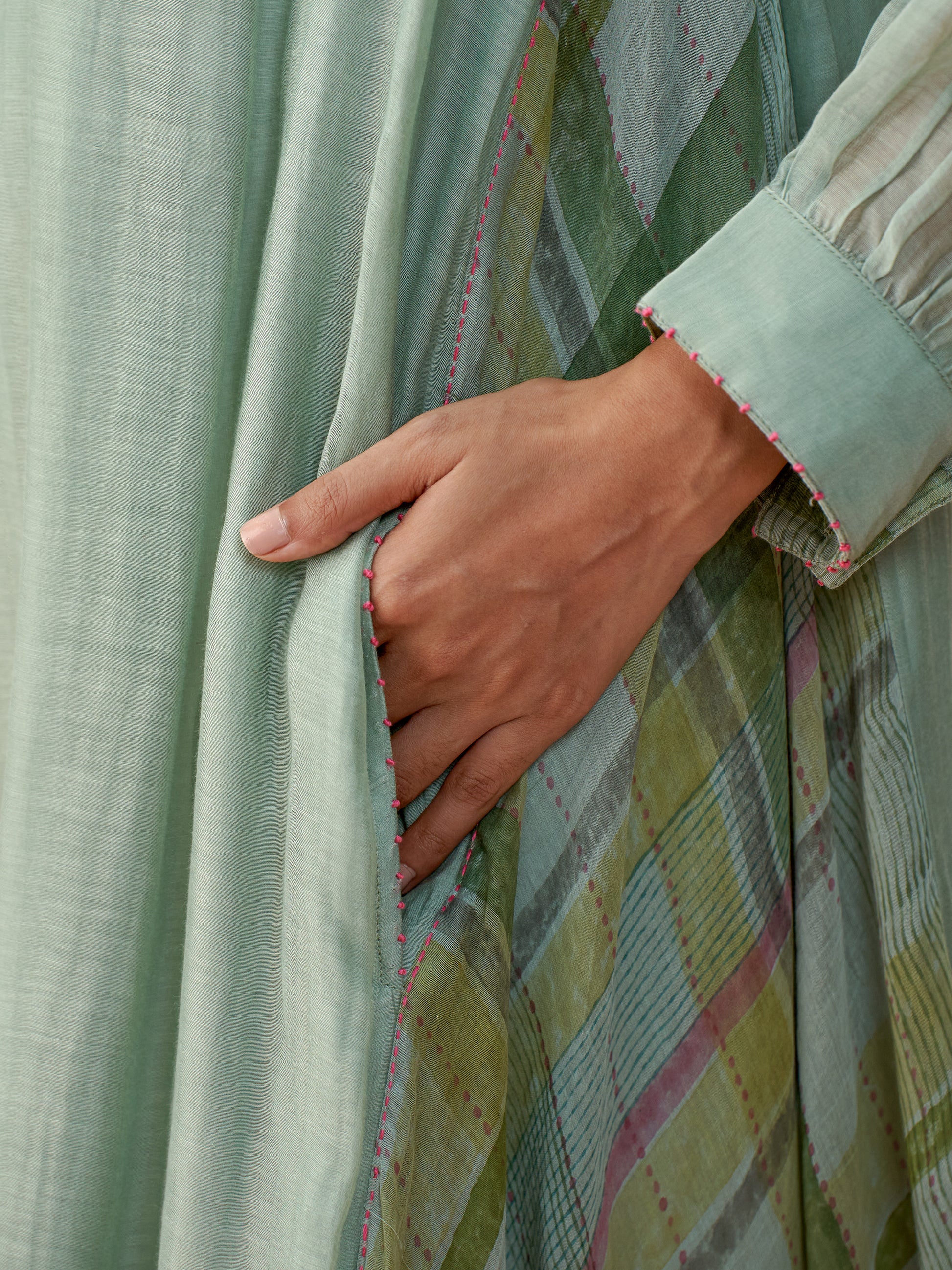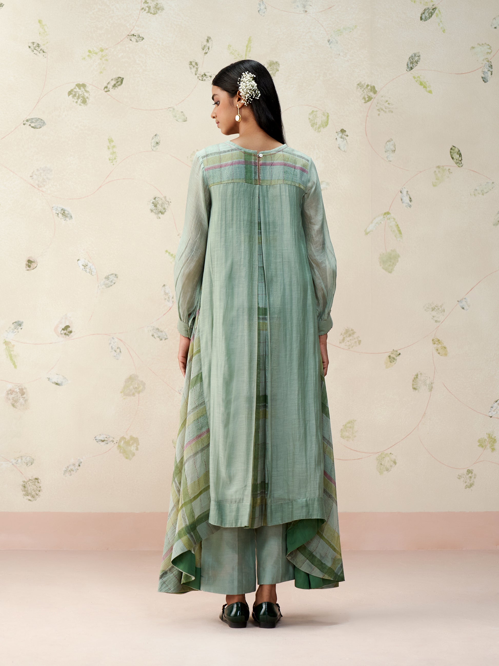 A breezy, relaxed-fit kurta set crafted in soft handwoven mul chanderi. Features hand block printed checkered kalis with floral motifs in a soft English palette. Finished with pleated details at the neckline and an inverted back pleat for ease and elegance. Paired with matching straight pants and a lightweight mul chanderi dupatta featuring hand block printed checks and floral motifs. Accented with a fresh contrast border and finished with delicate hand made tassels.