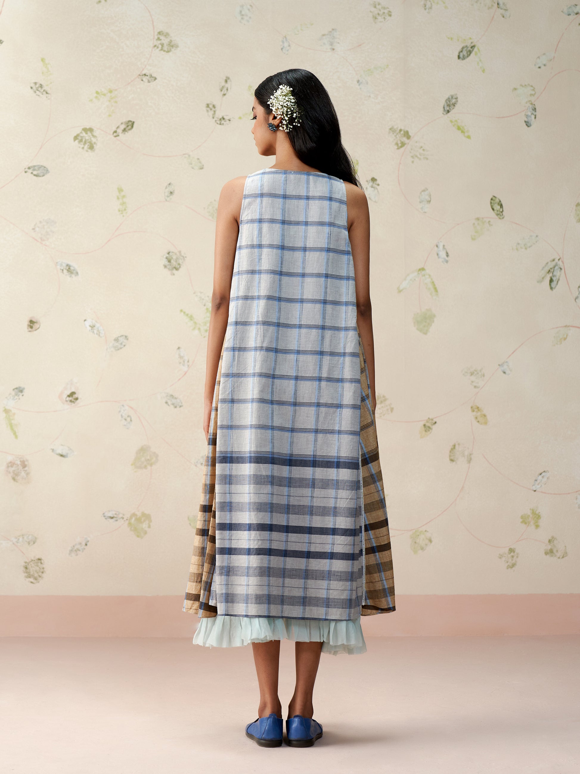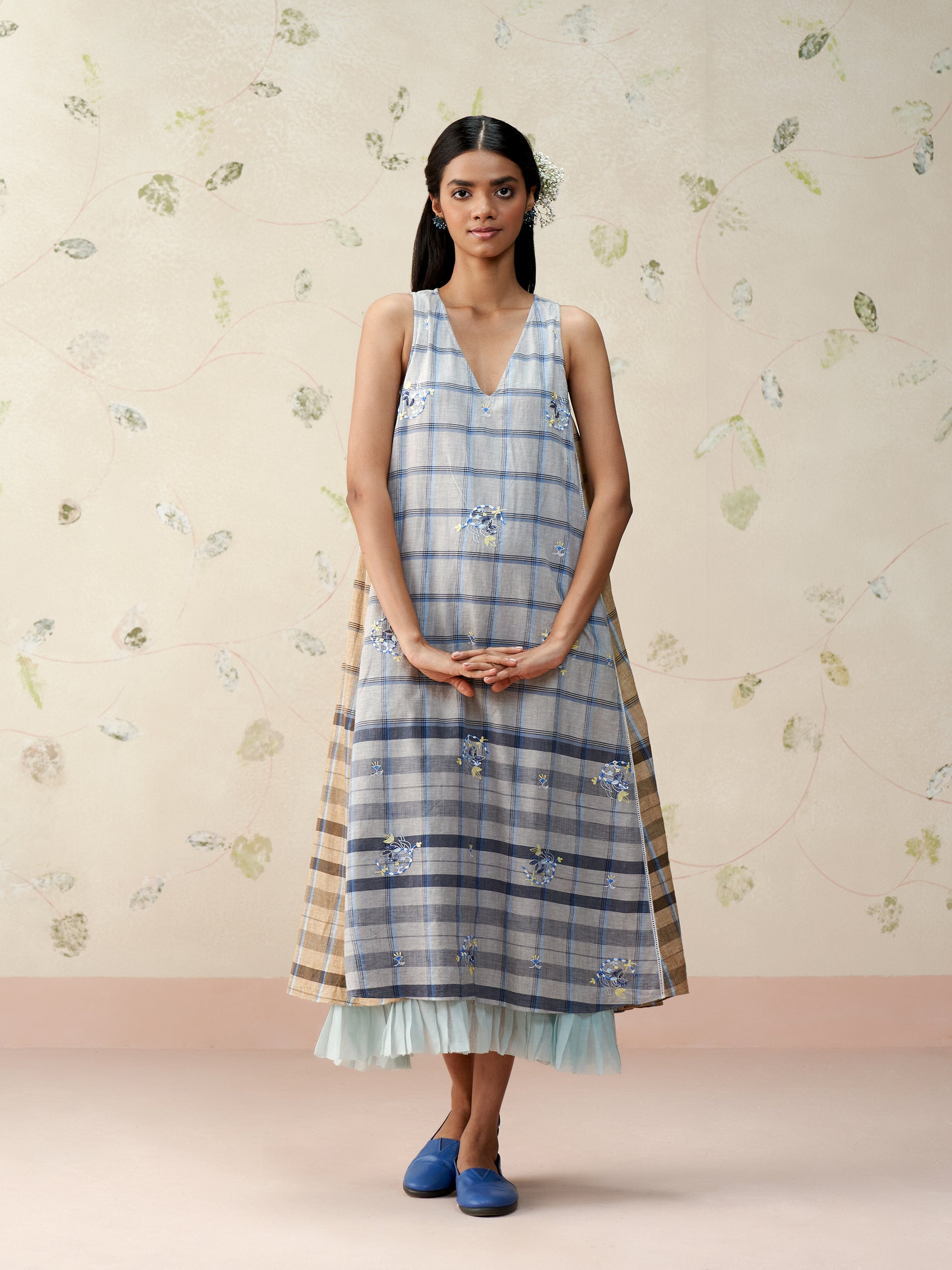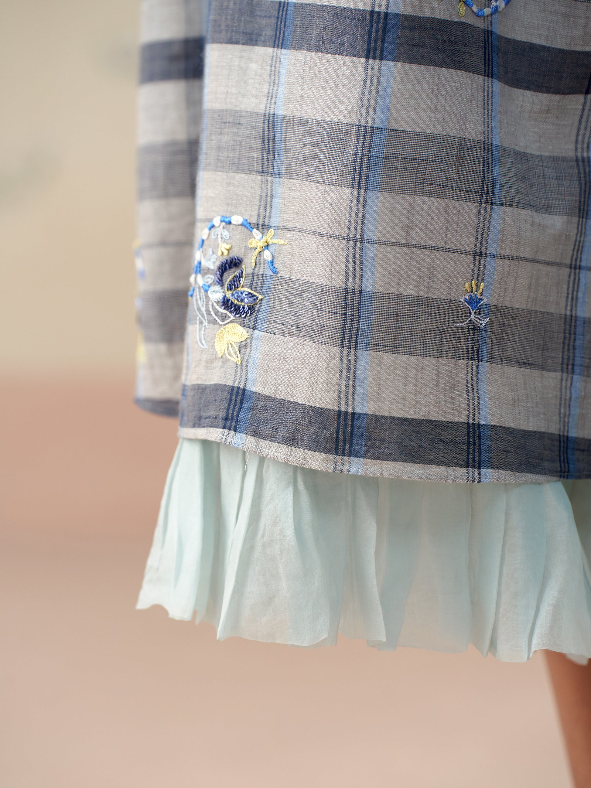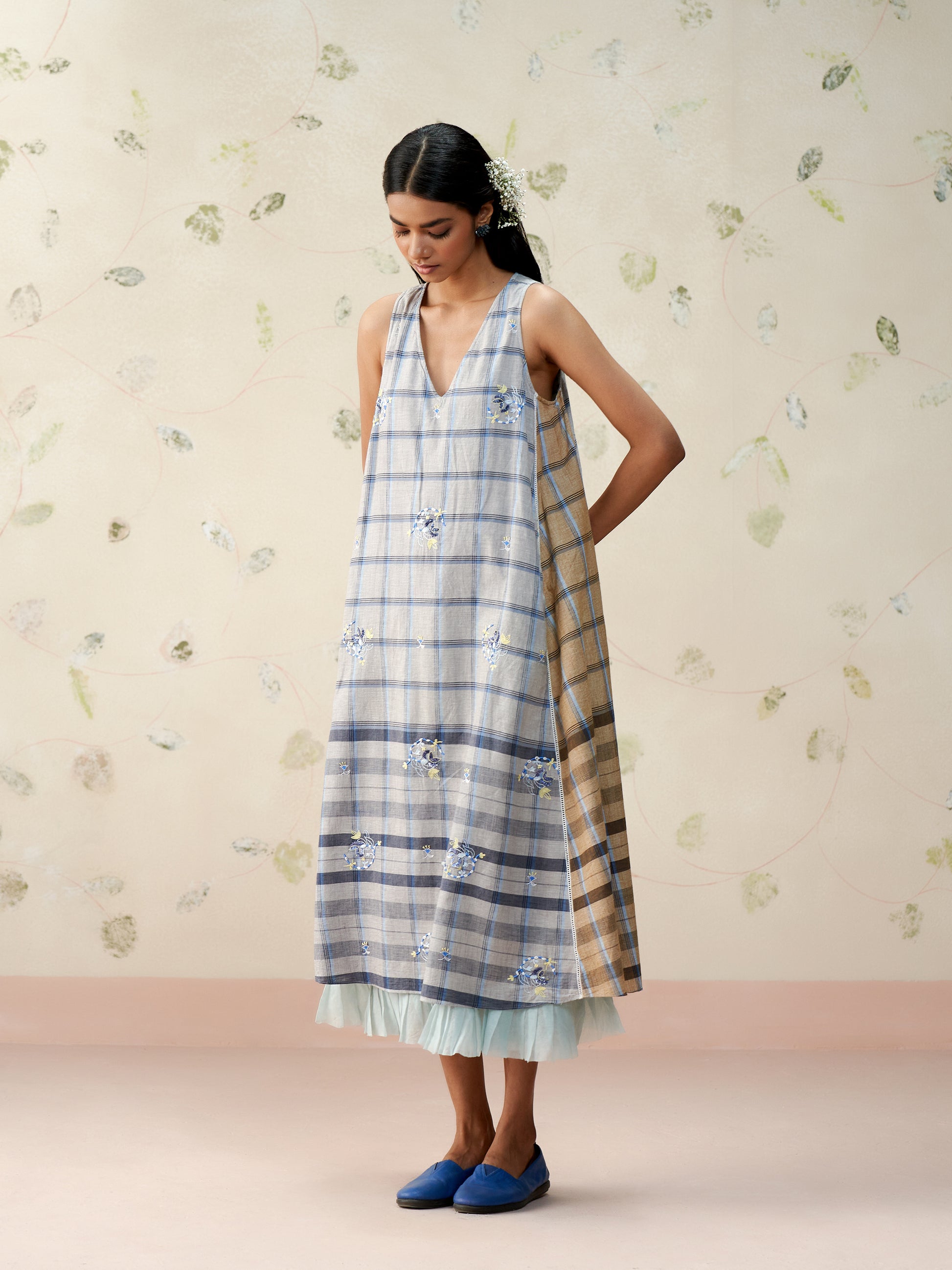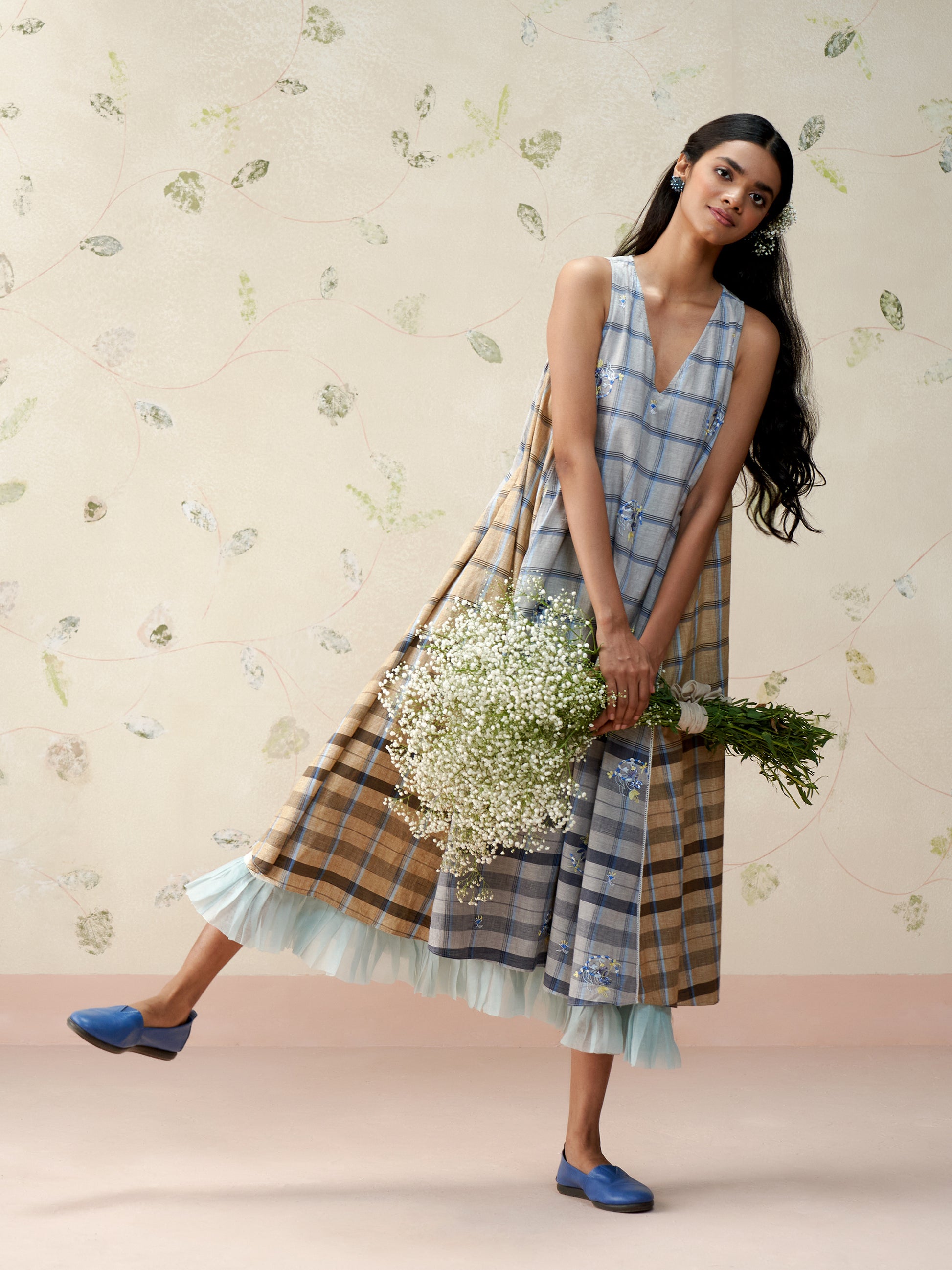 A breezy checked dress in 100% woven cotton, tailored for flow and comfort. Detailed with delicate hand-embroidered tulip motifs and soft lace inserts along the seams. An easy silhouette elevated by fine craftsmanship.