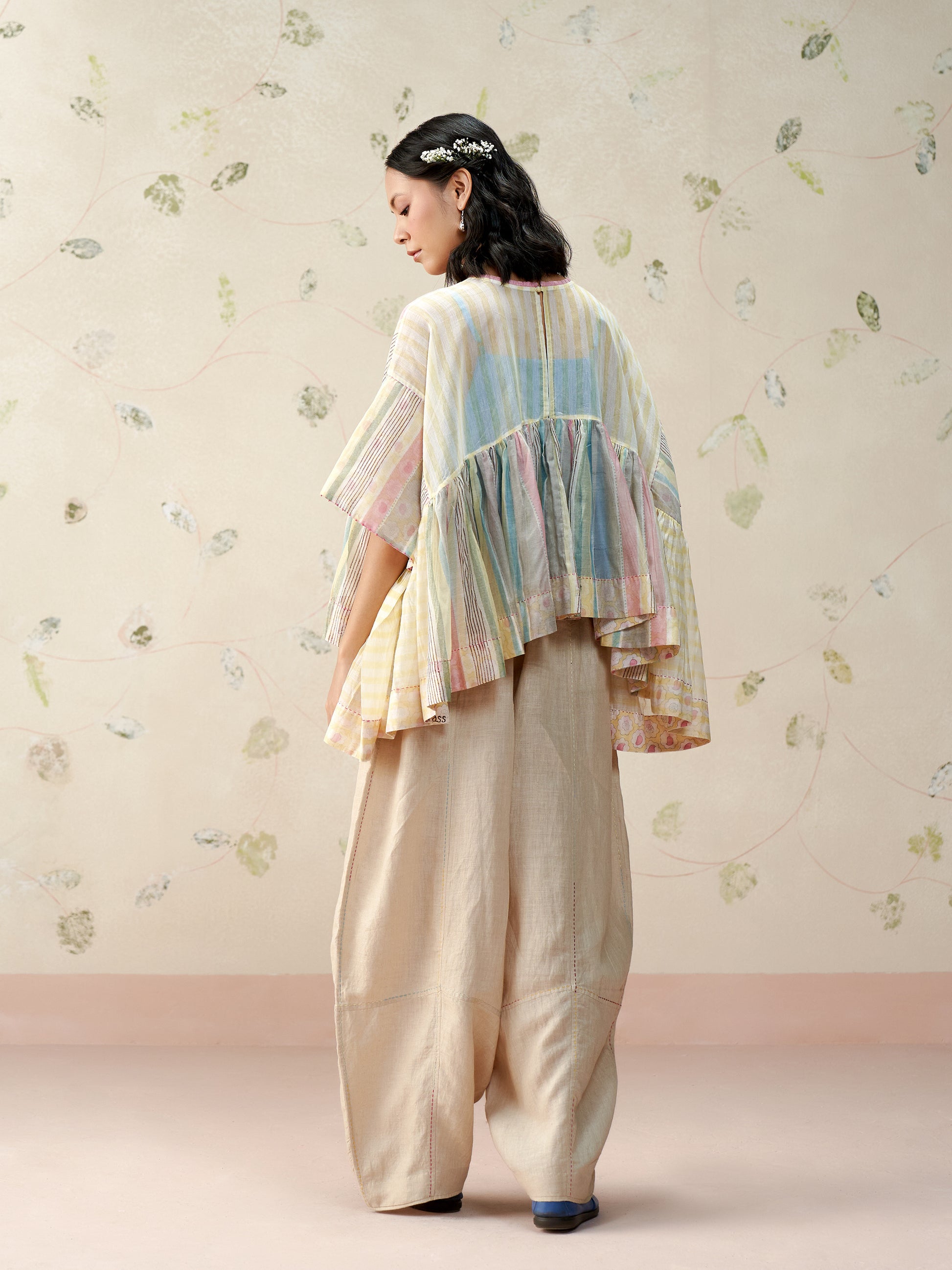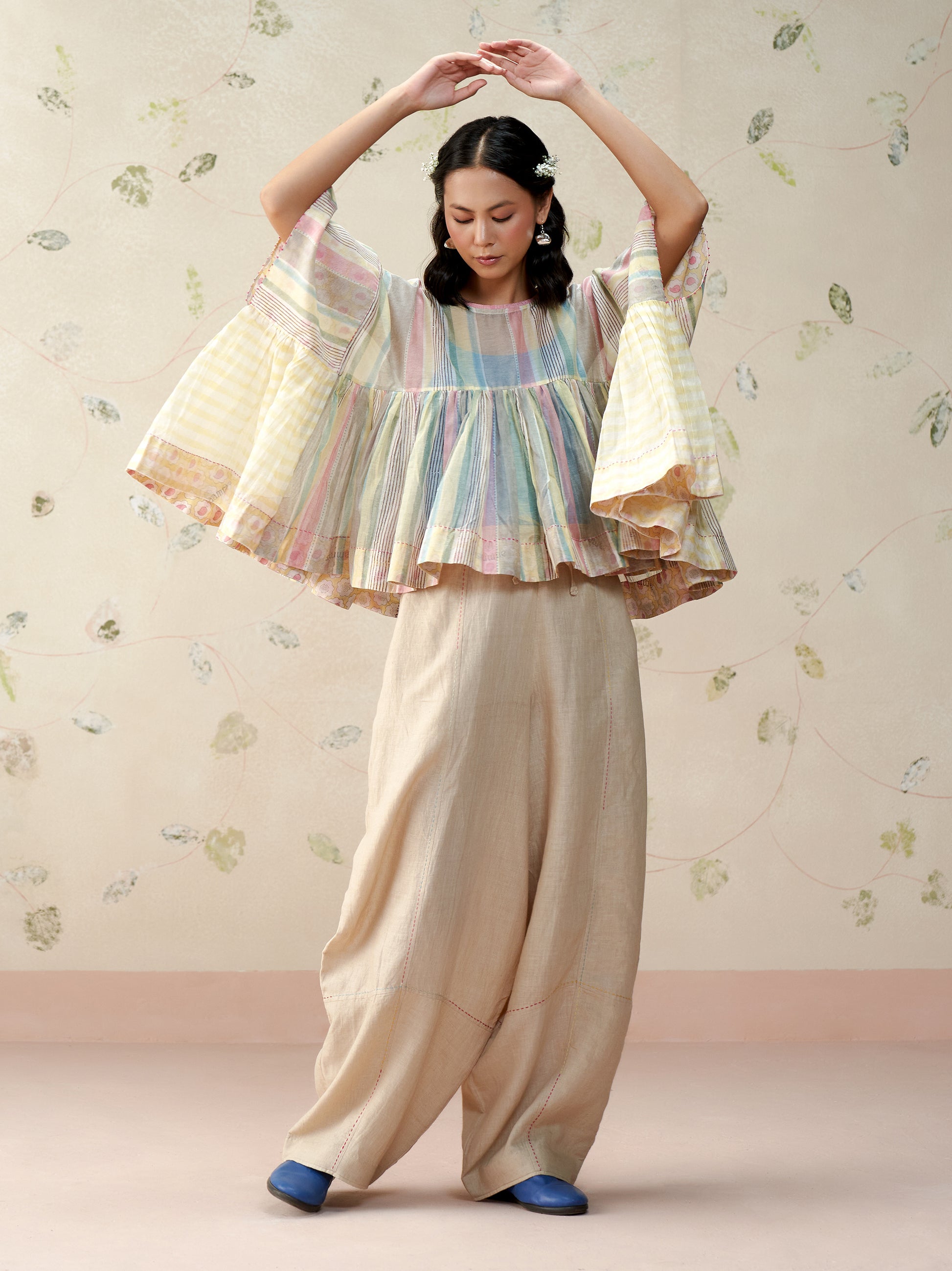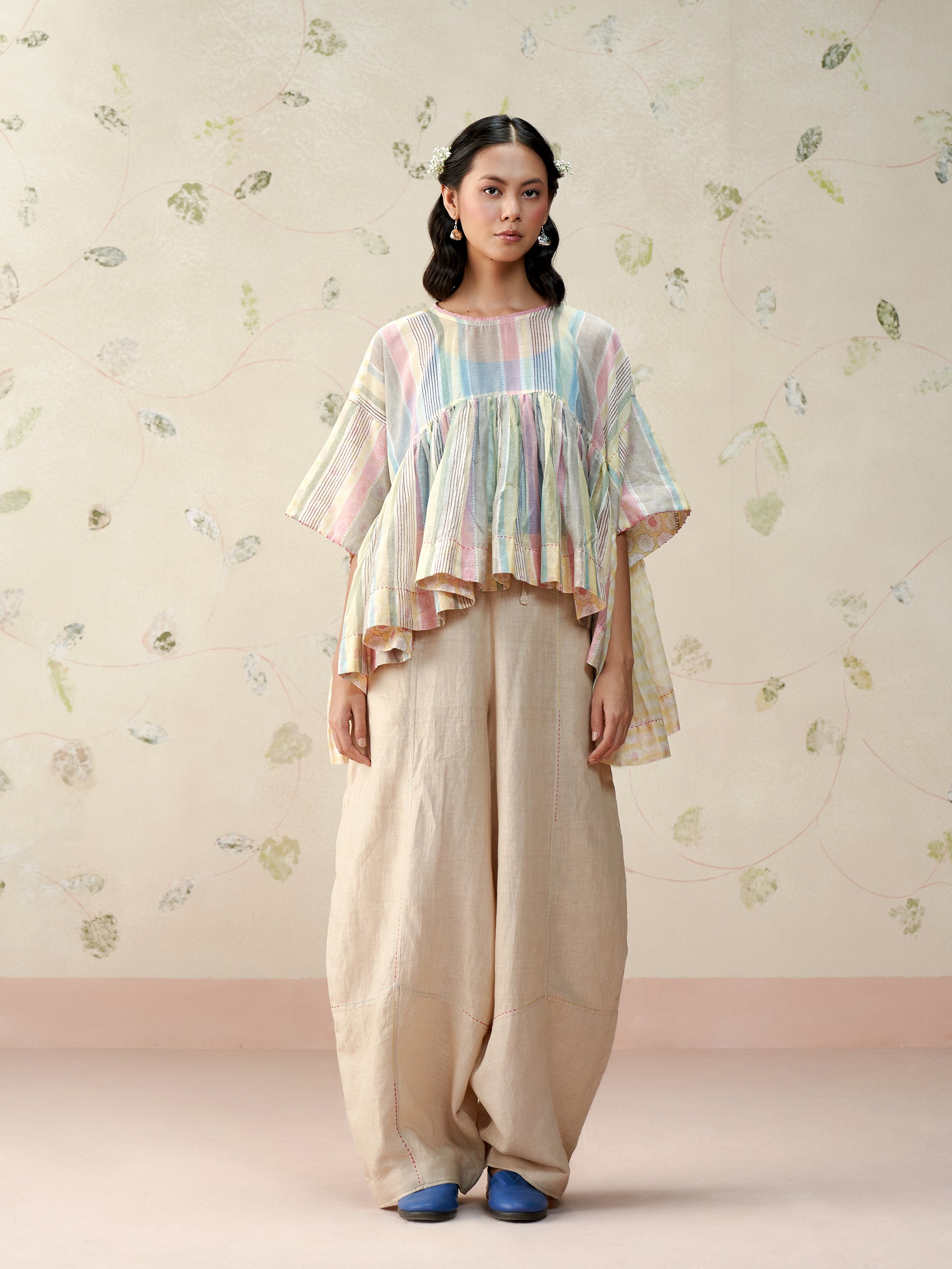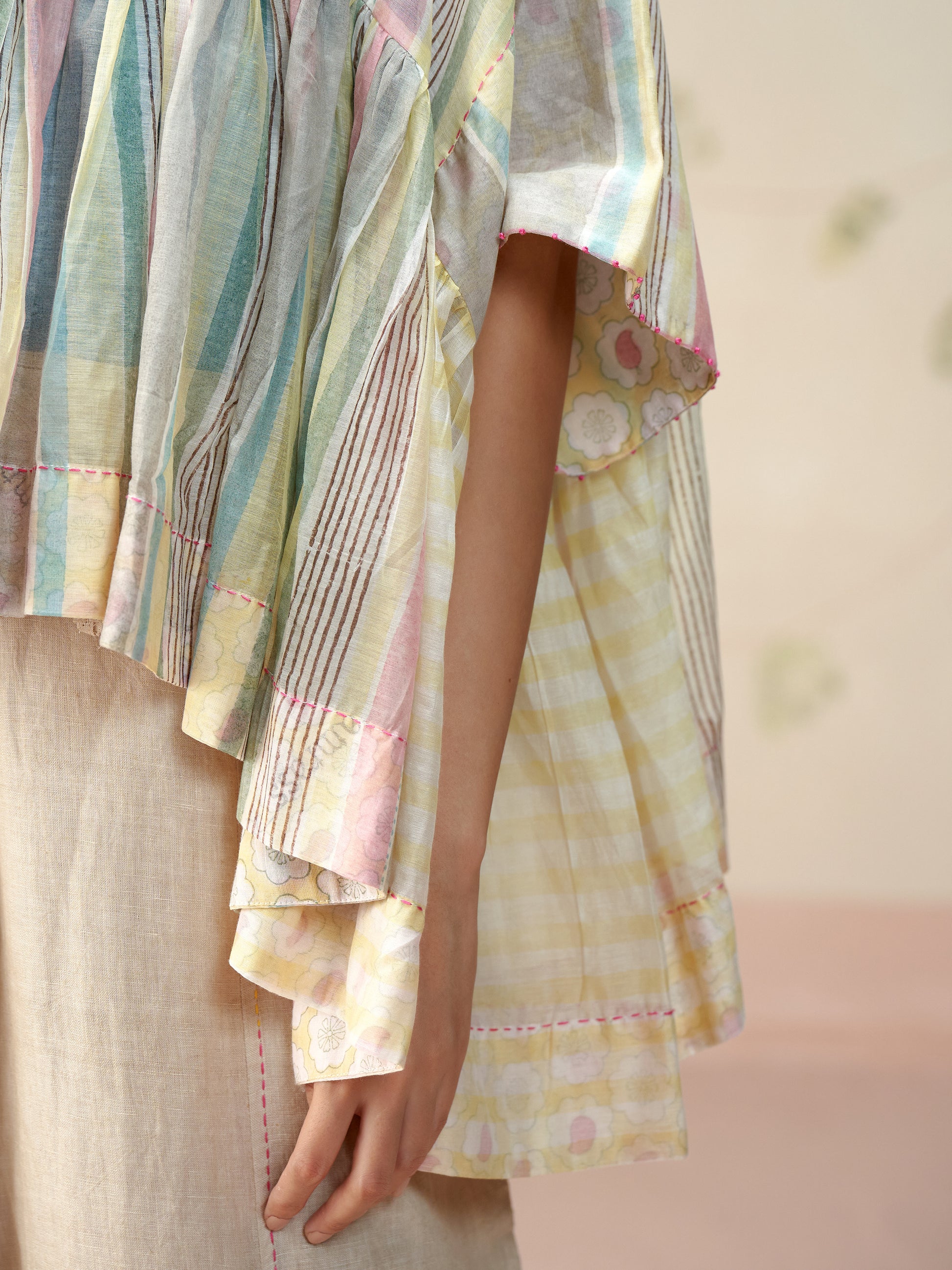 Handwoven in fine mul chanderi, this voluminous top features a soft, flowing silhouette brought to life with hand block printed stripes. Finished with contrast printed lining, hand-stitched trims, and artisanal detailing at the seams. A breezy, statement piece that blends comfort with craft.