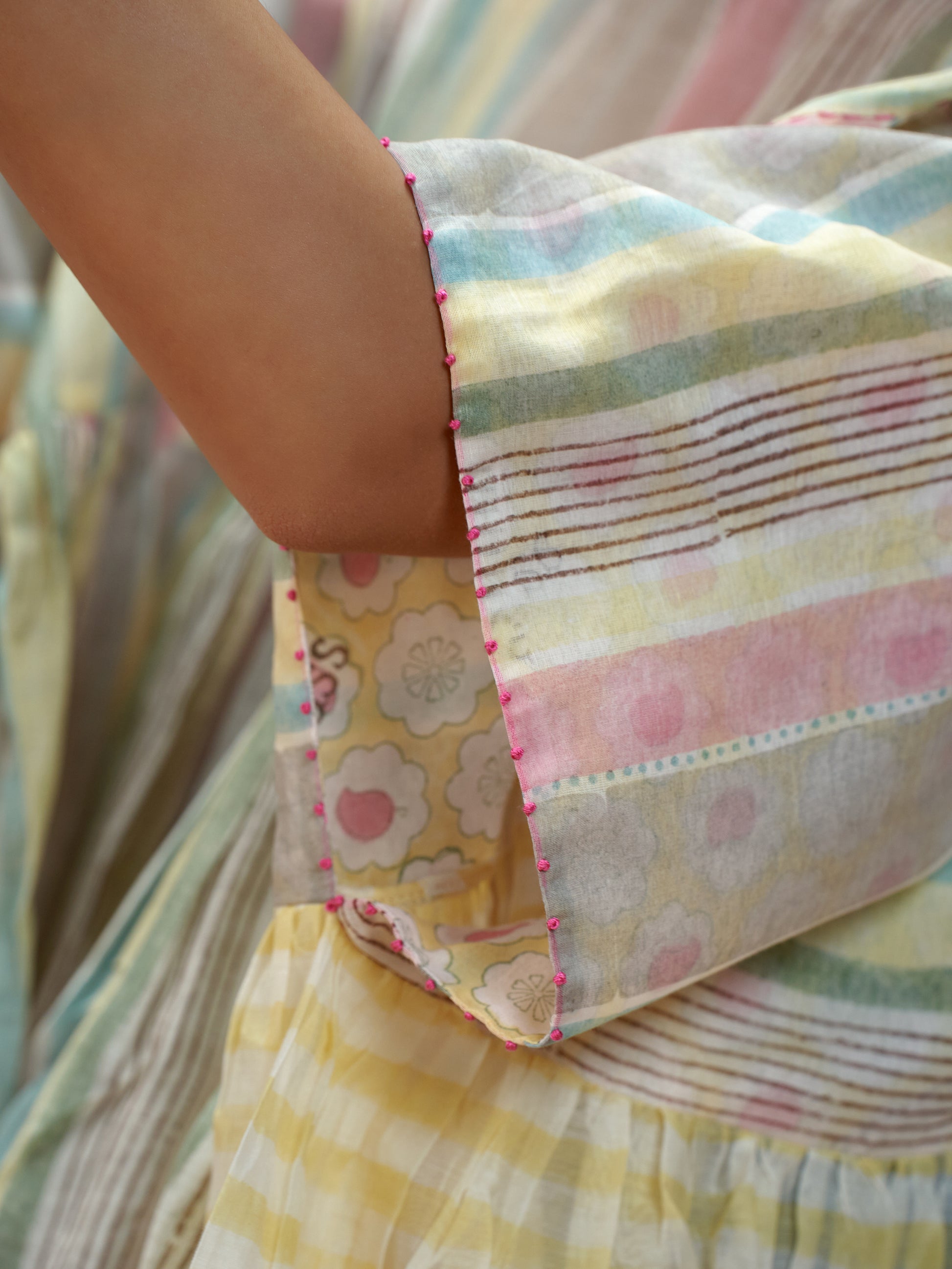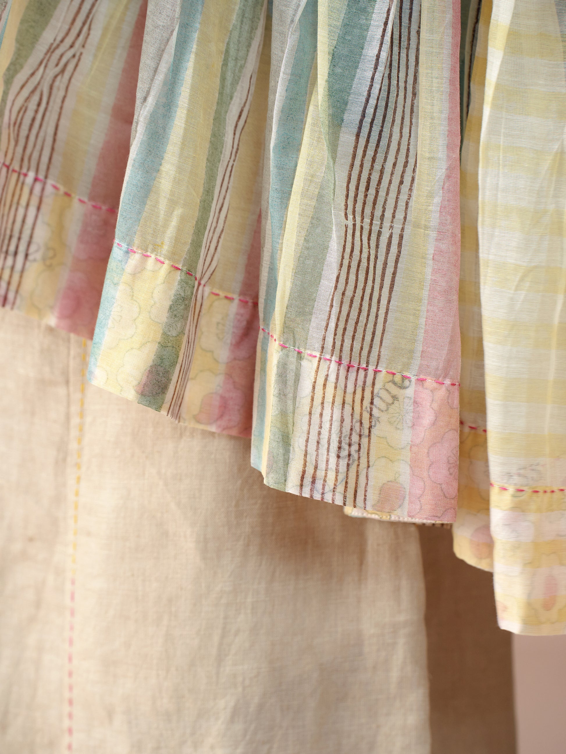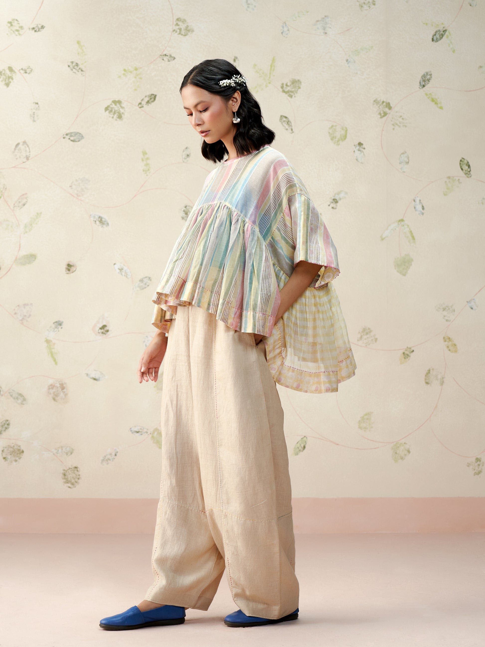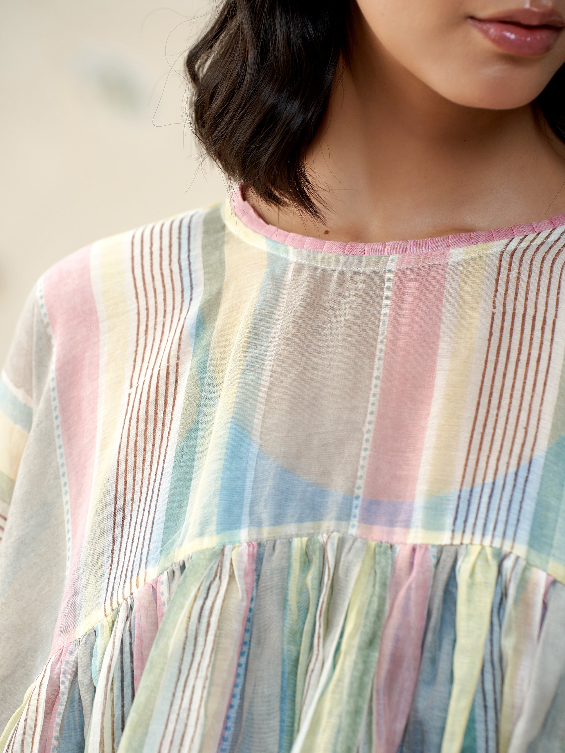 Handwoven in fine mul chanderi, this voluminous top features a soft, flowing silhouette brought to life with hand block printed stripes. Finished with contrast printed lining, hand-stitched trims, and artisanal detailing at the seams. A breezy, statement piece that blends comfort with craft.