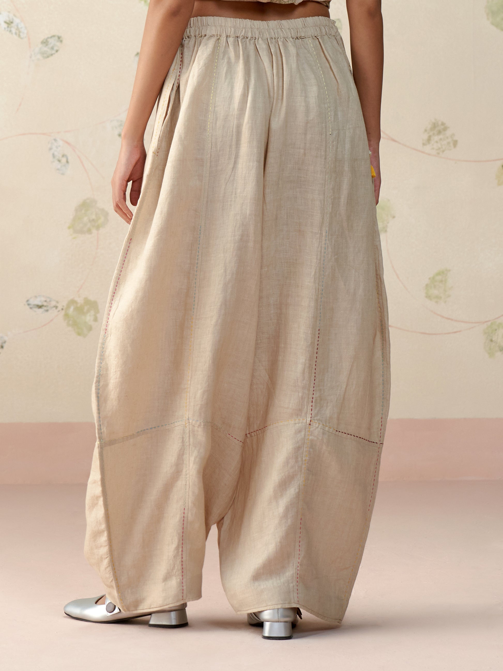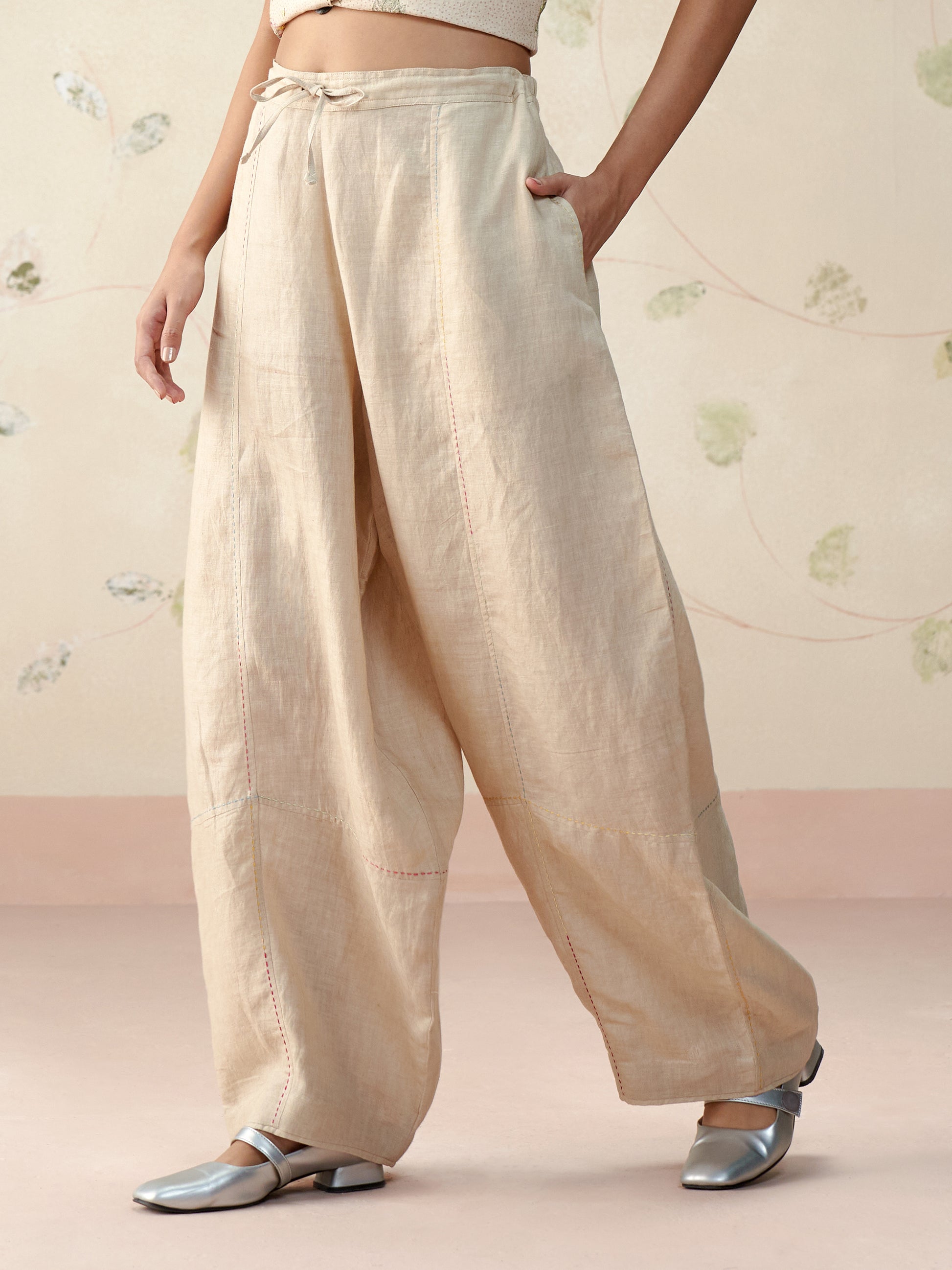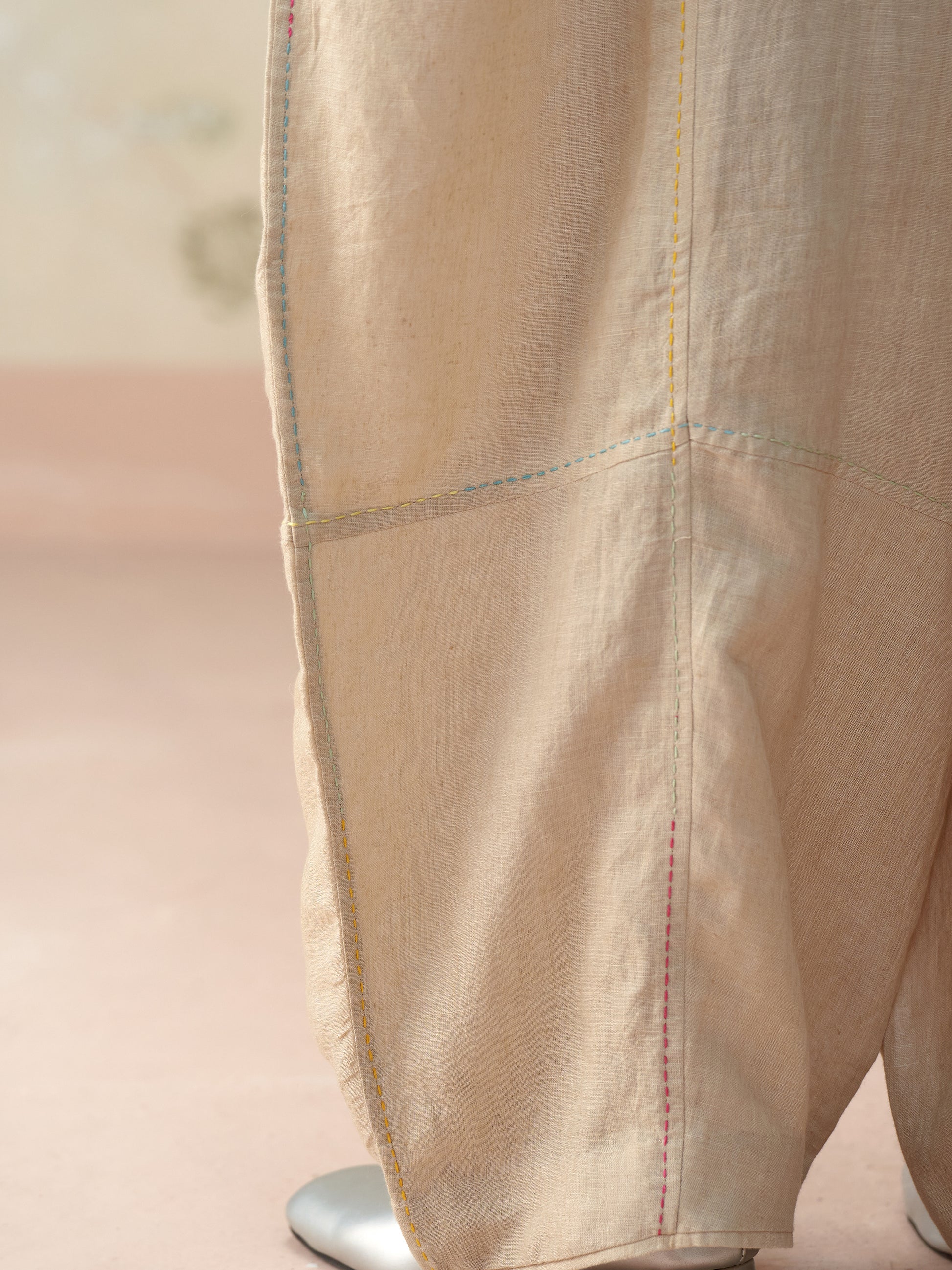 Barrel-shaped pants in 100% pure linen, designed for ease and structure. Highlighted with fine hand-embroidered kantha detailing and soft contrast threadwork along the seams.