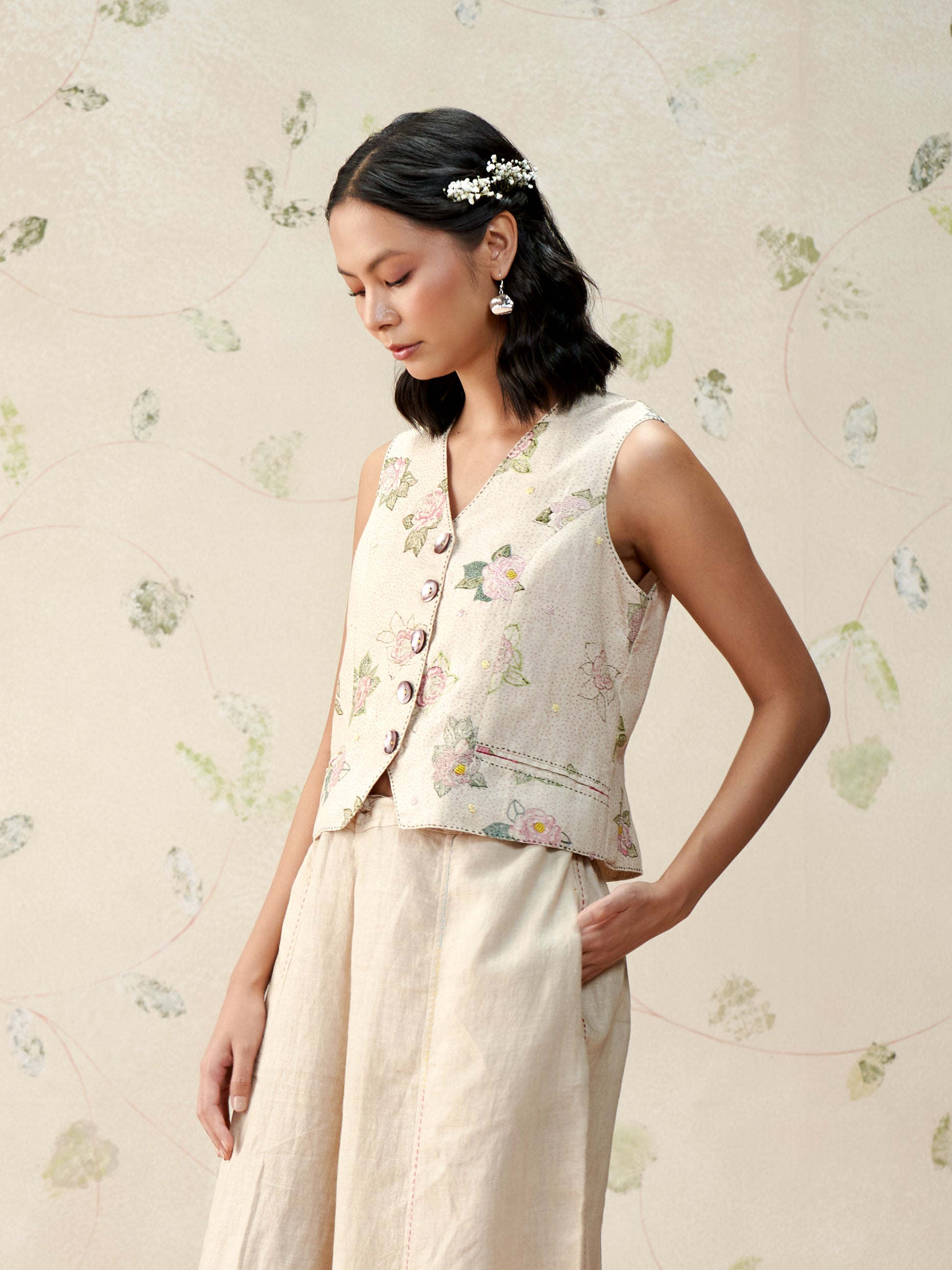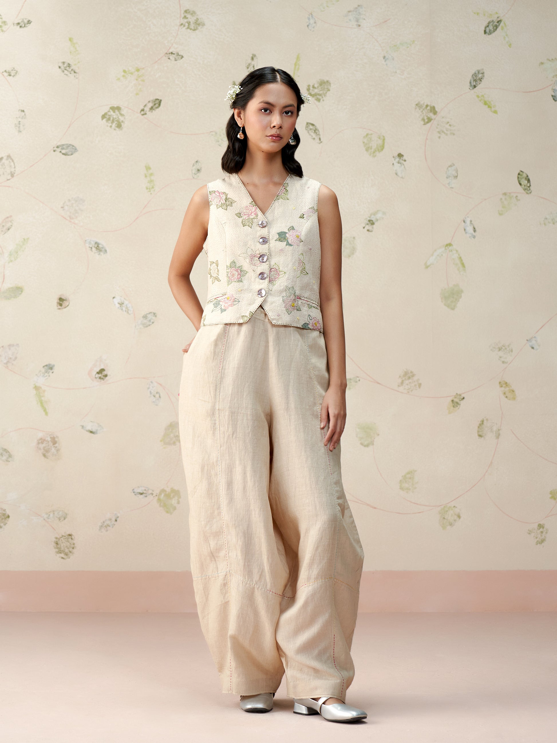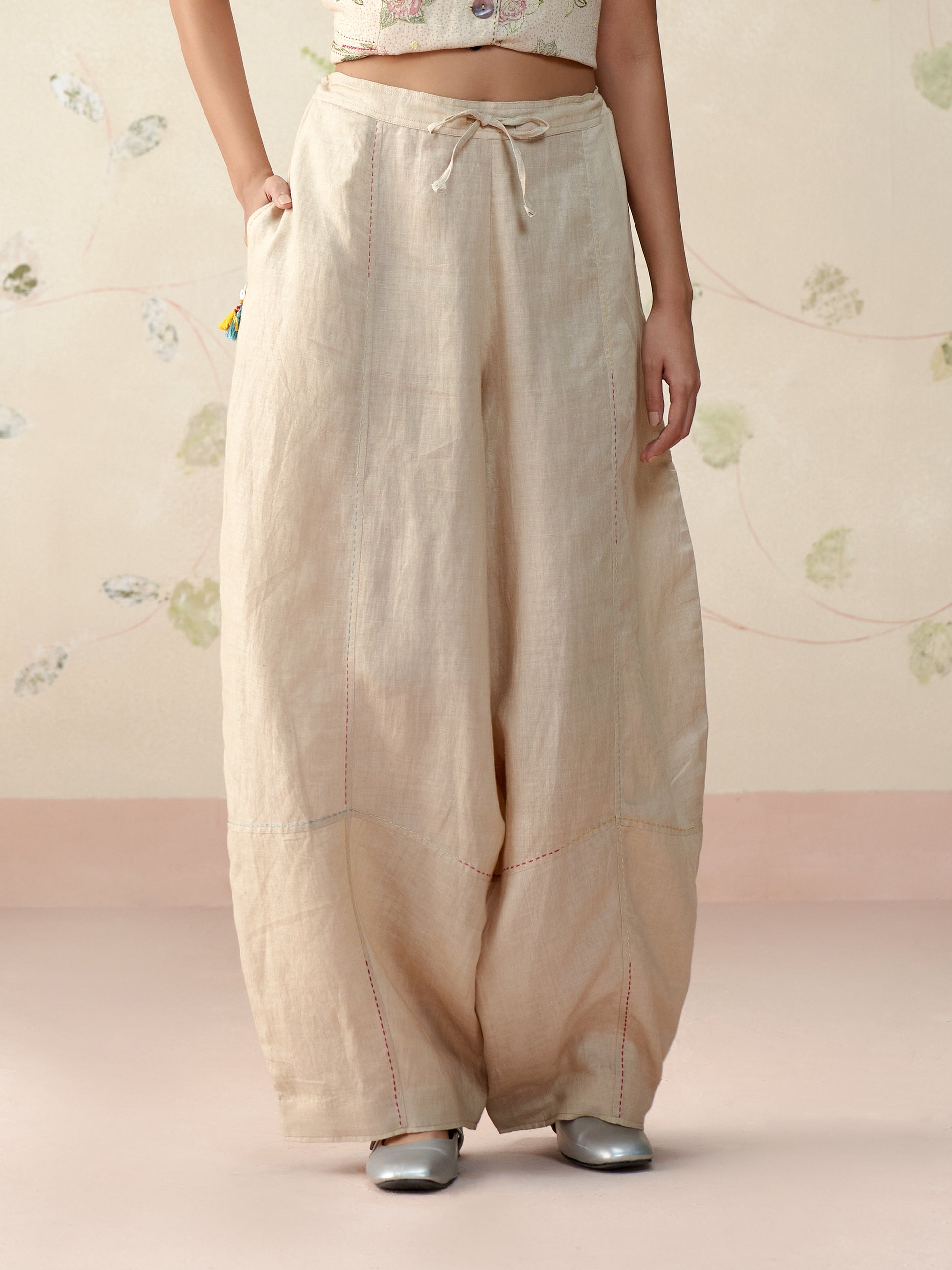 Barrel-shaped pants in 100% pure linen, designed for ease and structure. Highlighted with fine hand-embroidered kantha detailing and soft contrast threadwork along the seams.