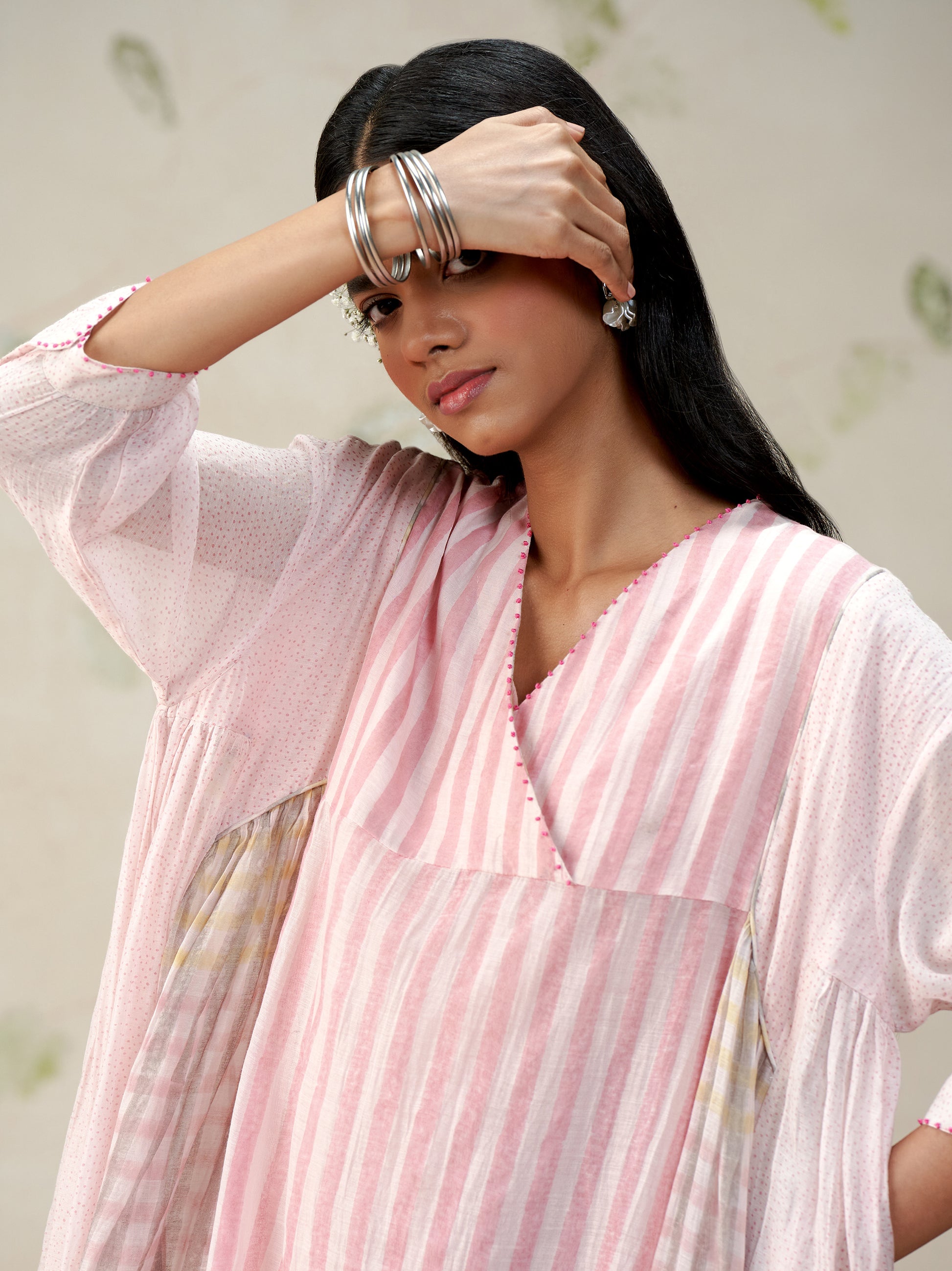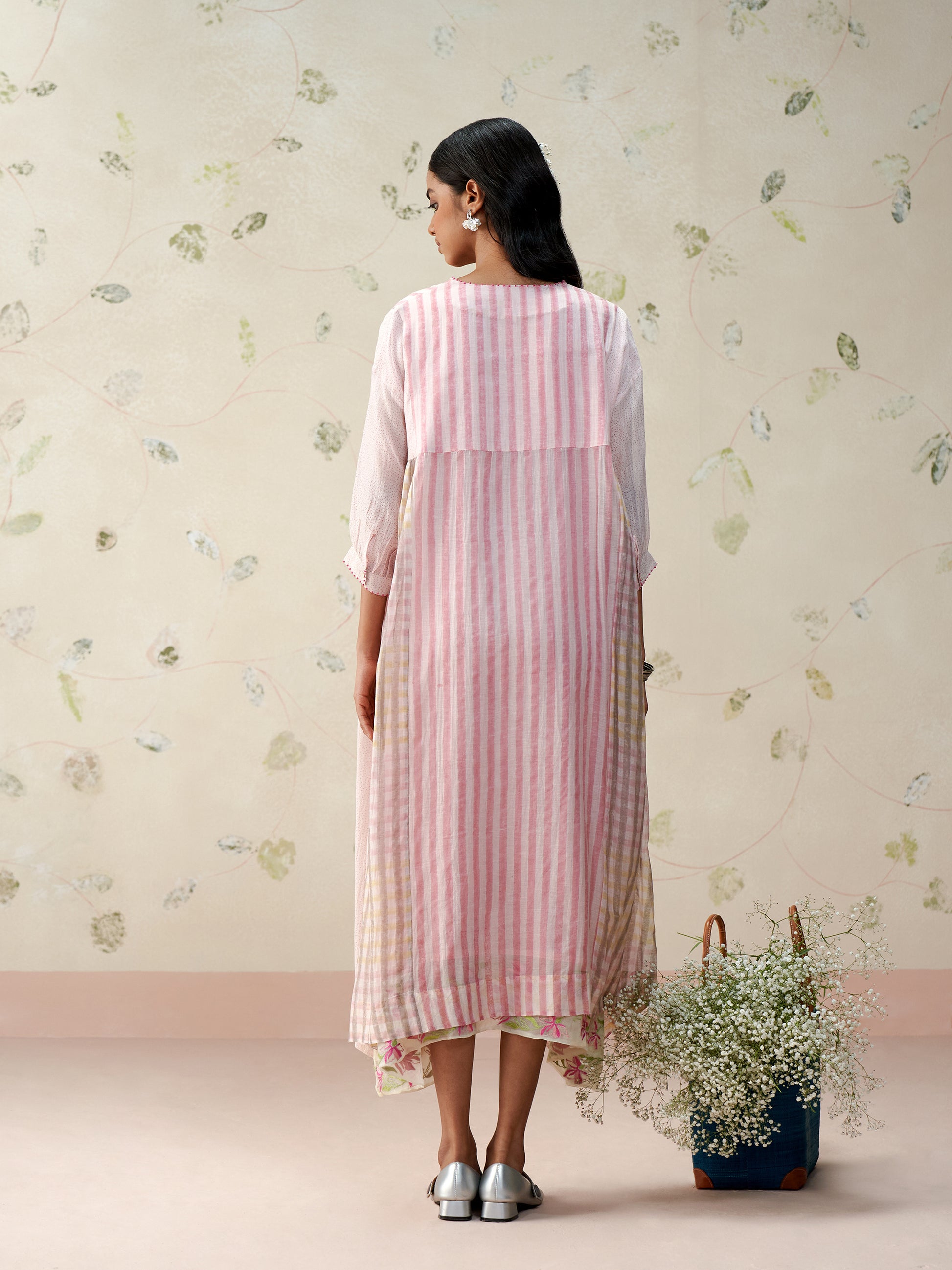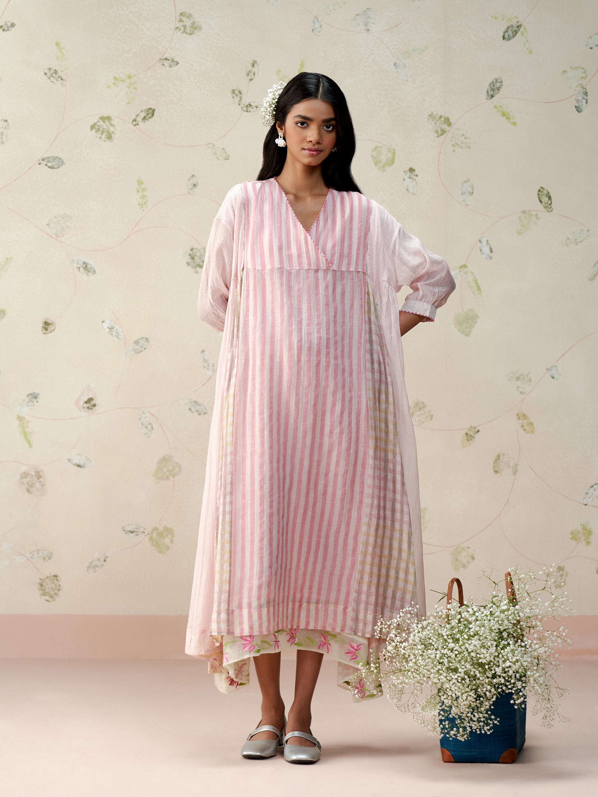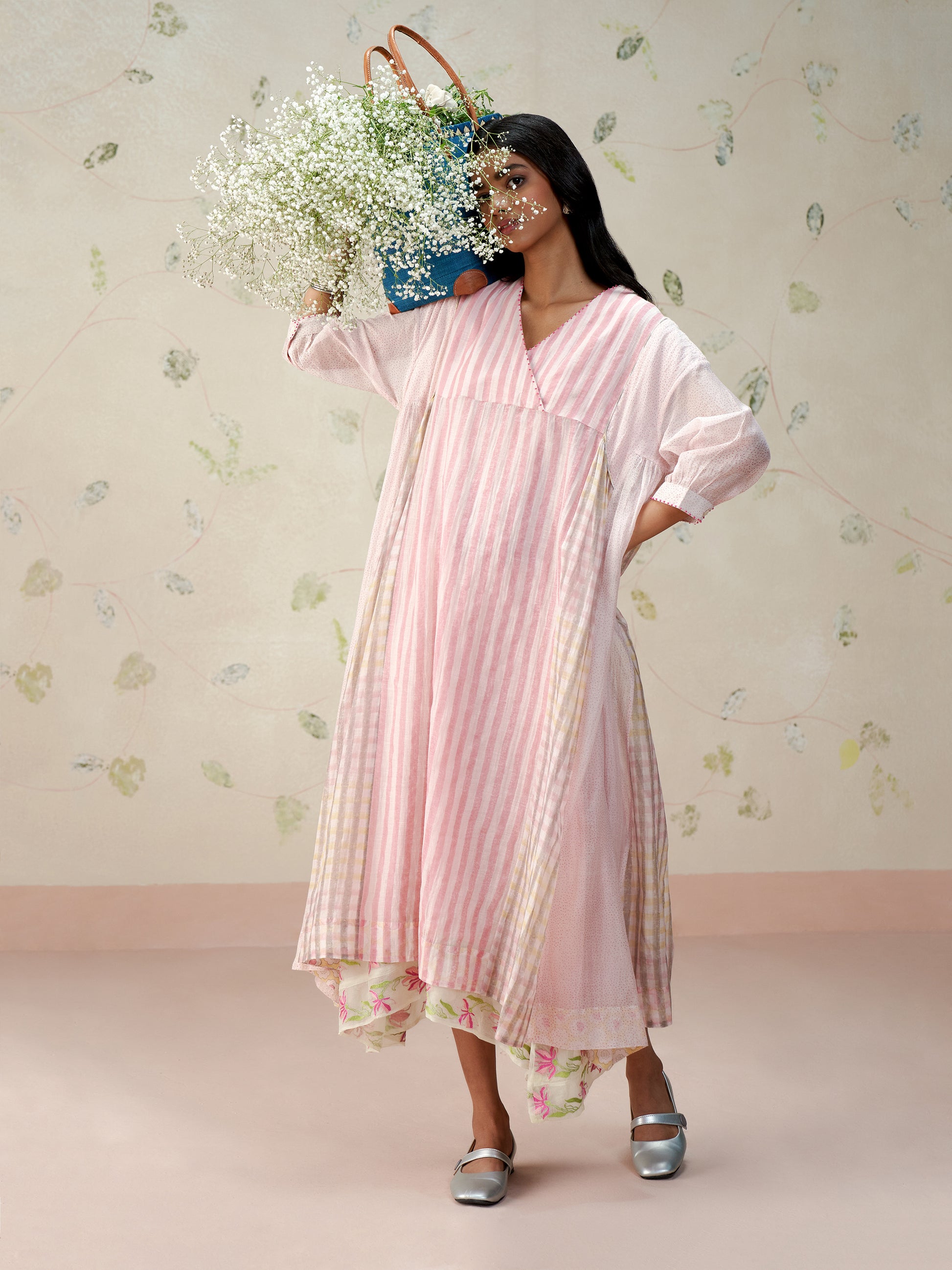 Flowy loose fitting handblock printed dress in handwoven mul chanderi with panelleing details paired with seperate cotton lining with embroidered organza details at the hem.